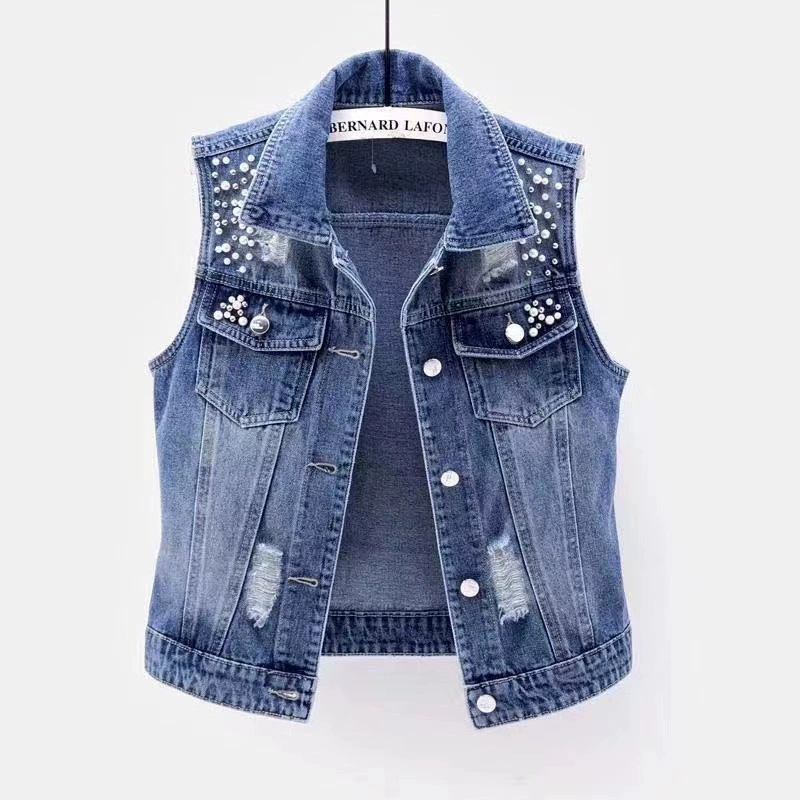 [재고] 2025 데님 양복 조끼 여성용 쇼트 워시 워터 홀 네일 비드 민소매 재킷 조커 슬림 핏 탑 조수