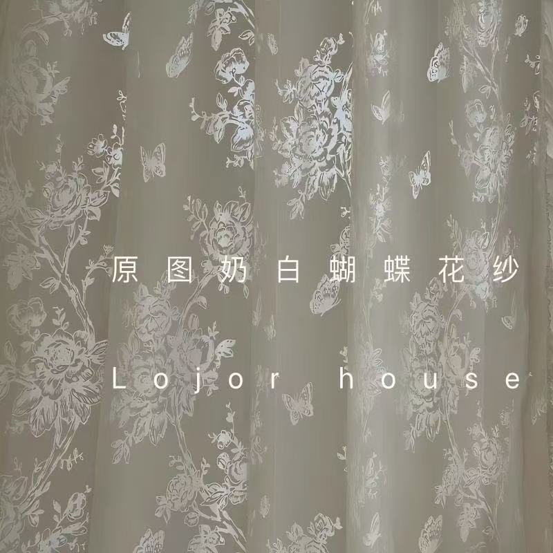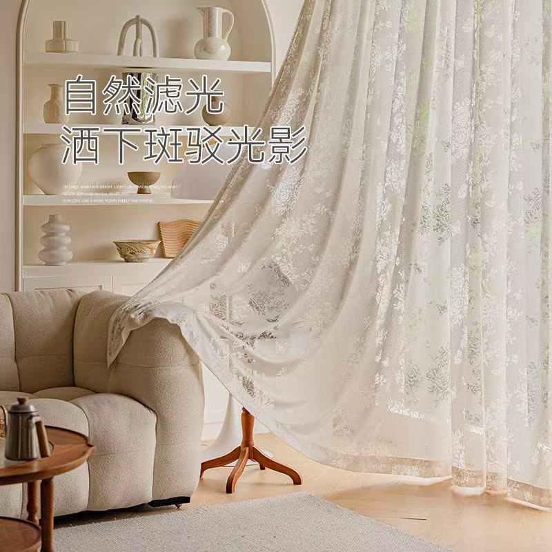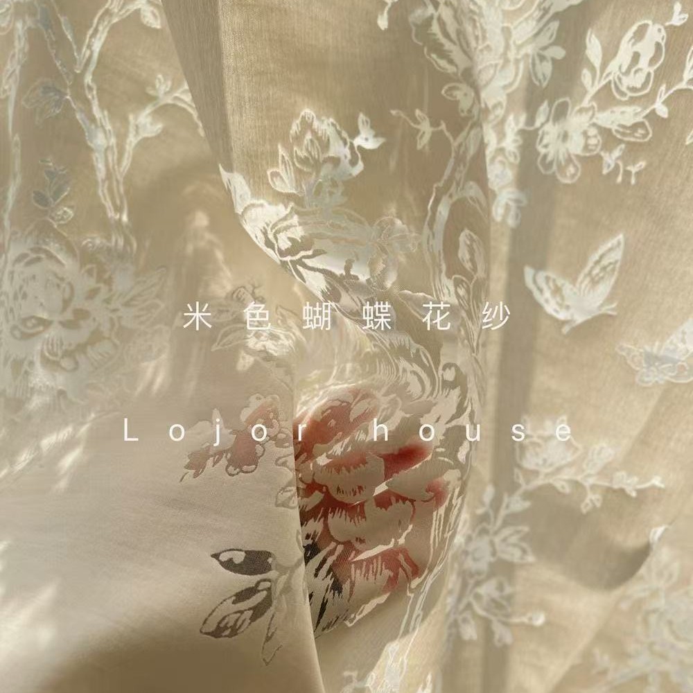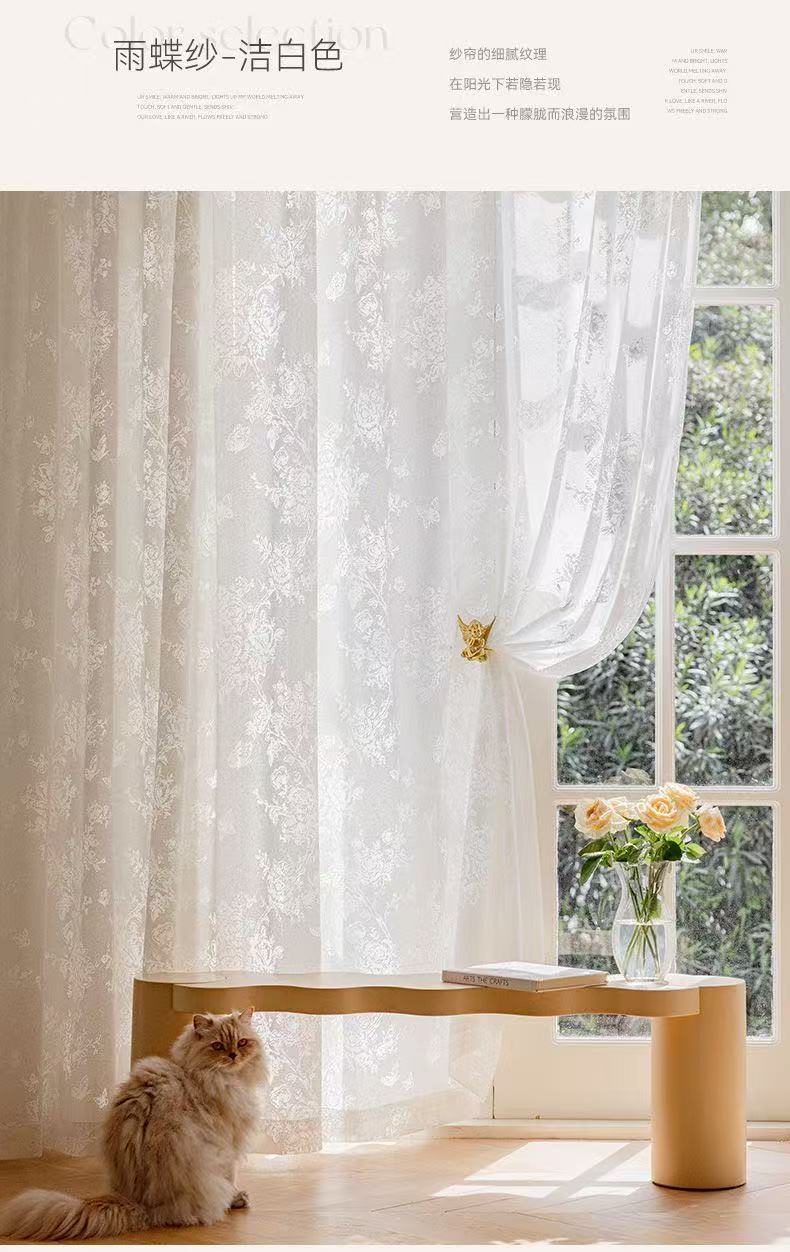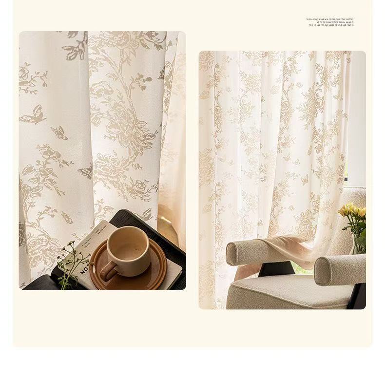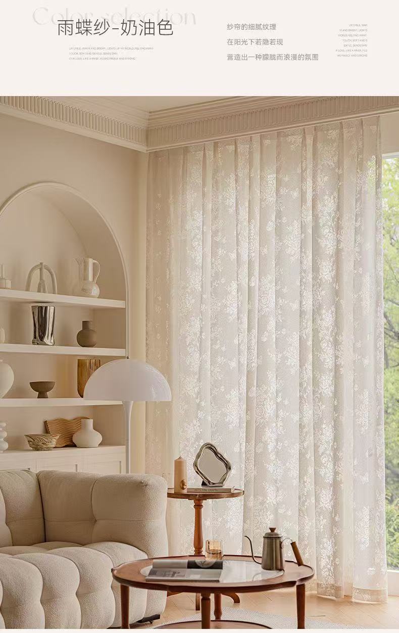 프렌치 로즈 나비 모양 거즈 커튼, 레이스 자카드, 자외선 차단 및 단열, 크림색, 투명 창문 커튼, 불투명스토어 가기