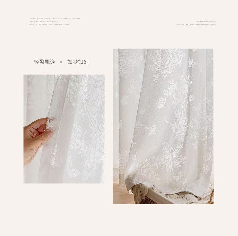 프렌치 로즈 나비 모양 거즈 커튼, 레이스 자카드, 자외선 차단 및 단열, 크림색, 투명 창문 커튼, 불투명