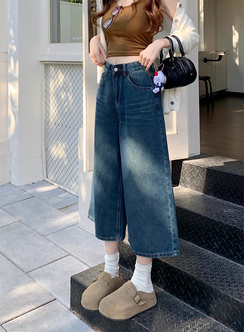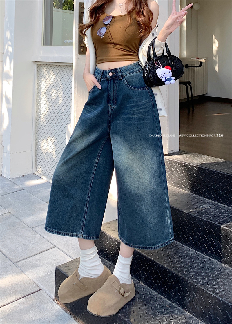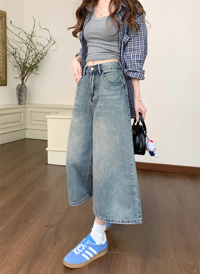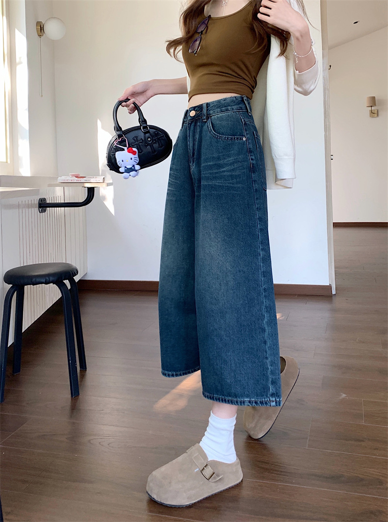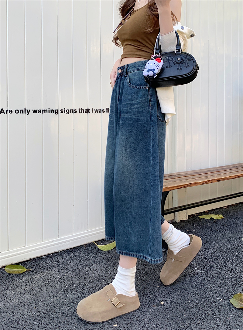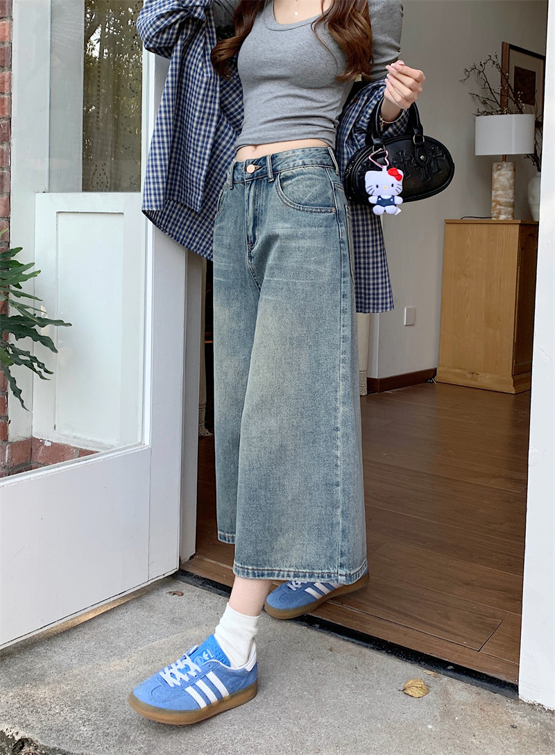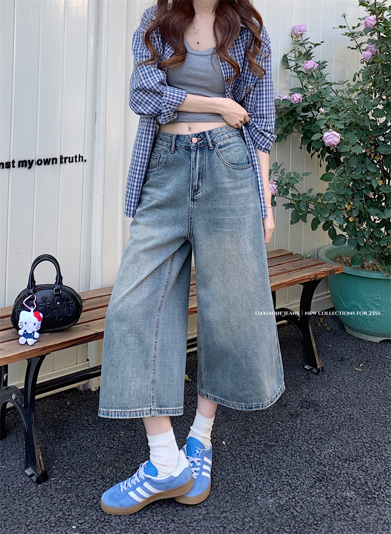리얼 샷 2025 봄 새로운 여성 복고풍 하이 웨이스트 스트레이트 튜브 느슨한 데님 8 포인트 와이드 레그 팬츠 여성스토어 가기