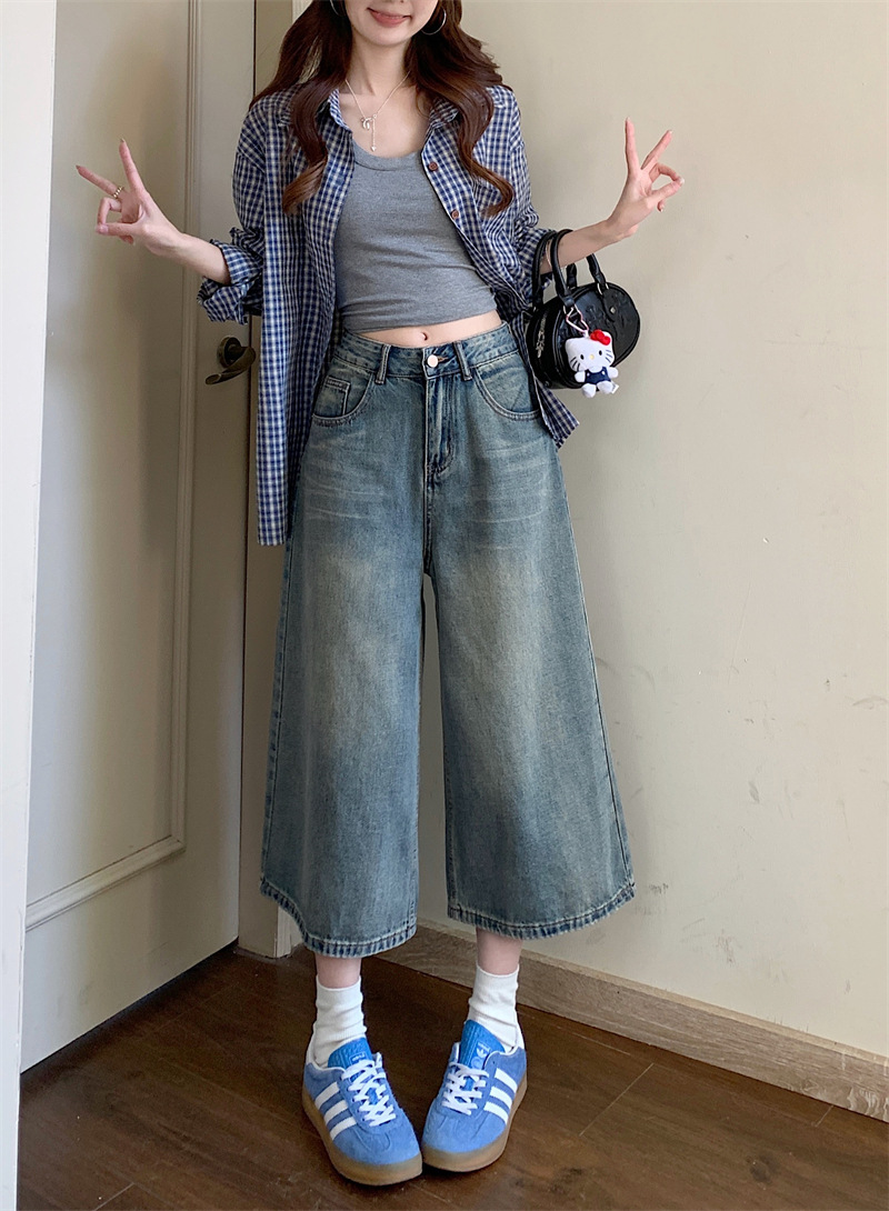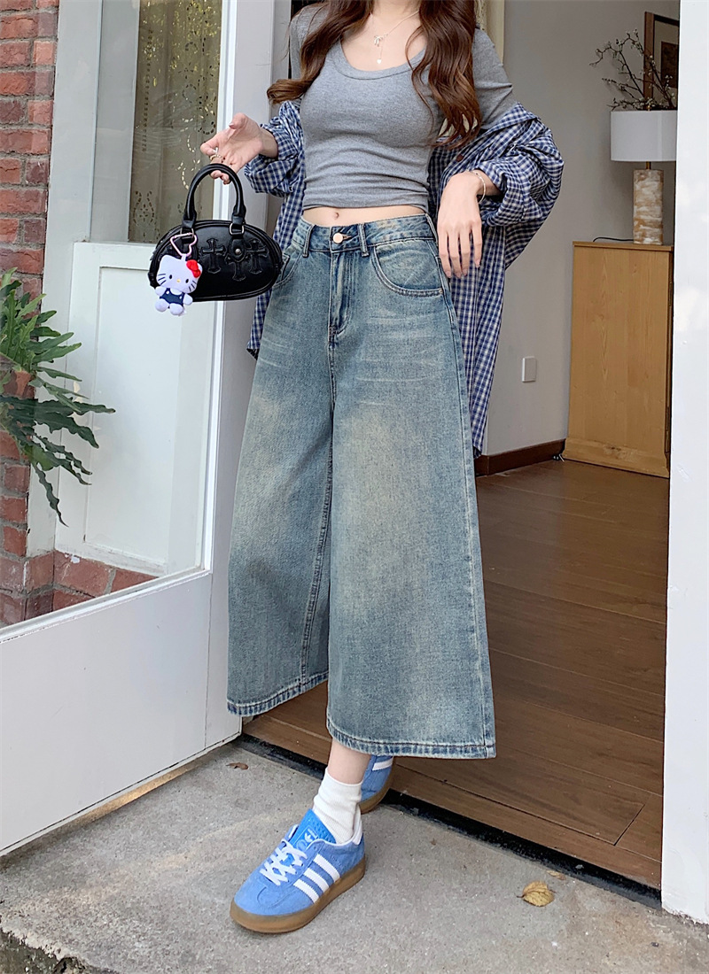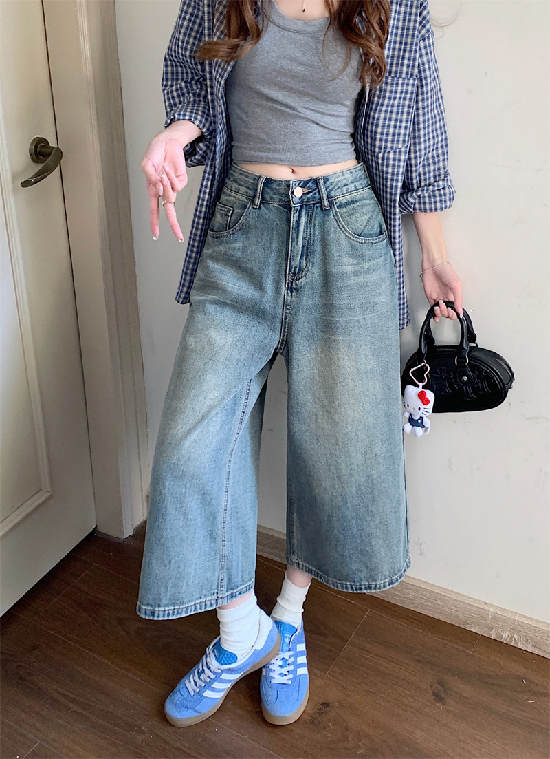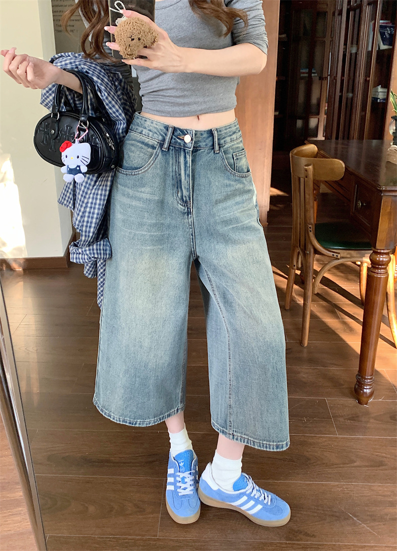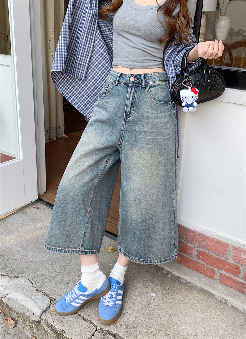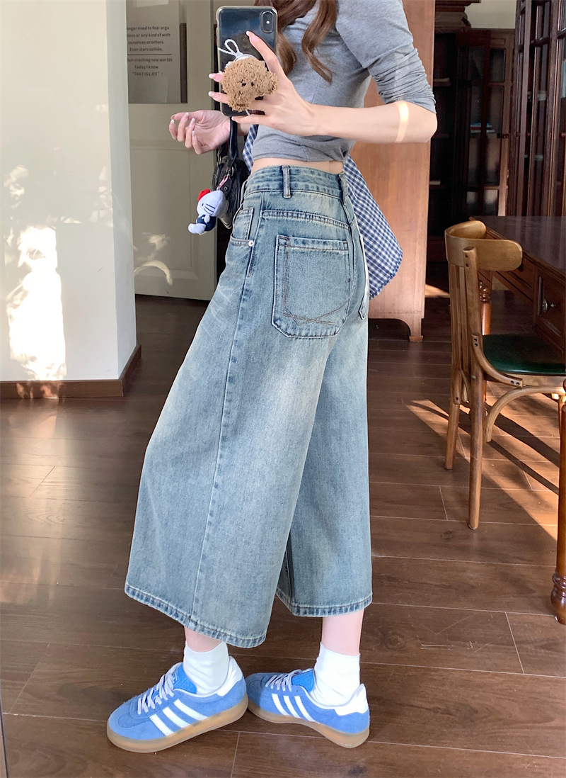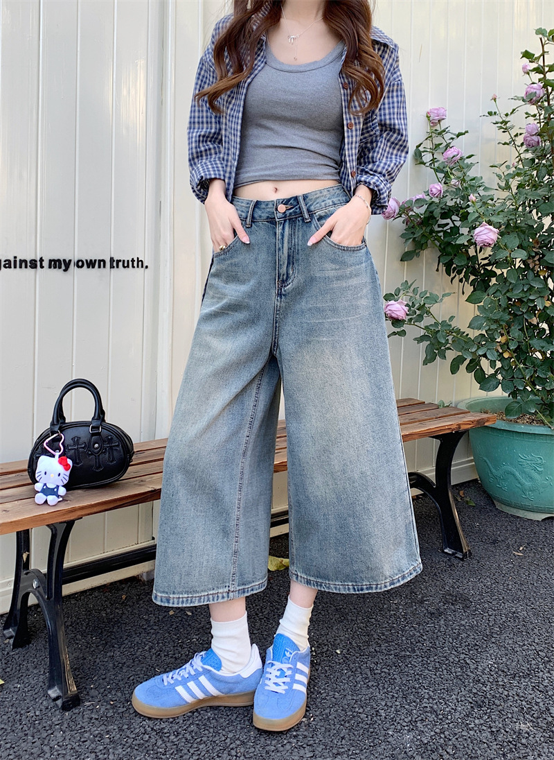 리얼 샷 2025 봄 새로운 여성 복고풍 하이 웨이스트 스트레이트 튜브 느슨한 데님 8 포인트 와이드 레그 팬츠 여성스토어 가기