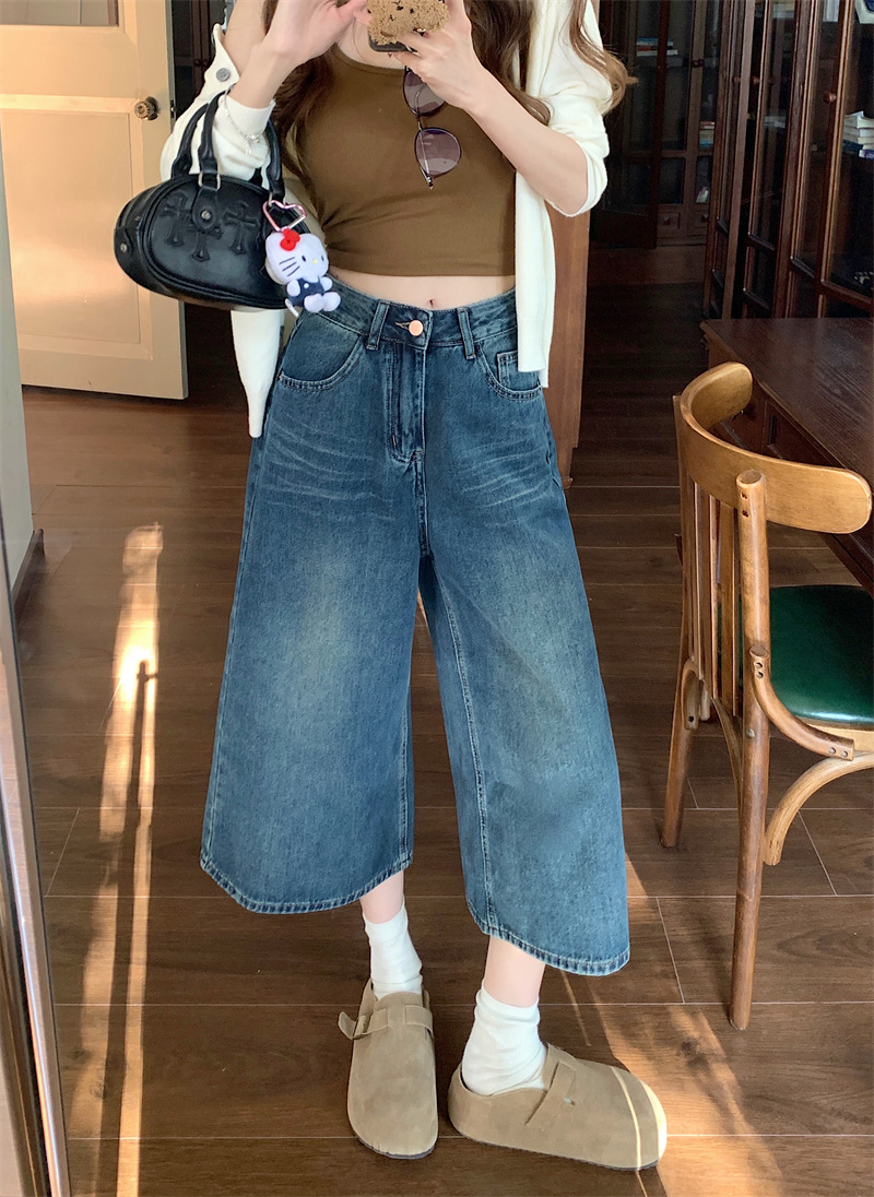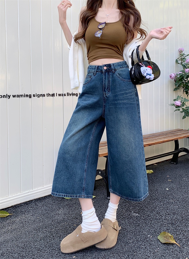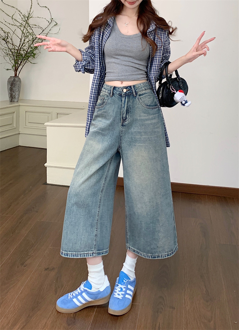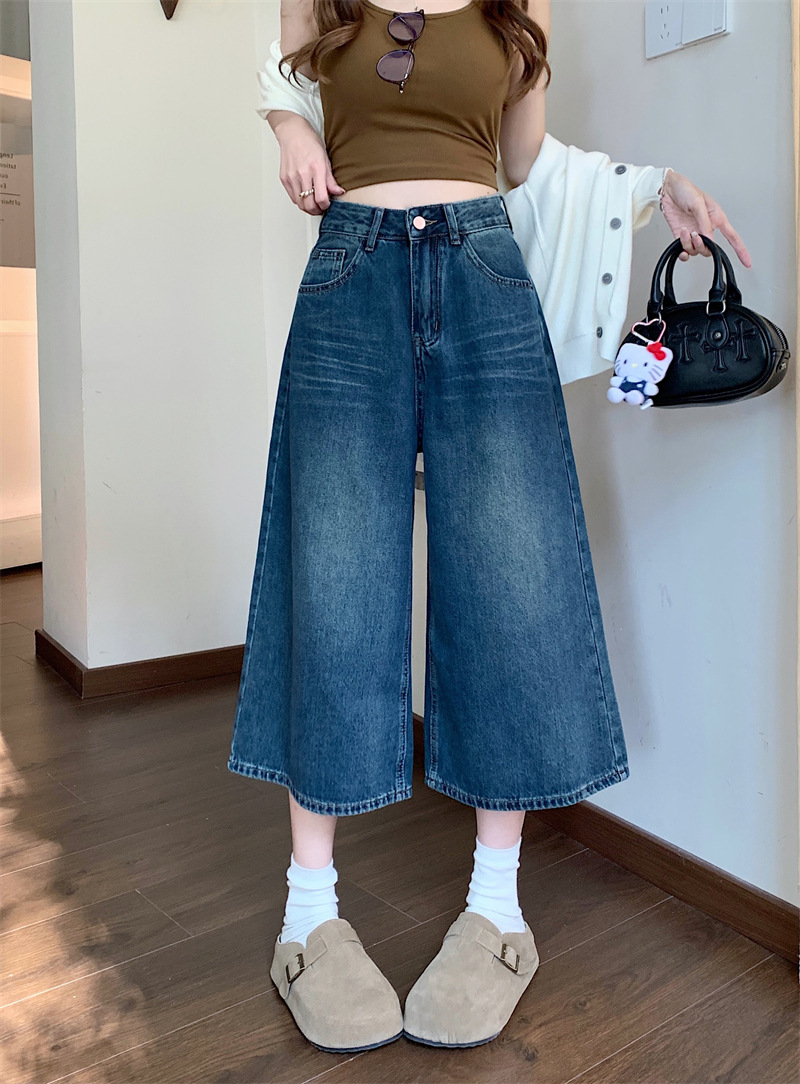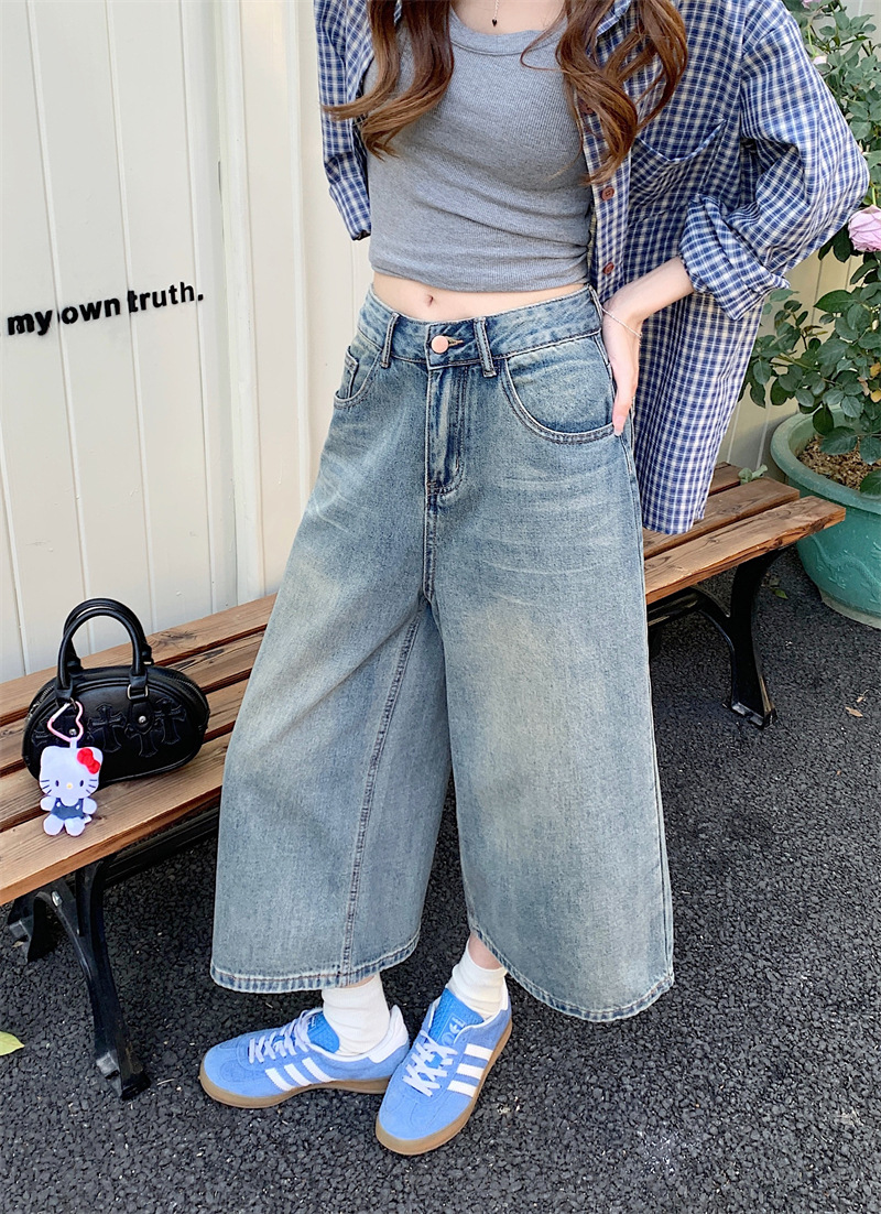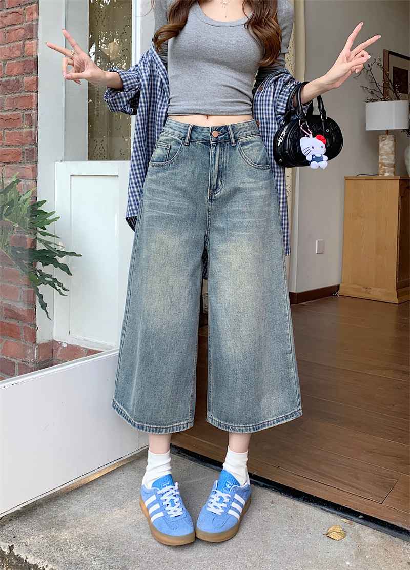 리얼 샷 2025 봄 새로운 여성 복고풍 하이 웨이스트 스트레이트 튜브 느슨한 데님 8 포인트 와이드 레그 팬츠 여성스토어 가기