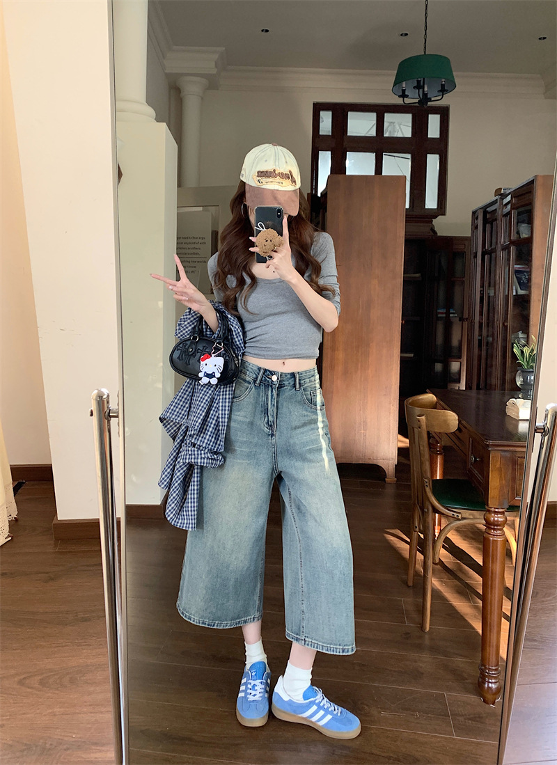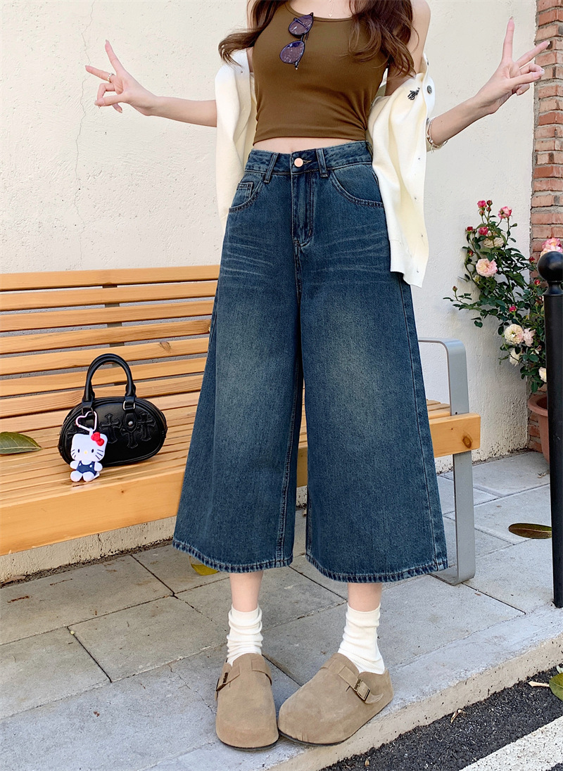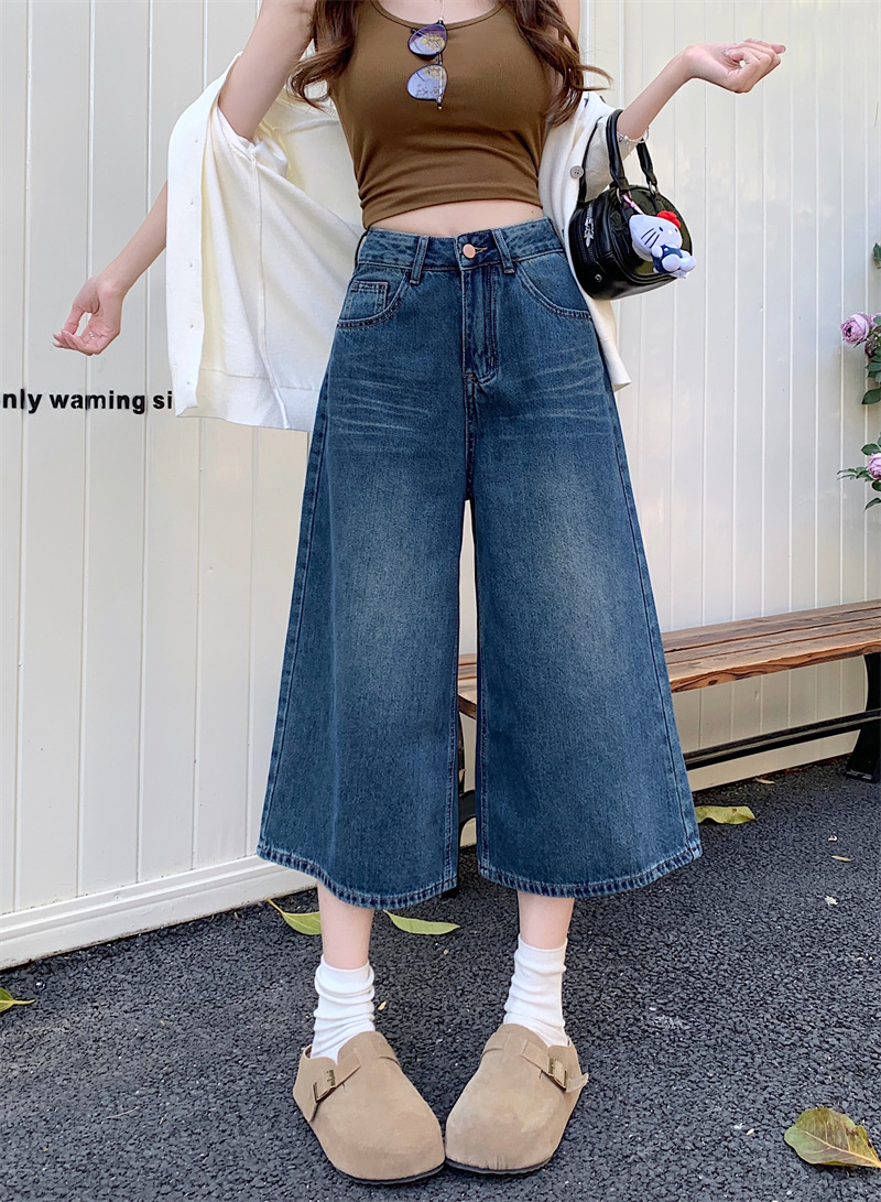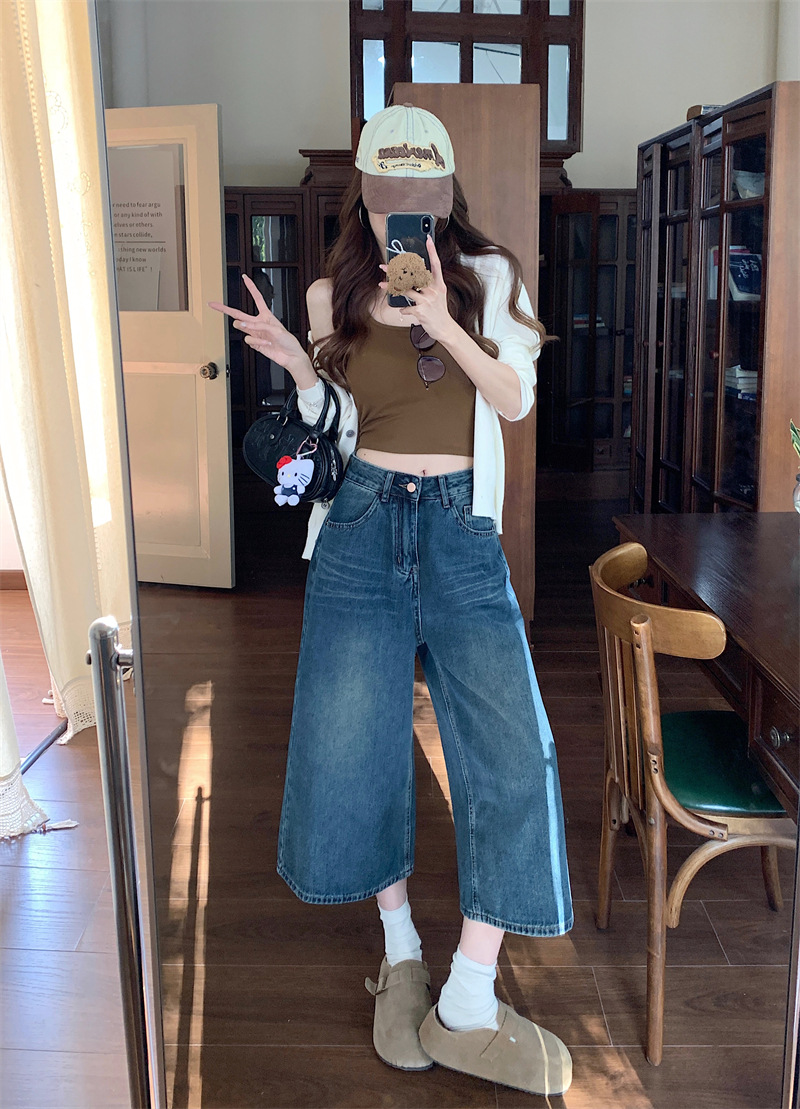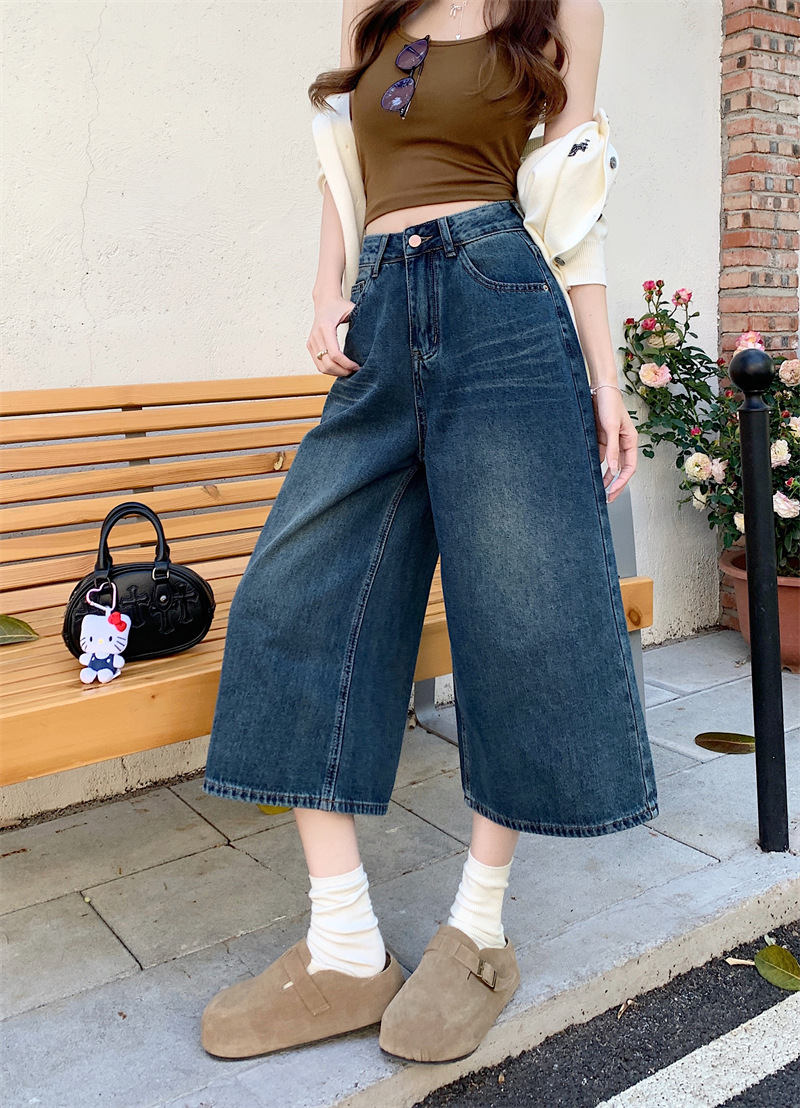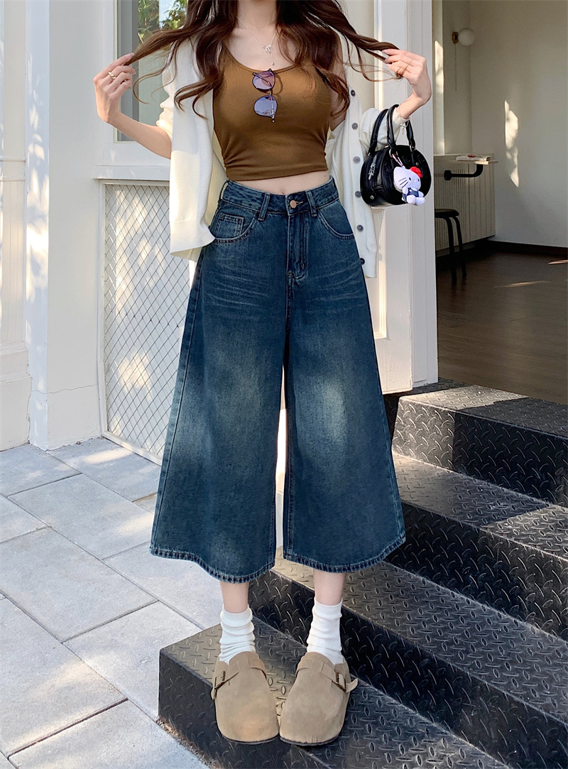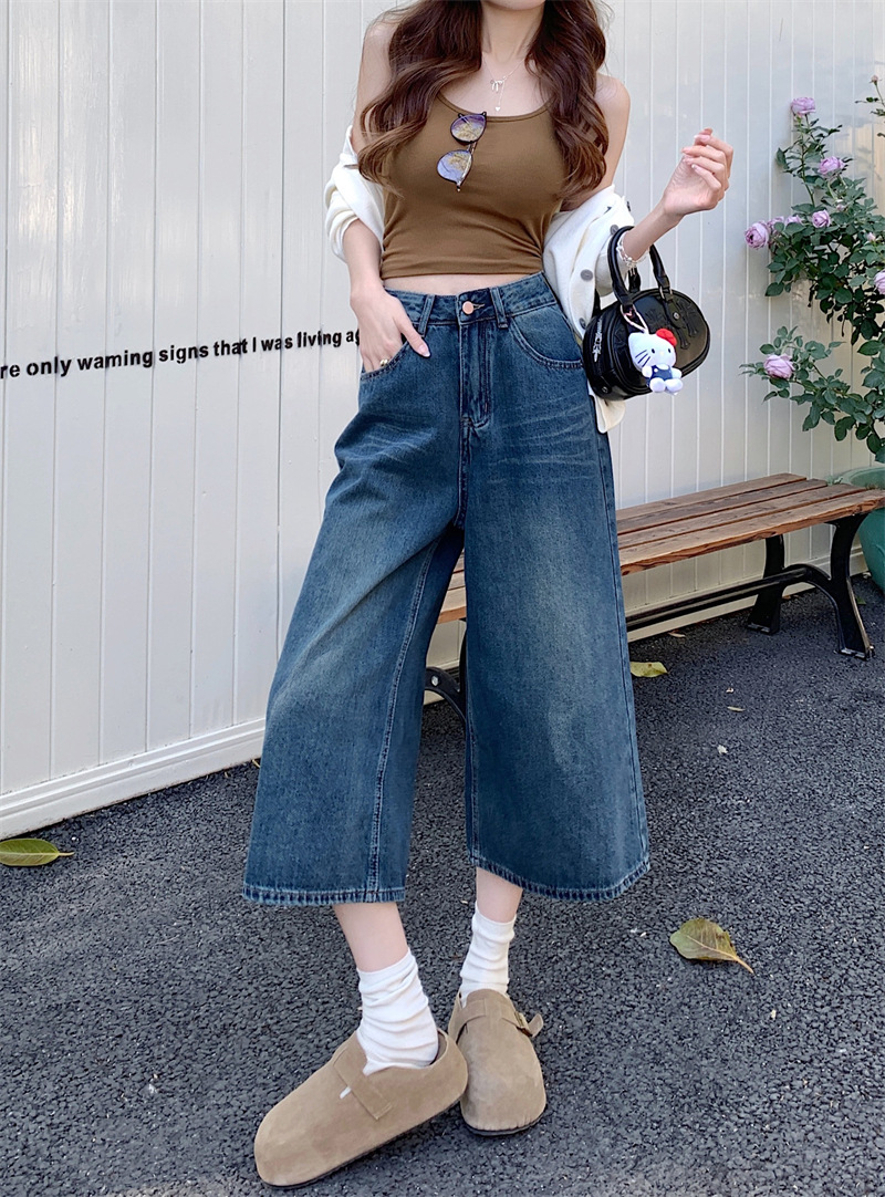 리얼 샷 2025 봄 새로운 여성 복고풍 하이 웨이스트 스트레이트 튜브 느슨한 데님 8 포인트 와이드 레그 팬츠 여성스토어 가기