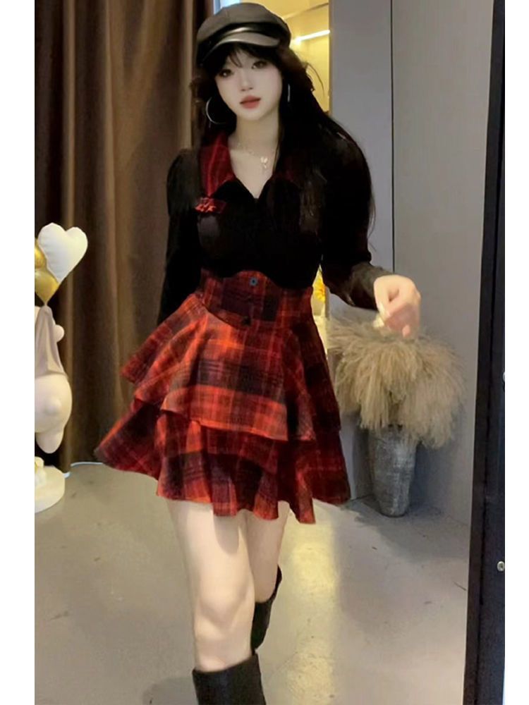 • 블랙 탑 + 레드 체크 무늬 허리 스커트 [슈트]