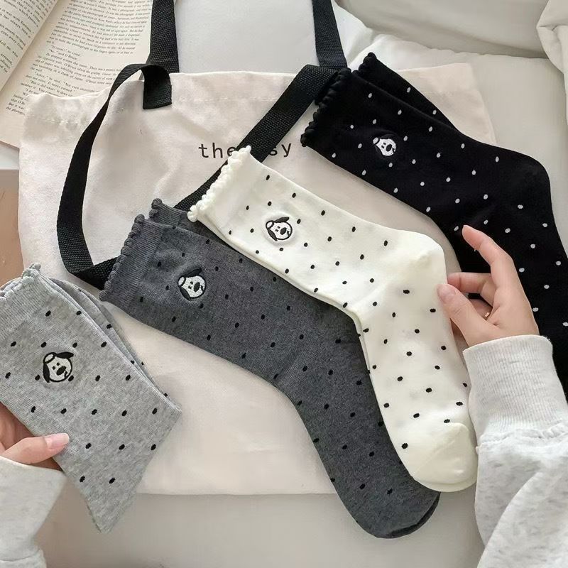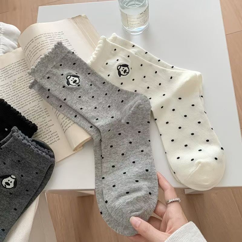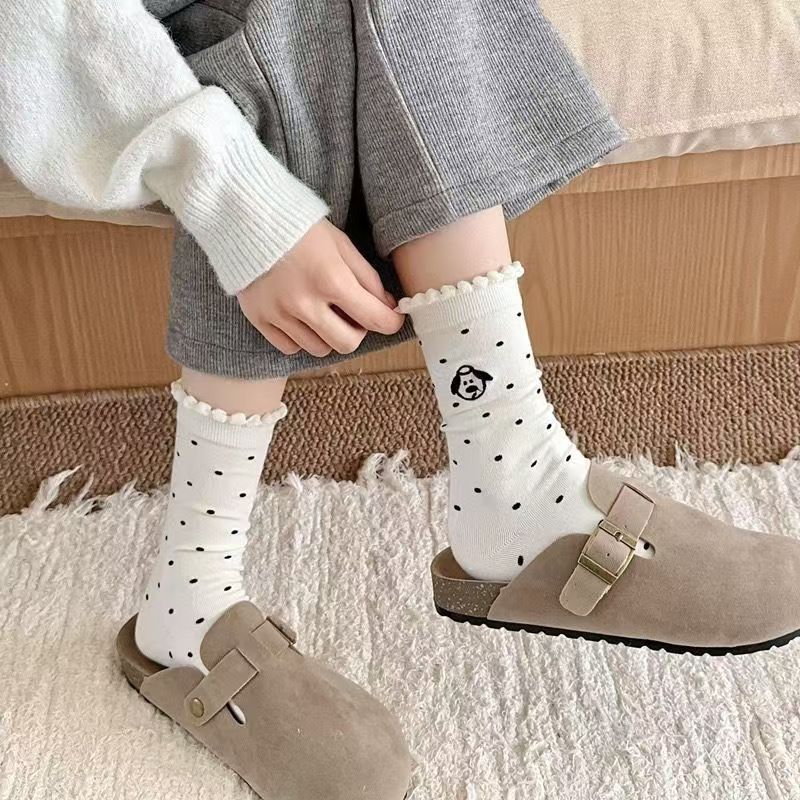 양말 여성용 종아리 중간 양말 봄, 가을 일본 만화 귀여운 인 트렌드 강아지 레이스 버블 입 폴카 도트 양말스토어 가기