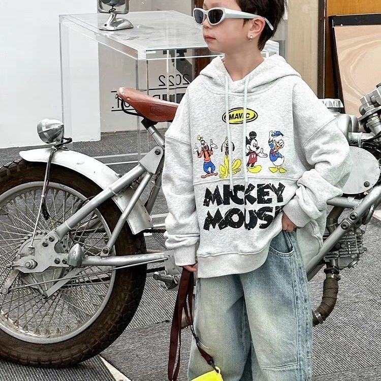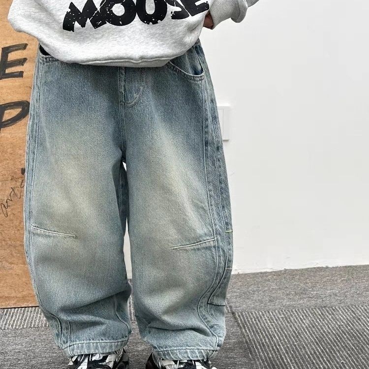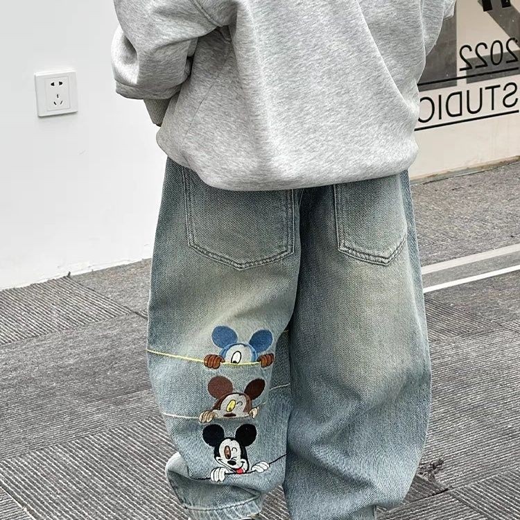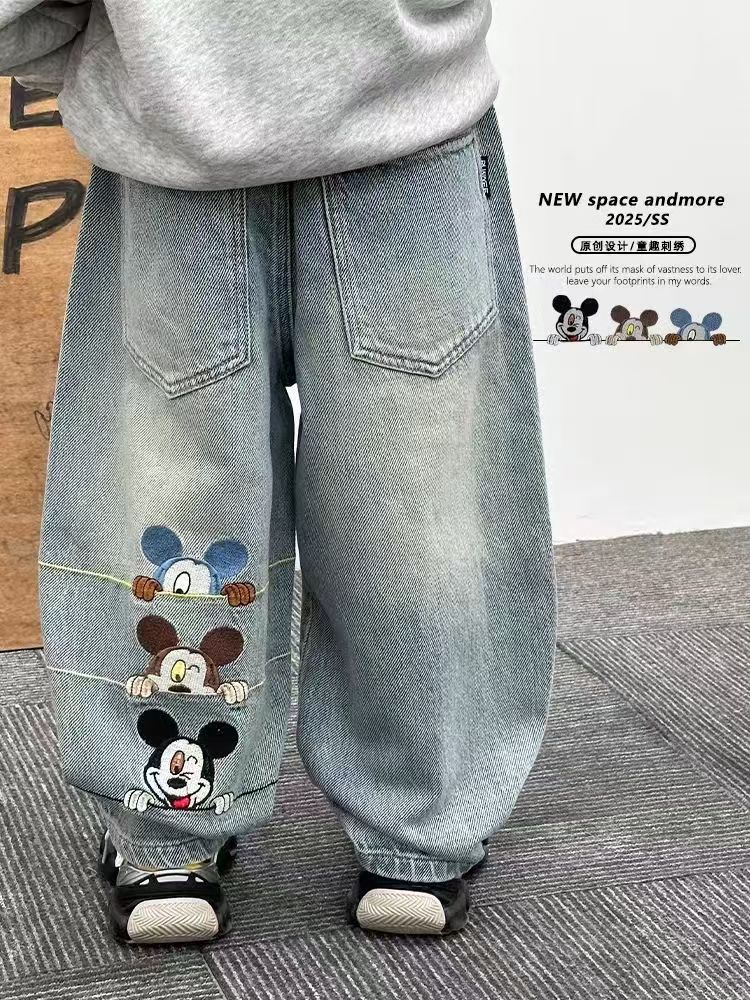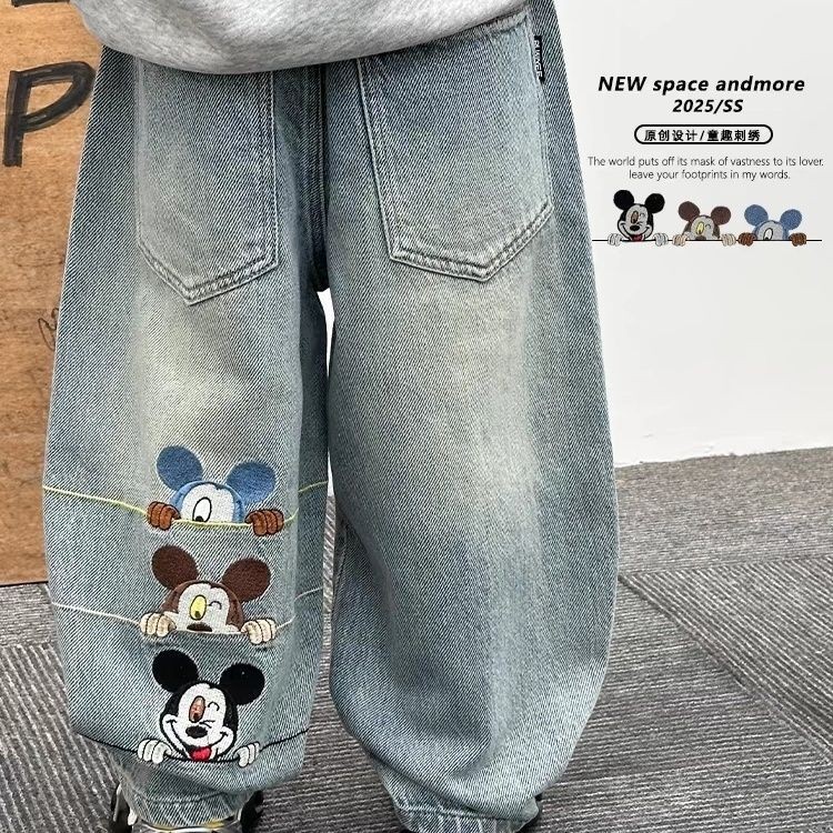 소년 청바지 유치한 만화 수 놓은 2025 새 봄 미키 어린이 바지 봄과 가을 느슨한 토르 바지스토어 가기