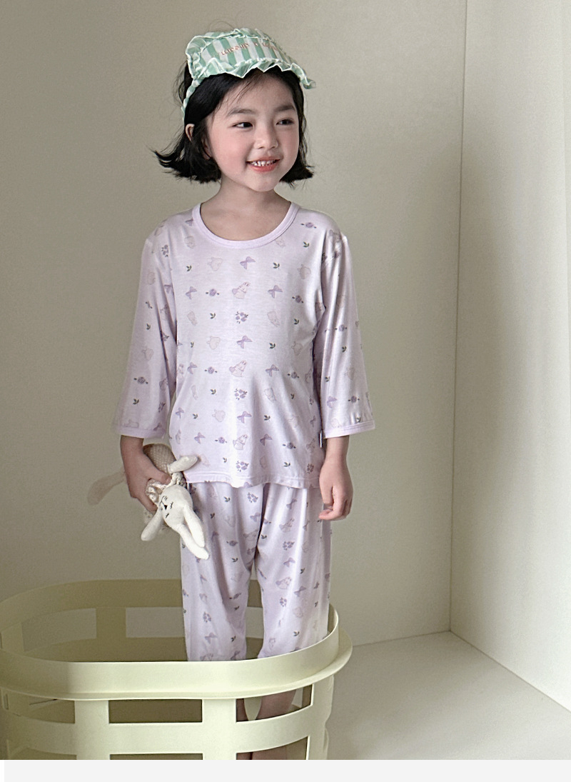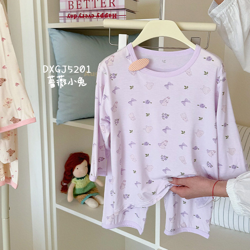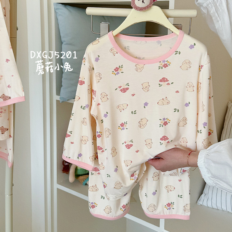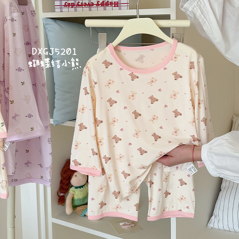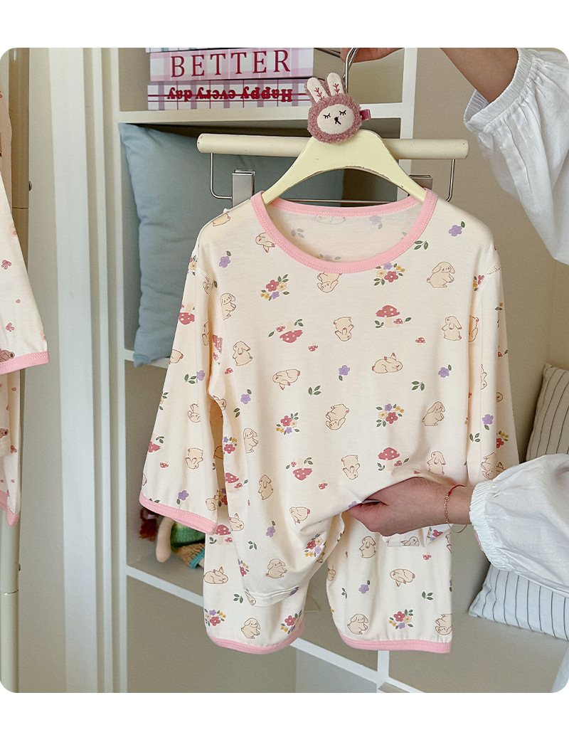 25 봄과 여름 어린이 잠옷 새로운 소녀 경량 통기성 꽃 만화 인쇄 7 소매 홈 의류 세트