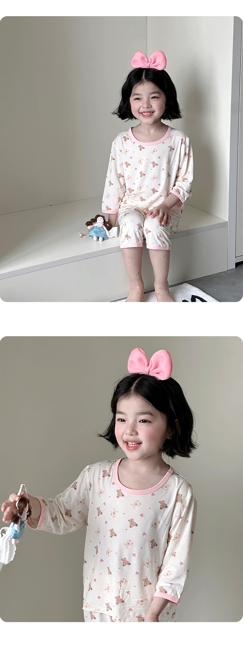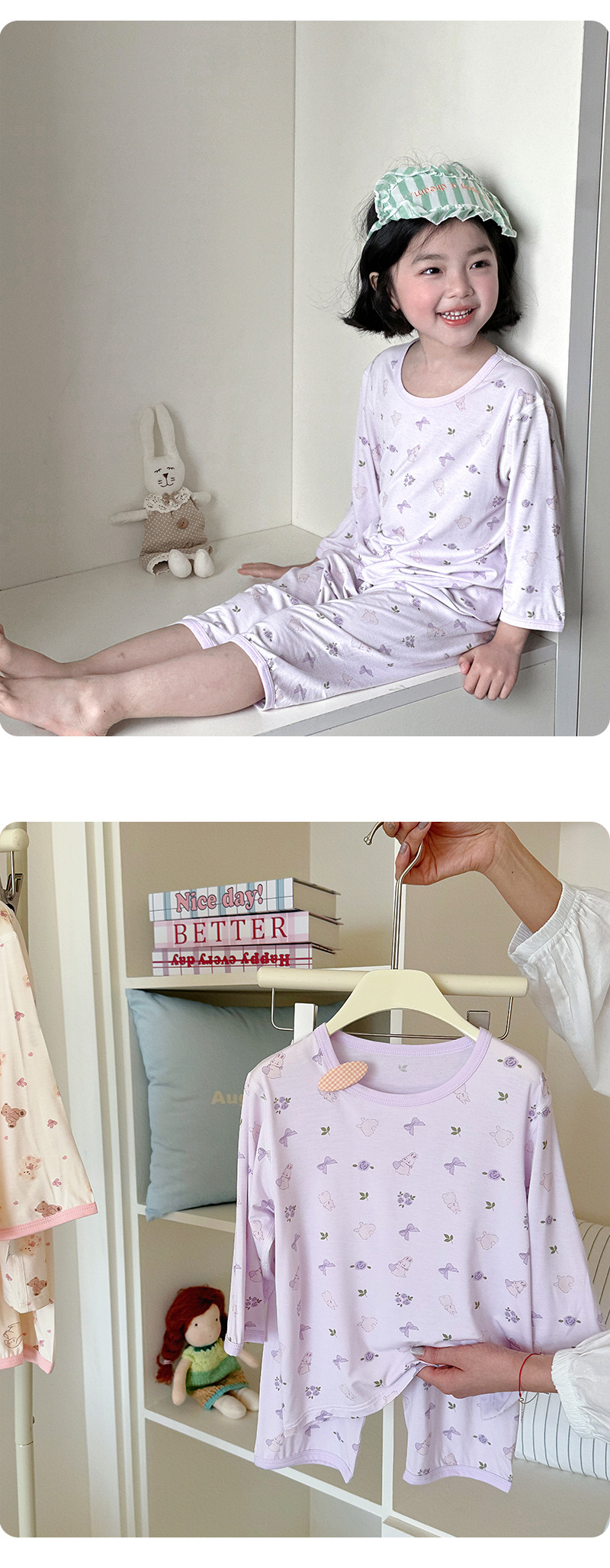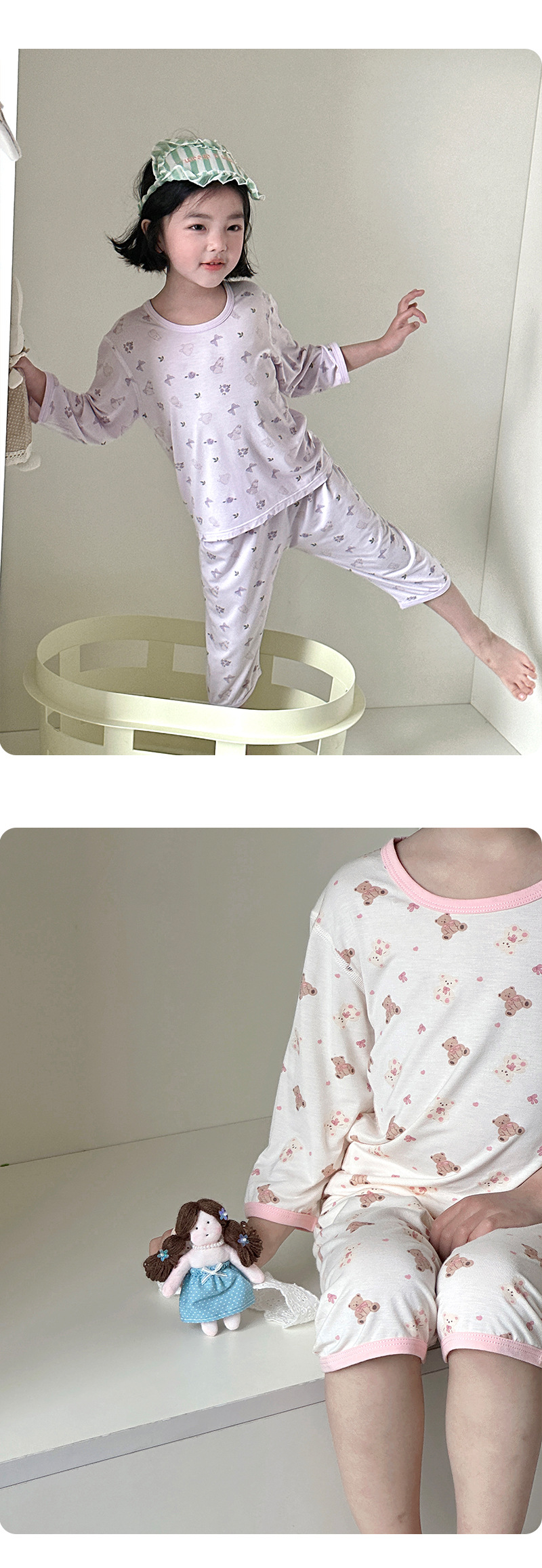25 봄과 여름 어린이 잠옷 새로운 소녀 경량 통기성 꽃 만화 인쇄 7 소매 홈 의류 세트