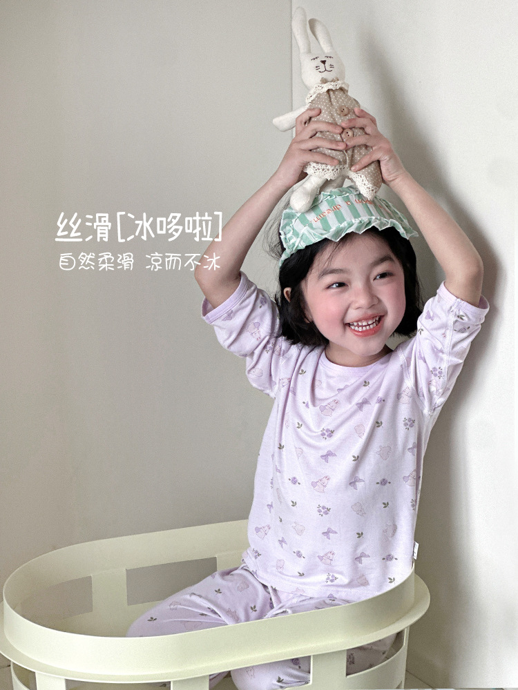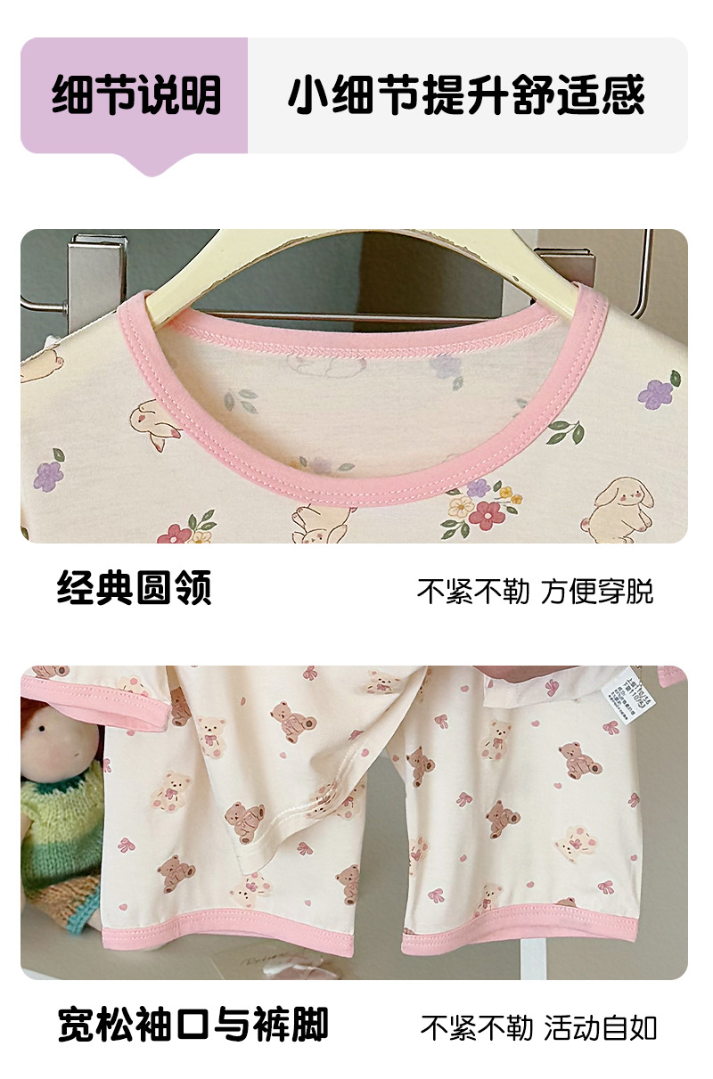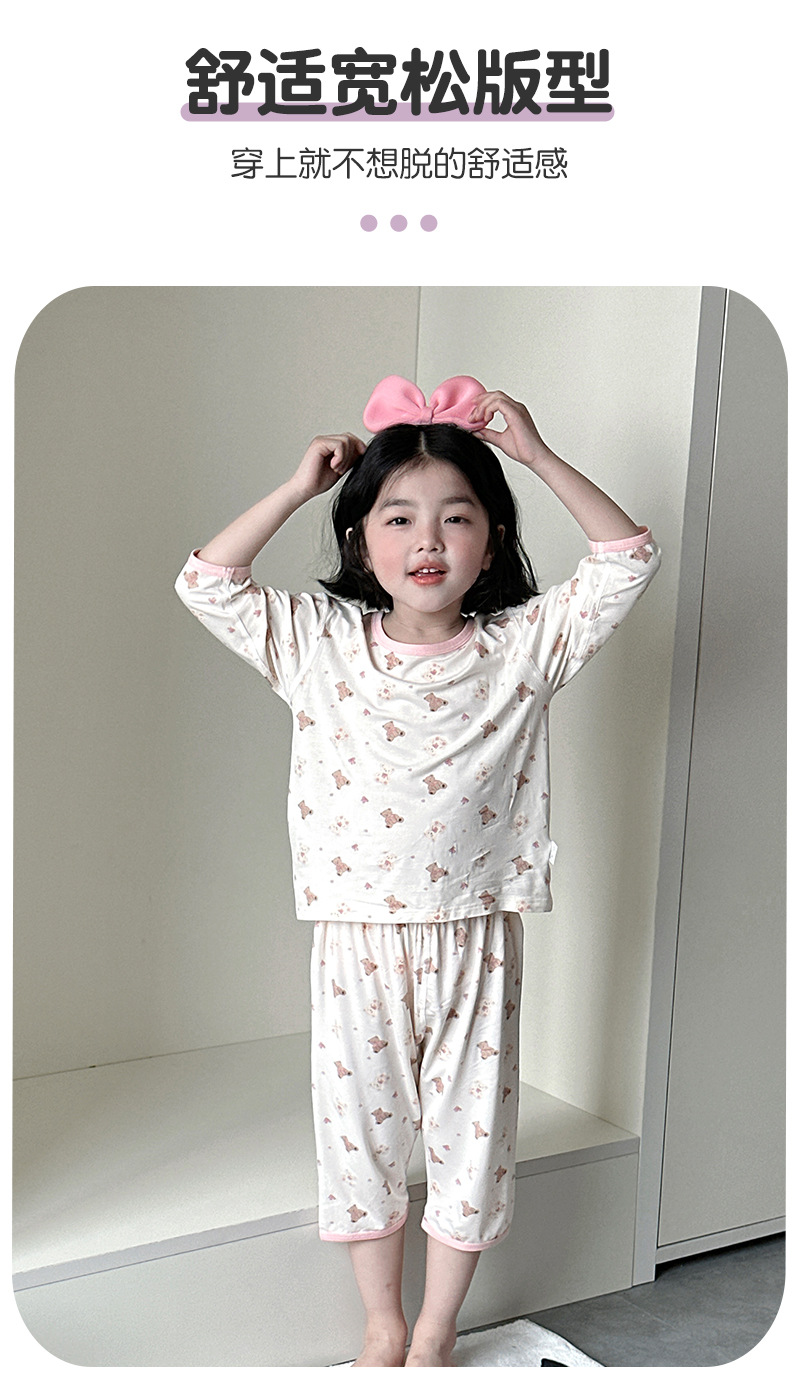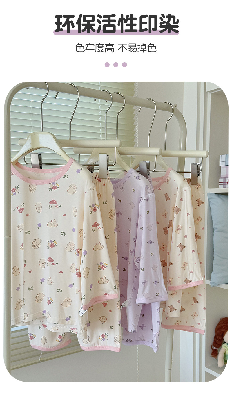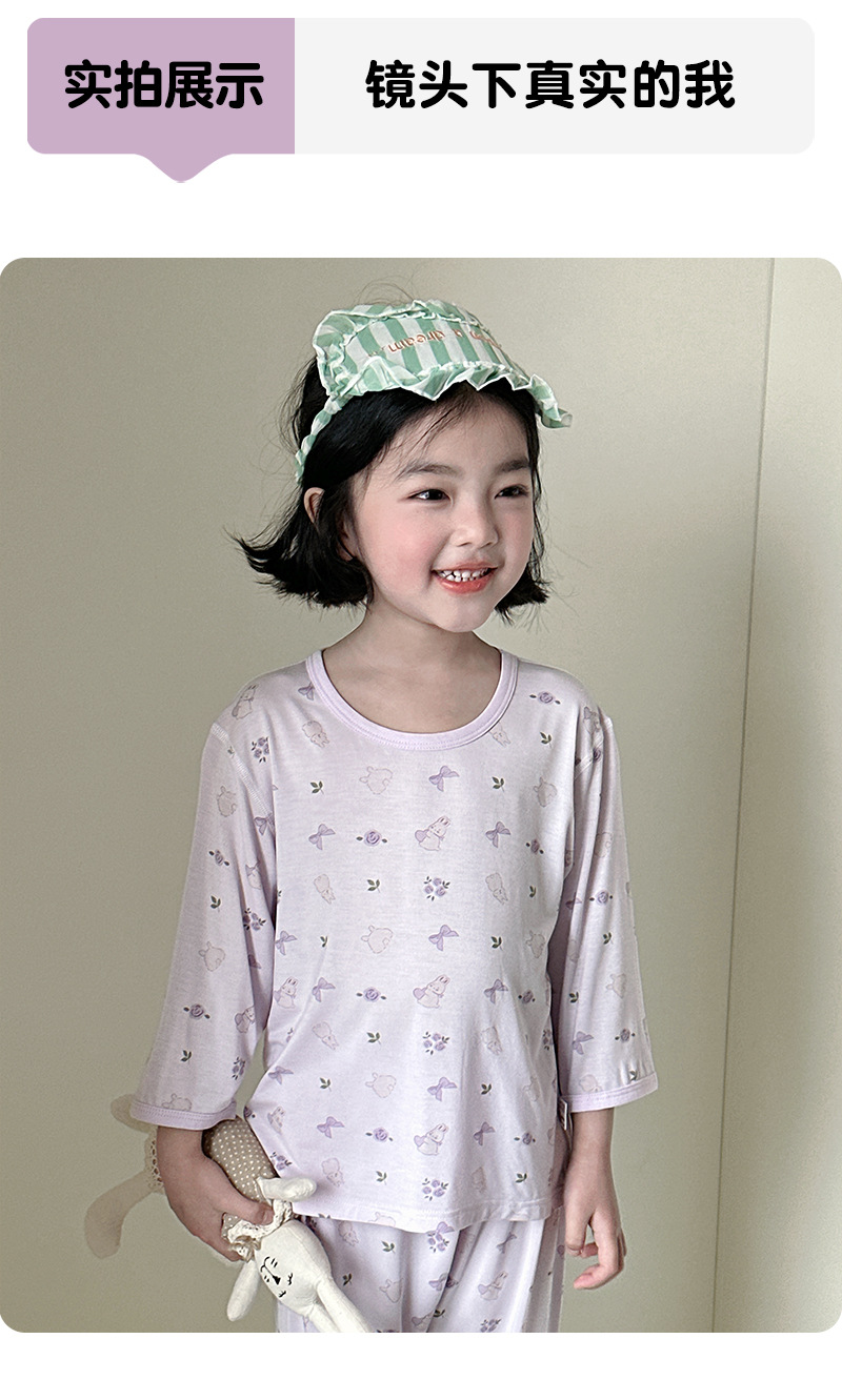 25 봄과 여름 어린이 잠옷 새로운 소녀 경량 통기성 꽃 만화 인쇄 7 소매 홈 의류 세트스토어 가기