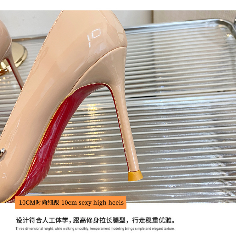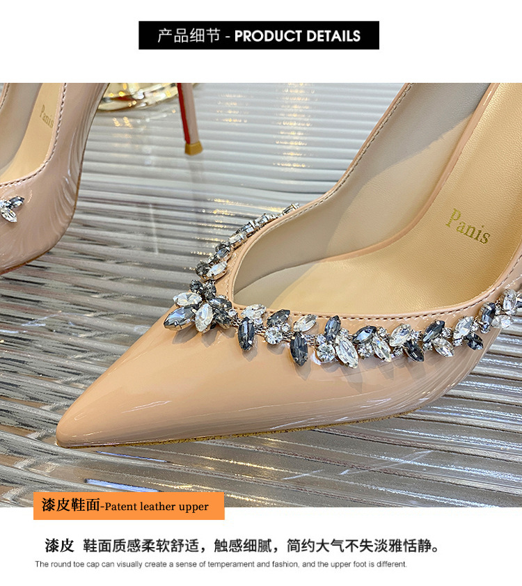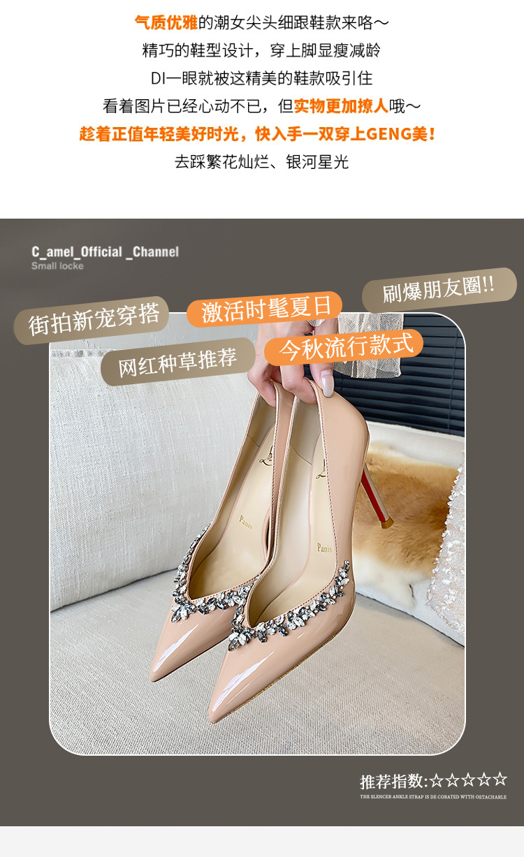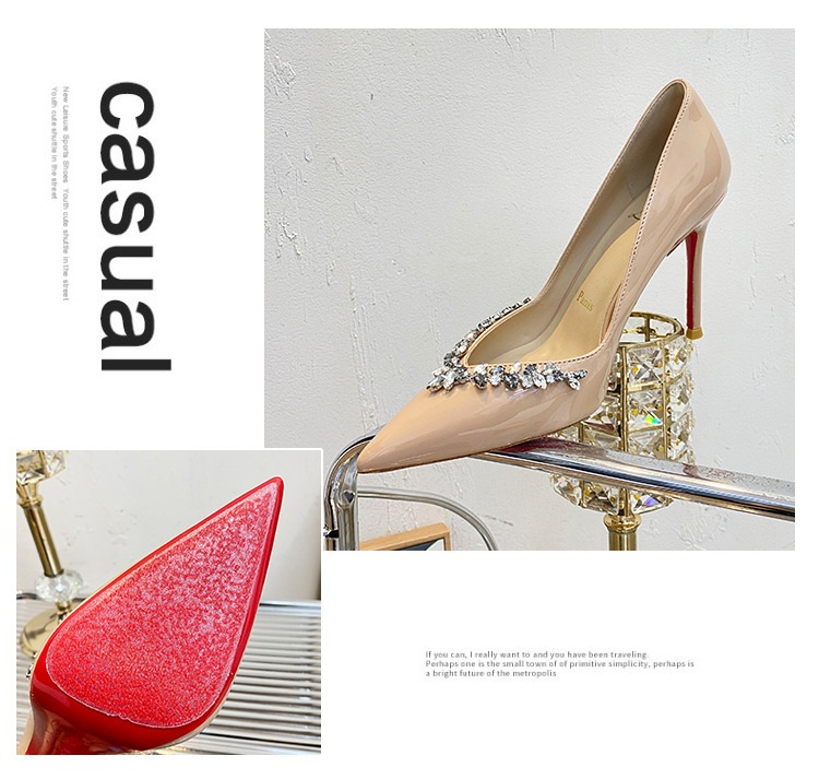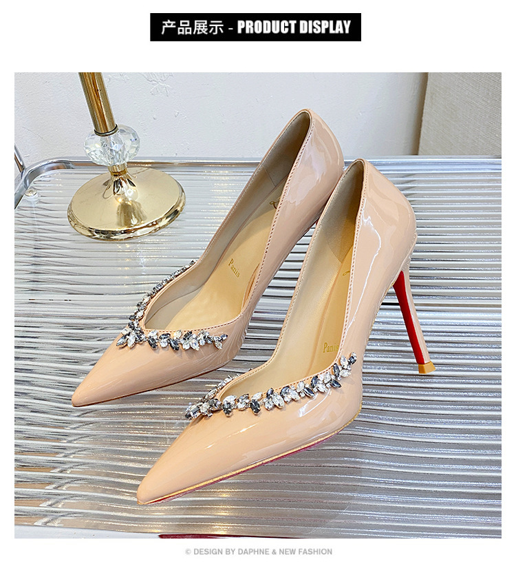 누드 컬러 여성용 하이힐 2026 신상 V자형 체인과 라인스톤 장식의 슬림한 굽과 뾰족한 앞코, 우아한 프렌치 스타일의 레드 밑창 연회용 구두스토어 가기