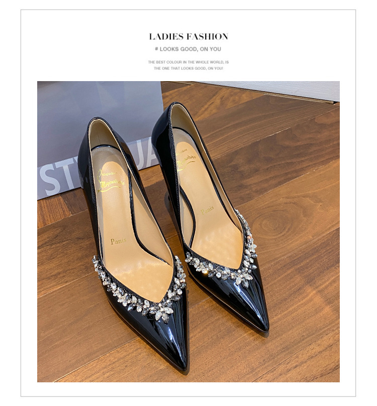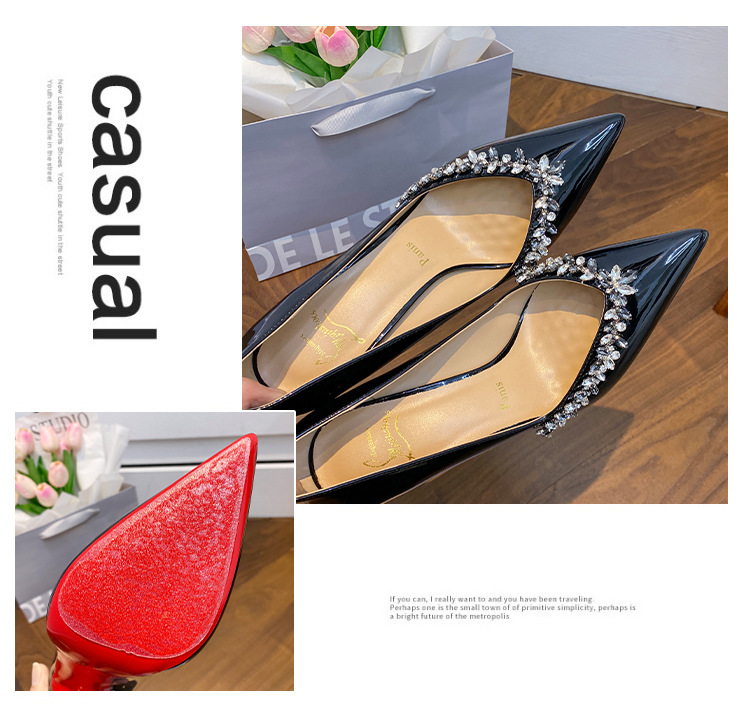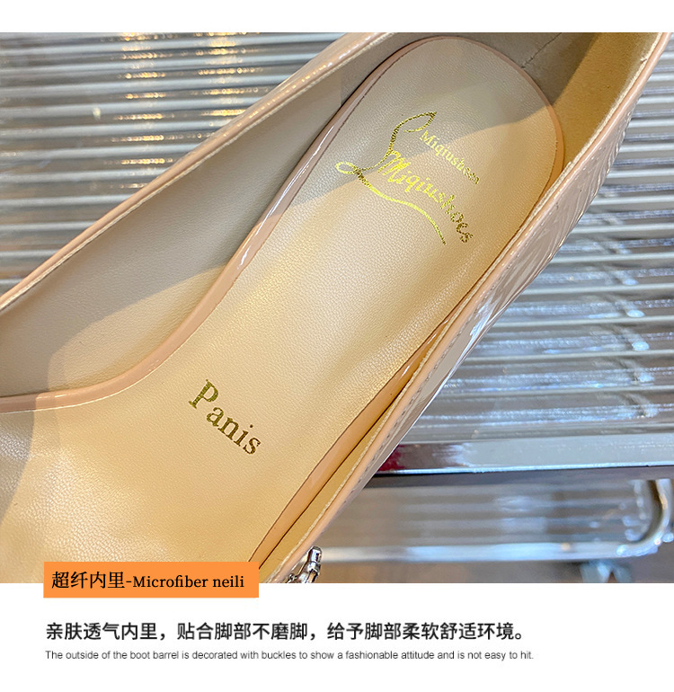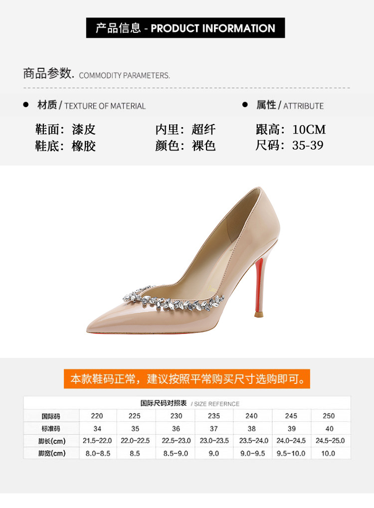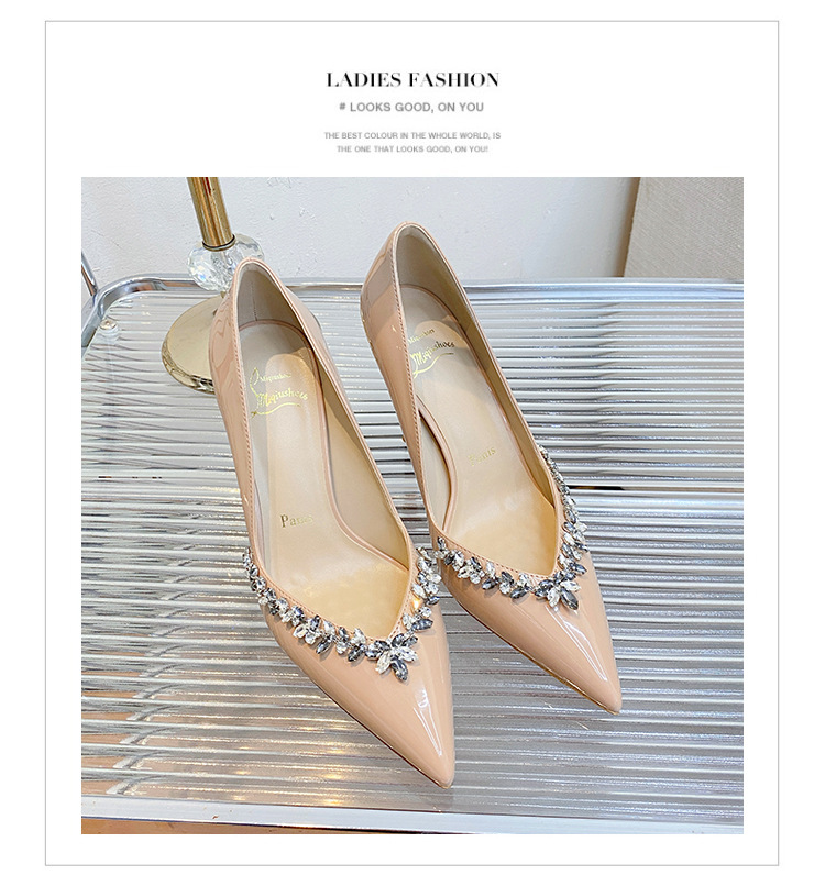 누드 컬러 여성용 하이힐 2026 신상 V자형 체인과 라인스톤 장식의 슬림한 굽과 뾰족한 앞코, 우아한 프렌치 스타일의 레드 밑창 연회용 구두스토어 가기