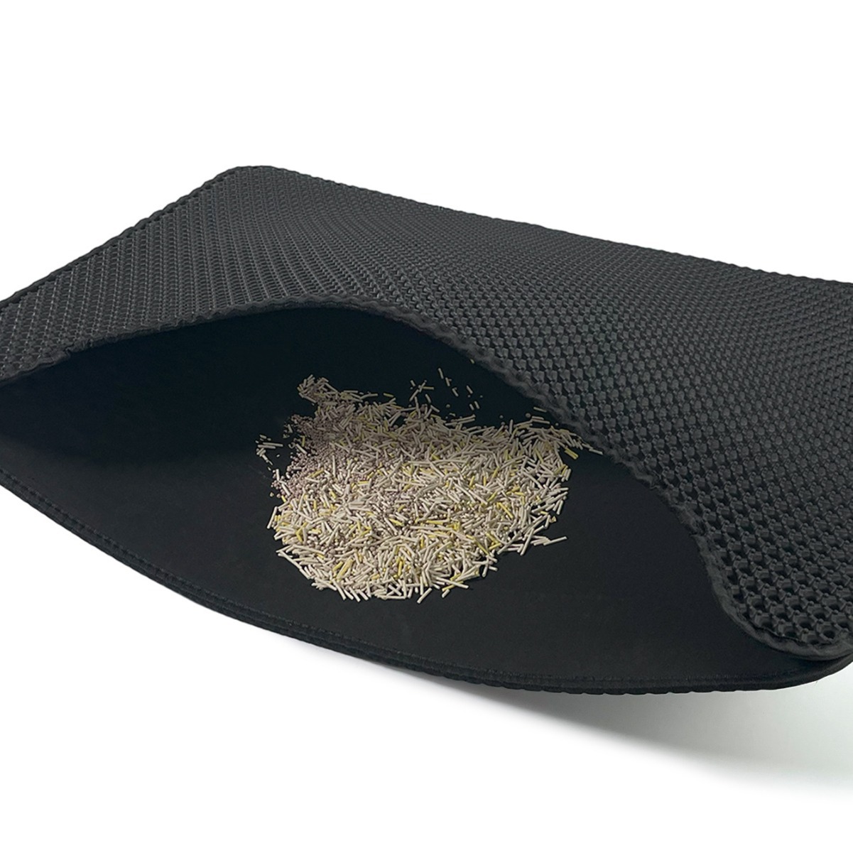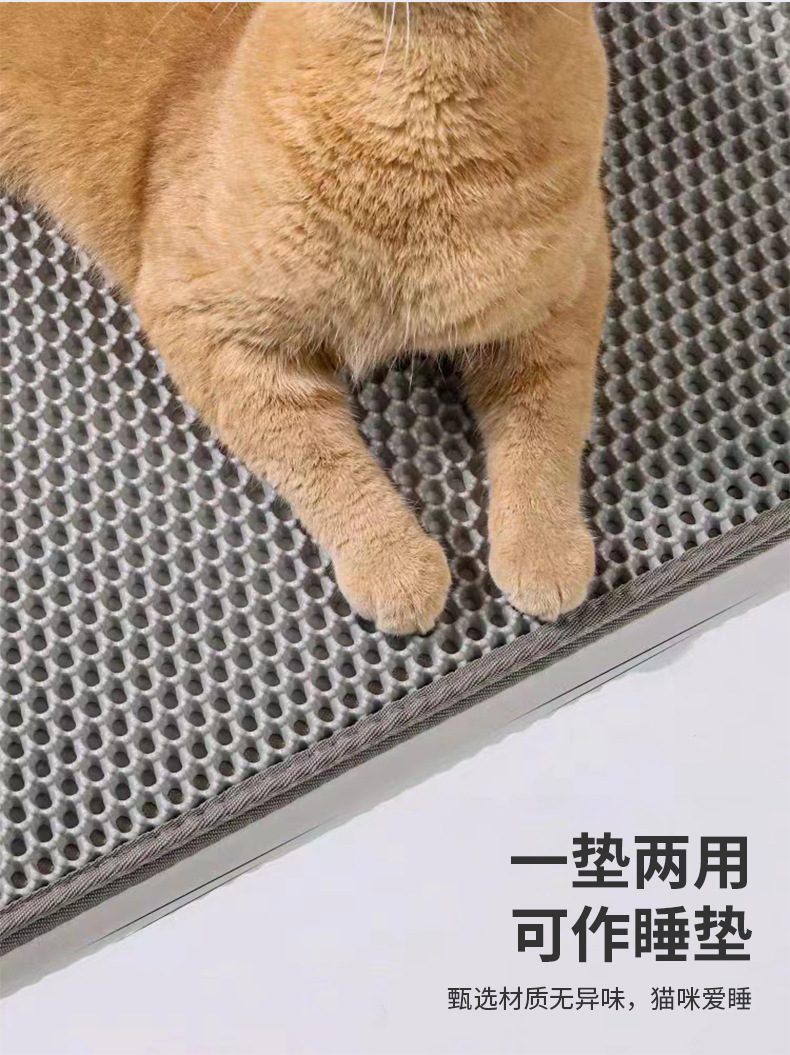 产品功能:适用95%以上种类的猫砂,上层通孔材料,猫砂可轻易通过,下层防水材质,猫砂、小便等脏物可聚集于此。猫砂垫为上下双层设计:上层采用六角形的洞孔凹凸设计,除了让猫砂落入后不再溅出外,圆球型的柔滑触感也可以避免猫咪抓坏,下层垫密封专门存放猫砂,底部设计成规则性的圆孔,有效防滑避免横冲直撞的猫咪滑到受伤。
