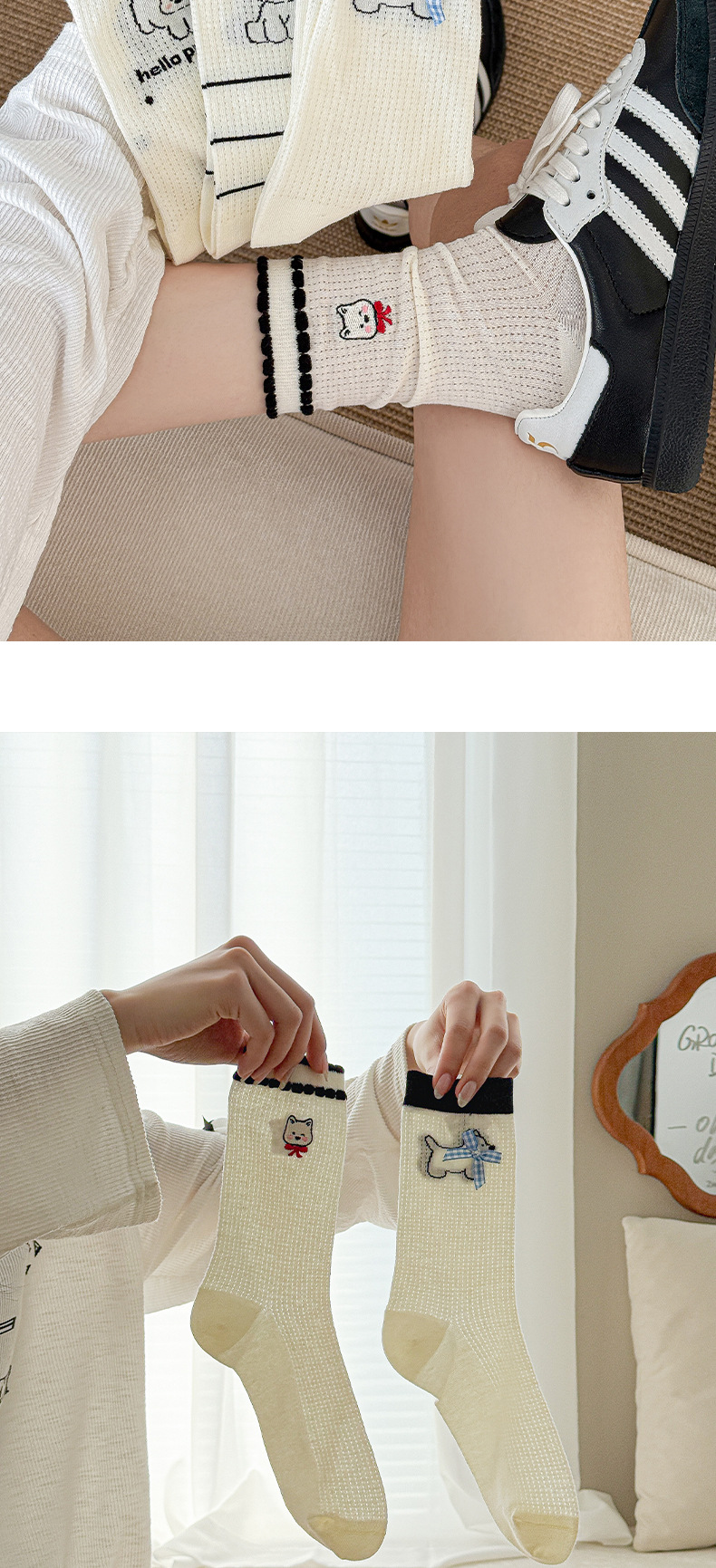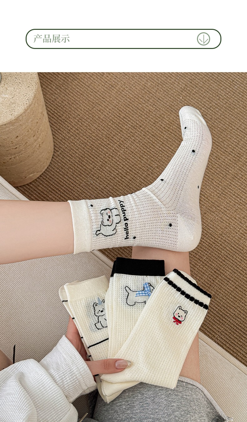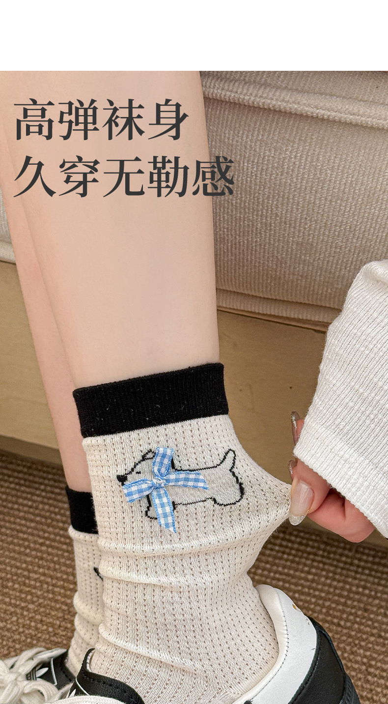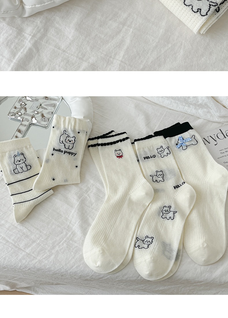 흰색 양말 여성의 중간 튜브 양말 봄과 가을 얇은 통기성 메쉬 귀여운 강아지 더미 긴 튜브 뼈없는 조수