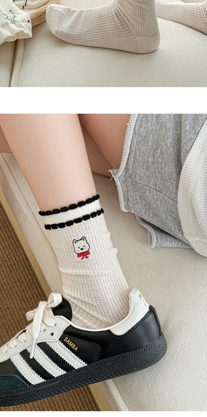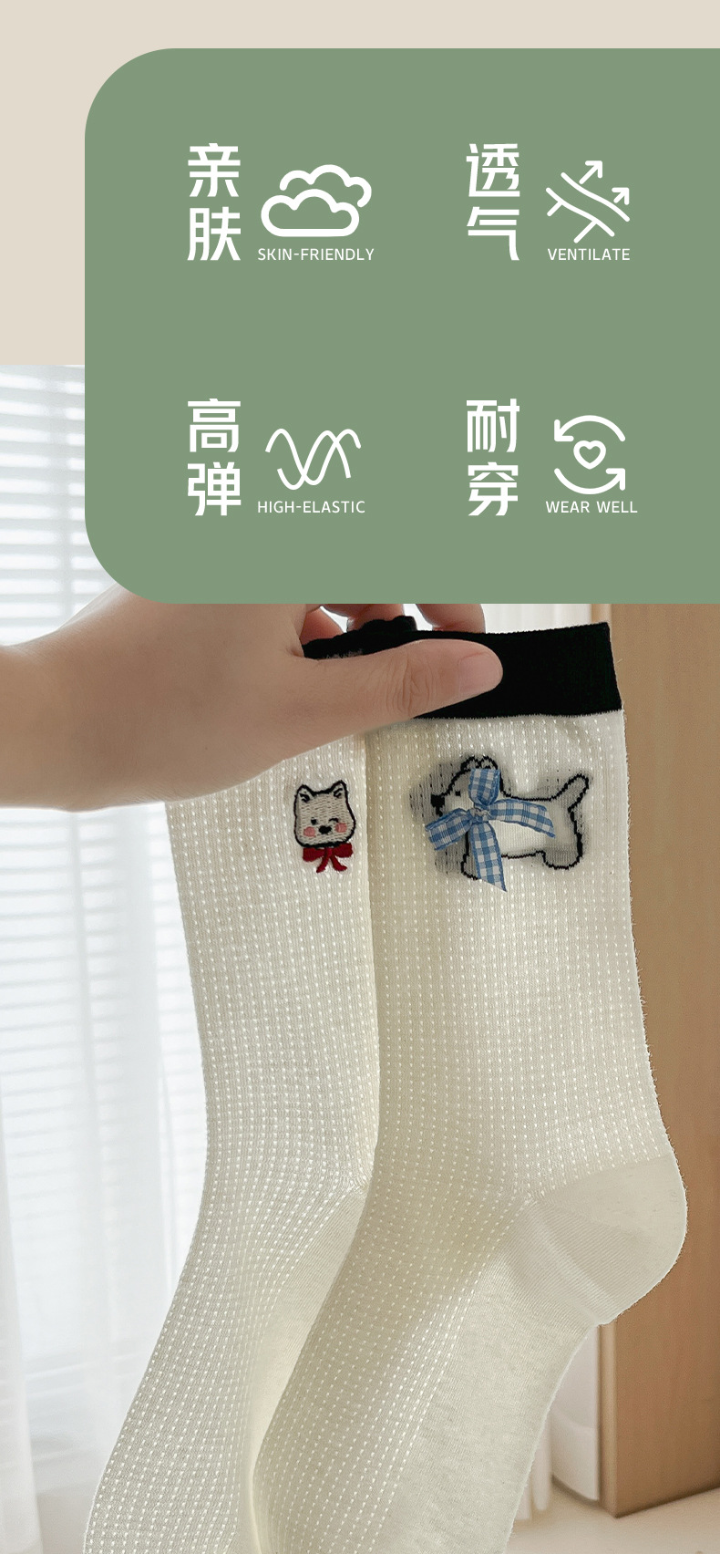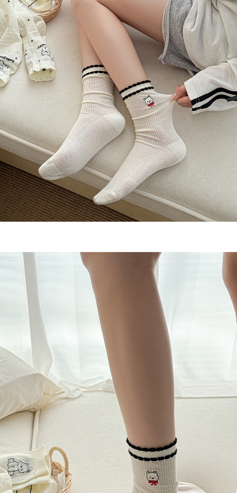 흰색 양말 여성의 중간 튜브 양말 봄과 가을 얇은 통기성 메쉬 귀여운 강아지 더미 긴 튜브 뼈없는 조수