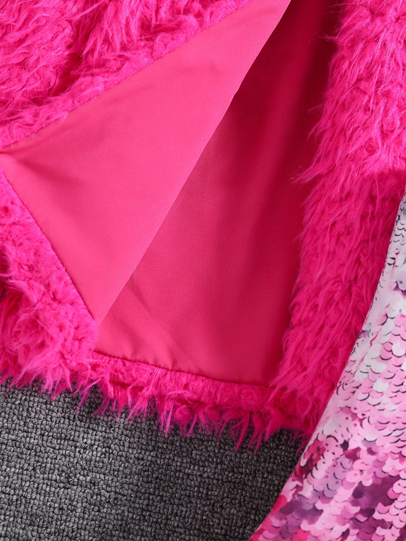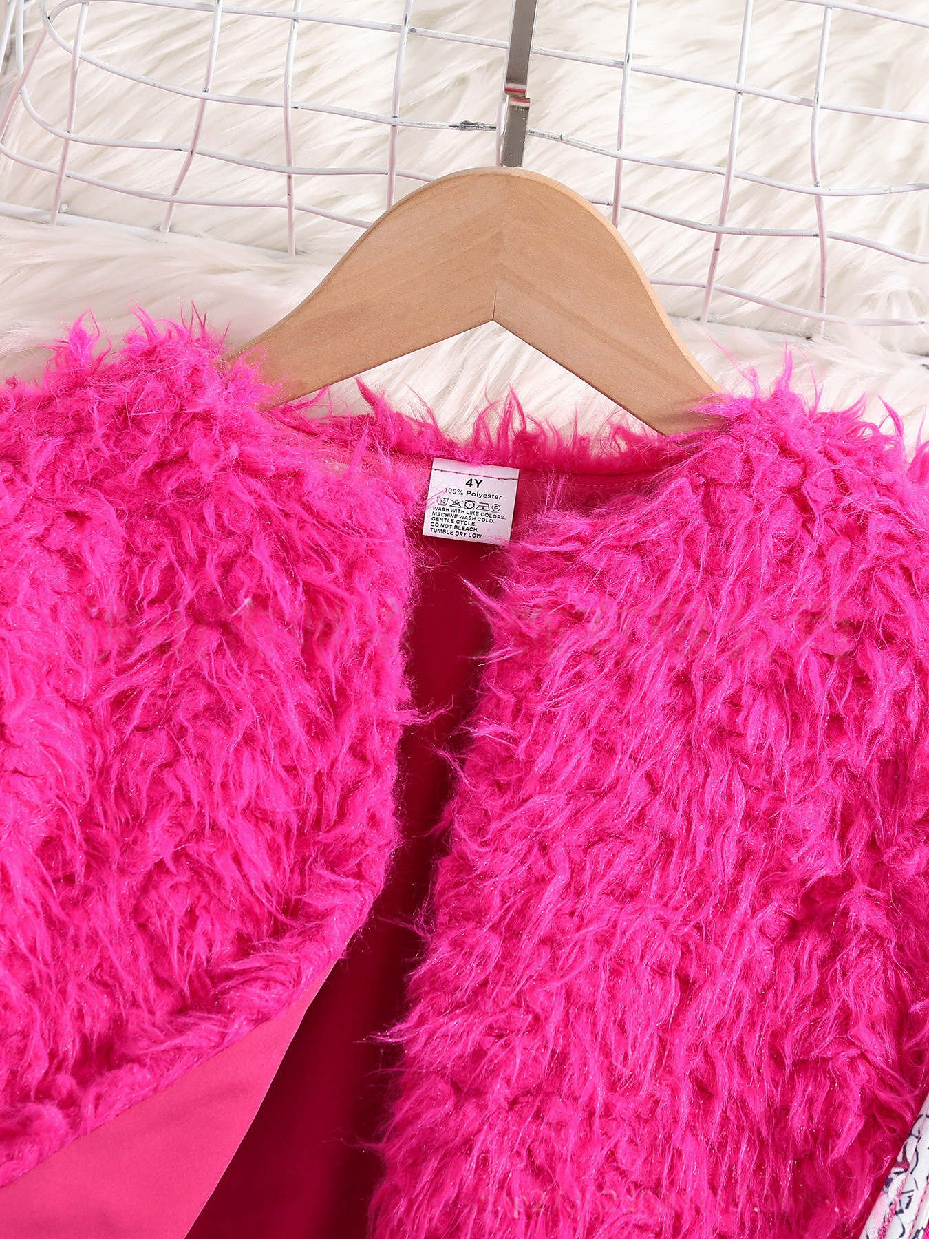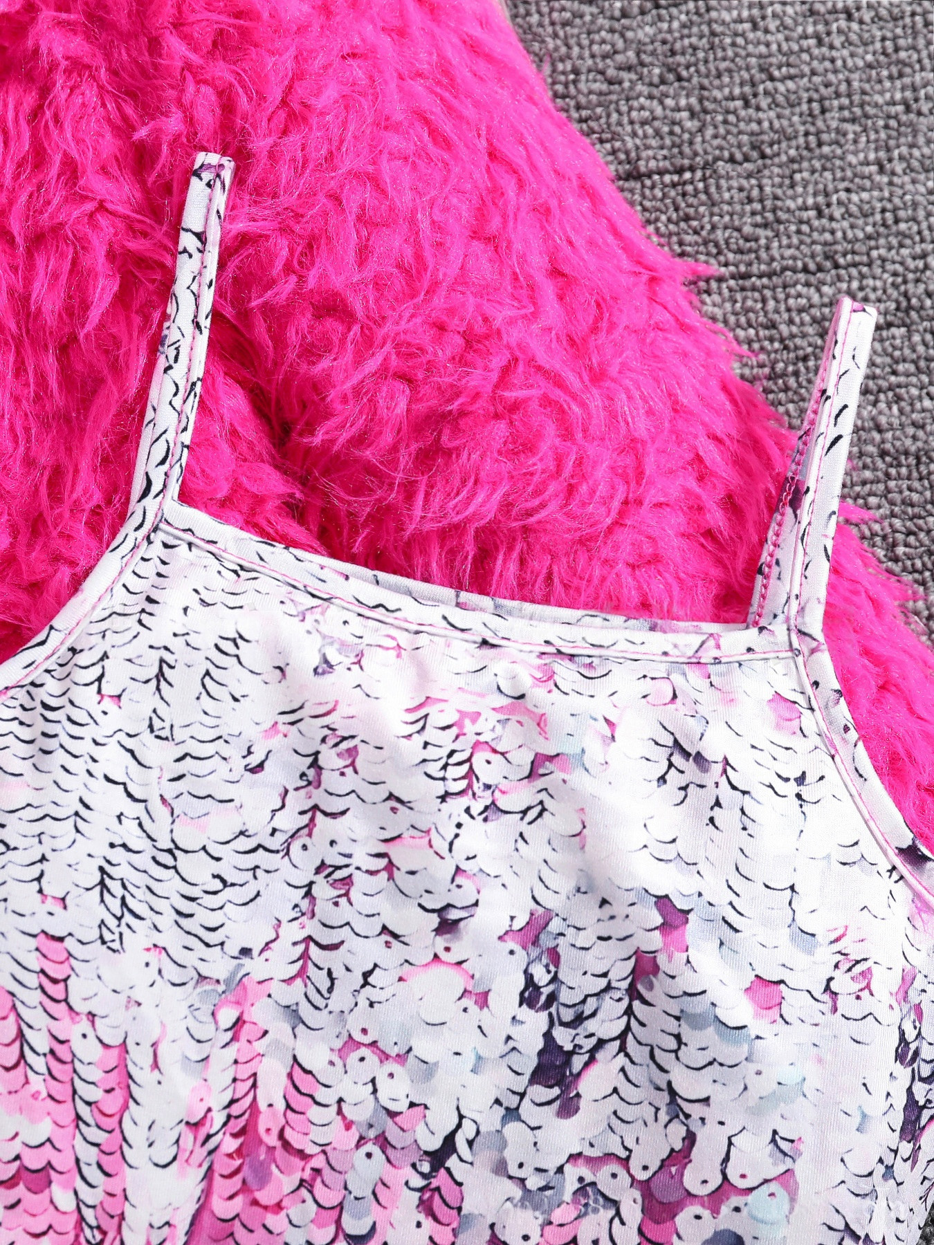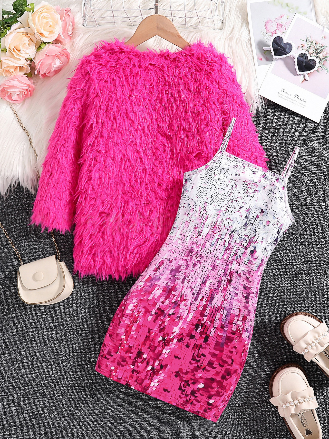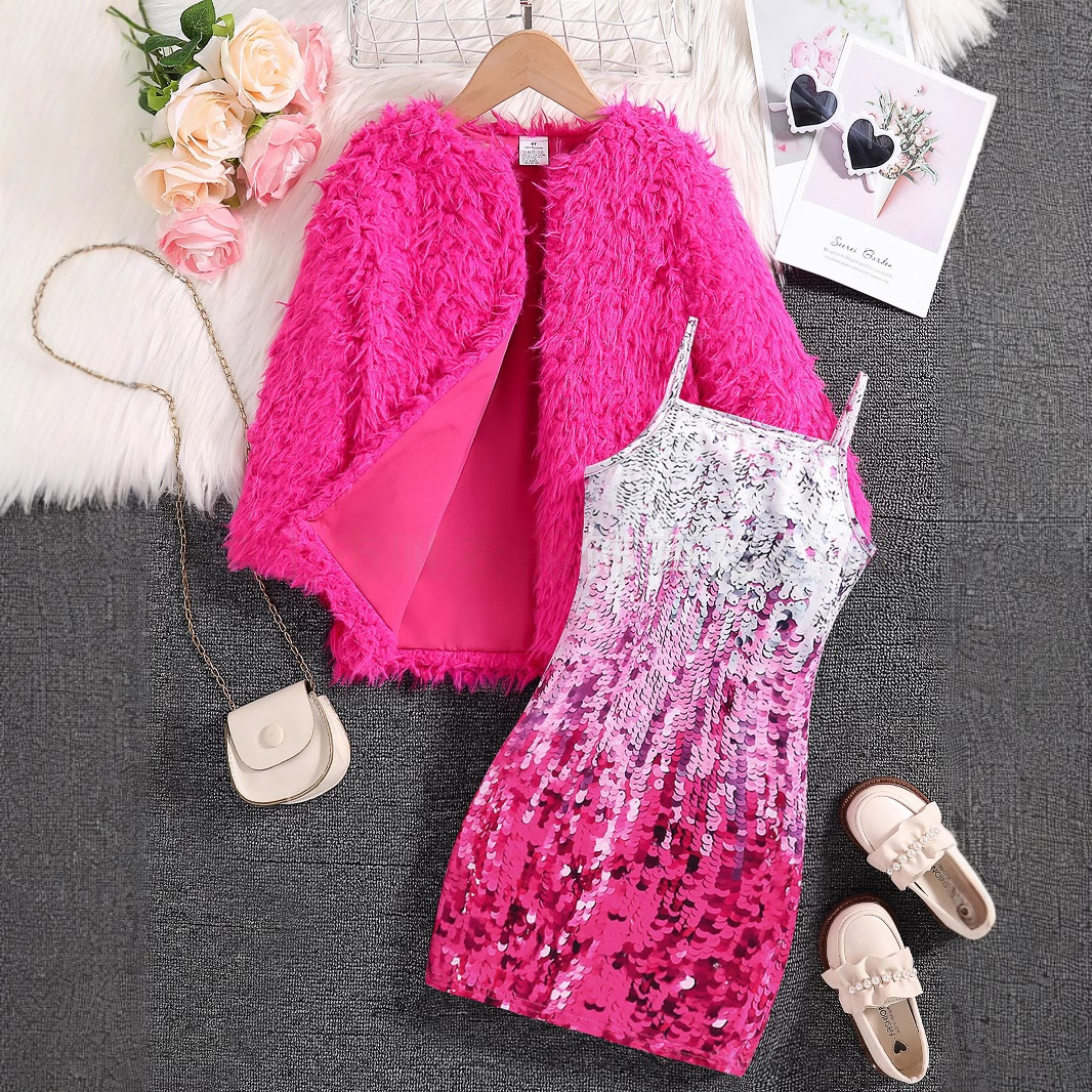 국경을 넘는 다중 공급업체의 봄/가을 여아용 단색 인조 모피 재킷 + 인조 스팽글 프린트 멜빵 원피스스토어 가기