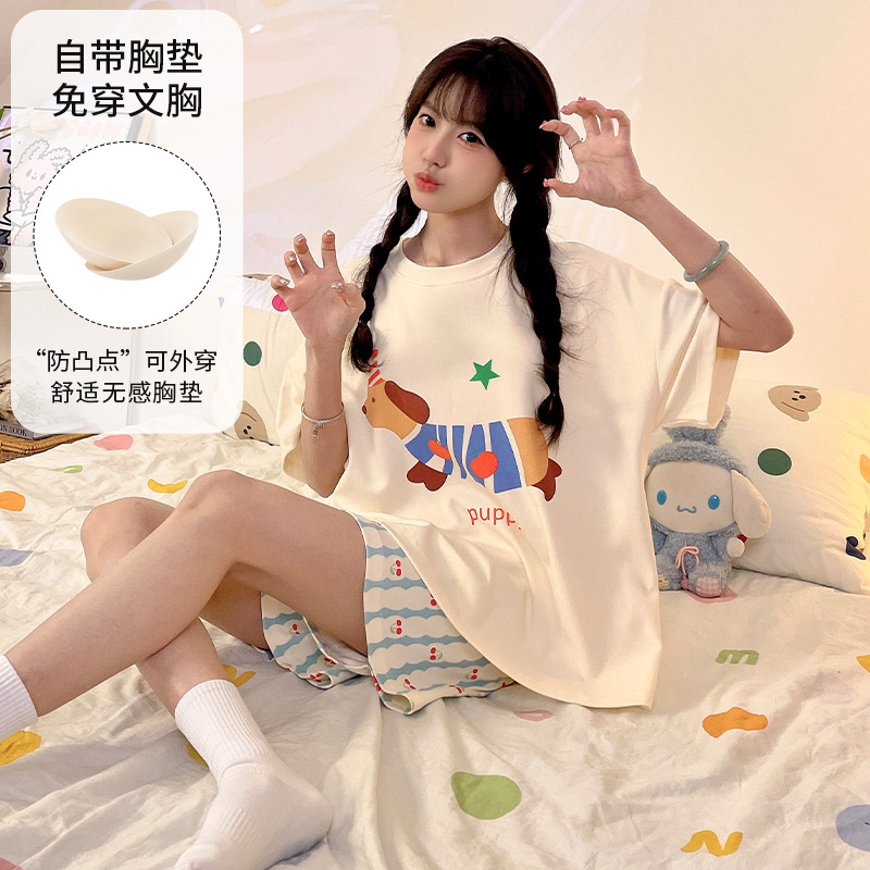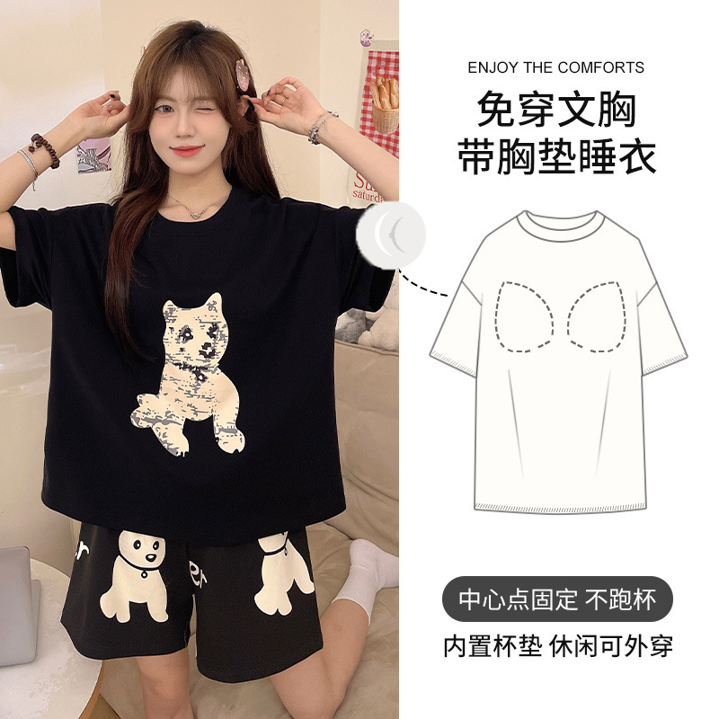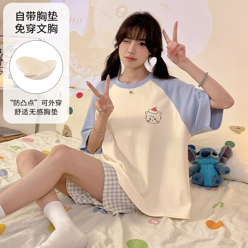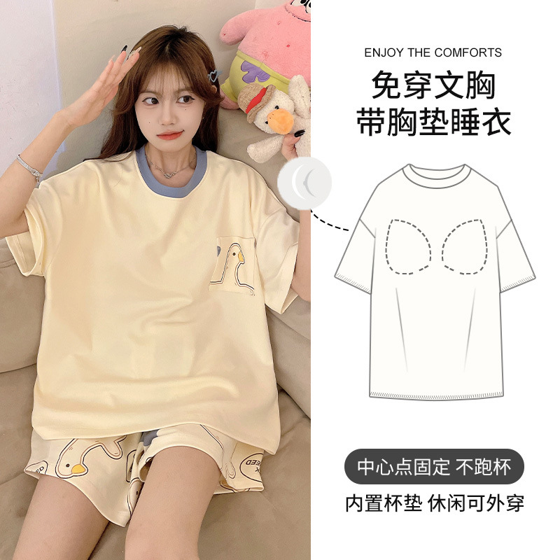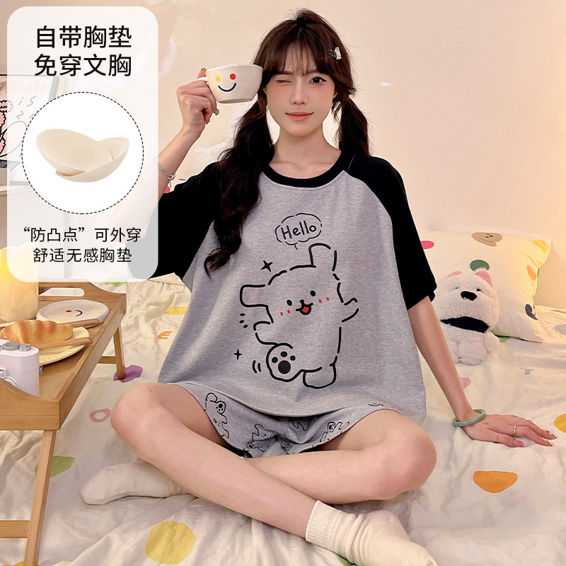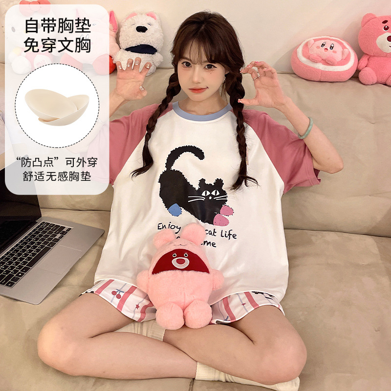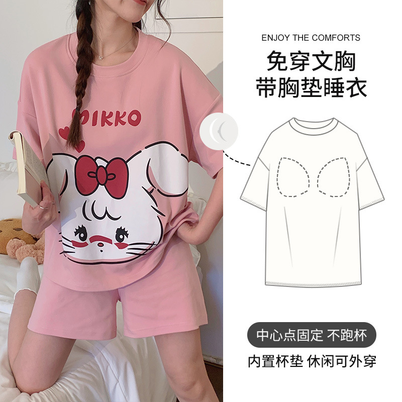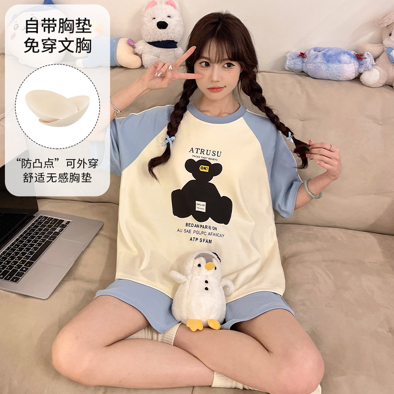 가슴 패드 잠옷 여성 여름 반팔 반바지 투피스 세트 의상 안티 범프 만화 여성 홈 의류스토어 가기