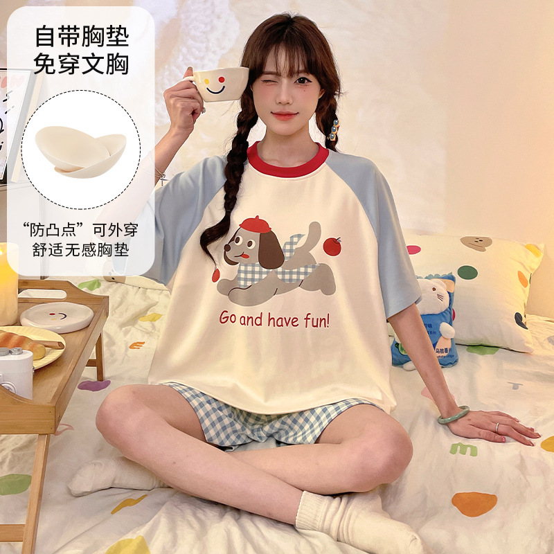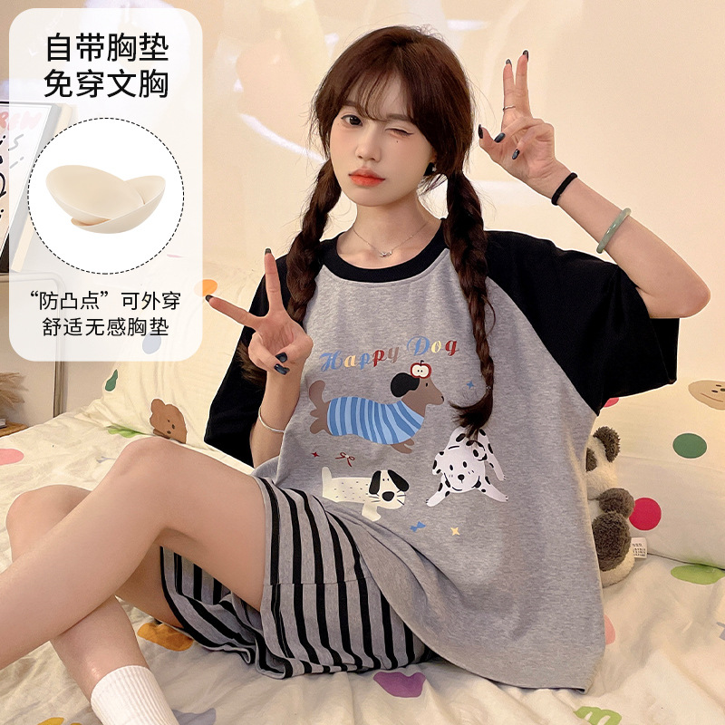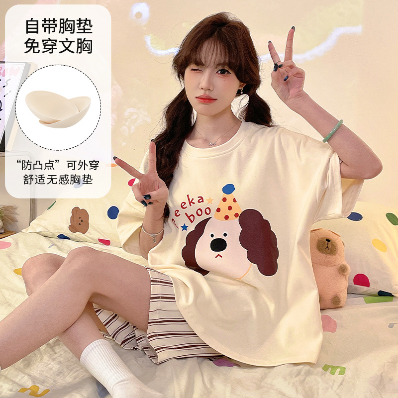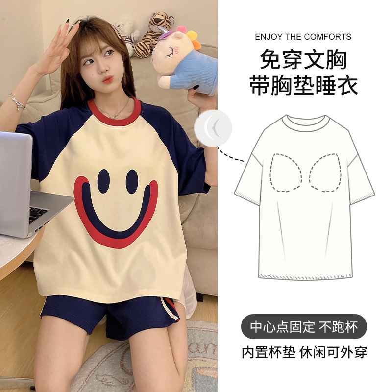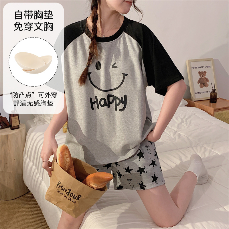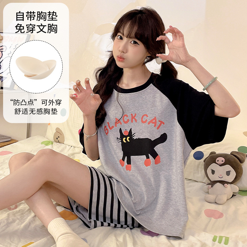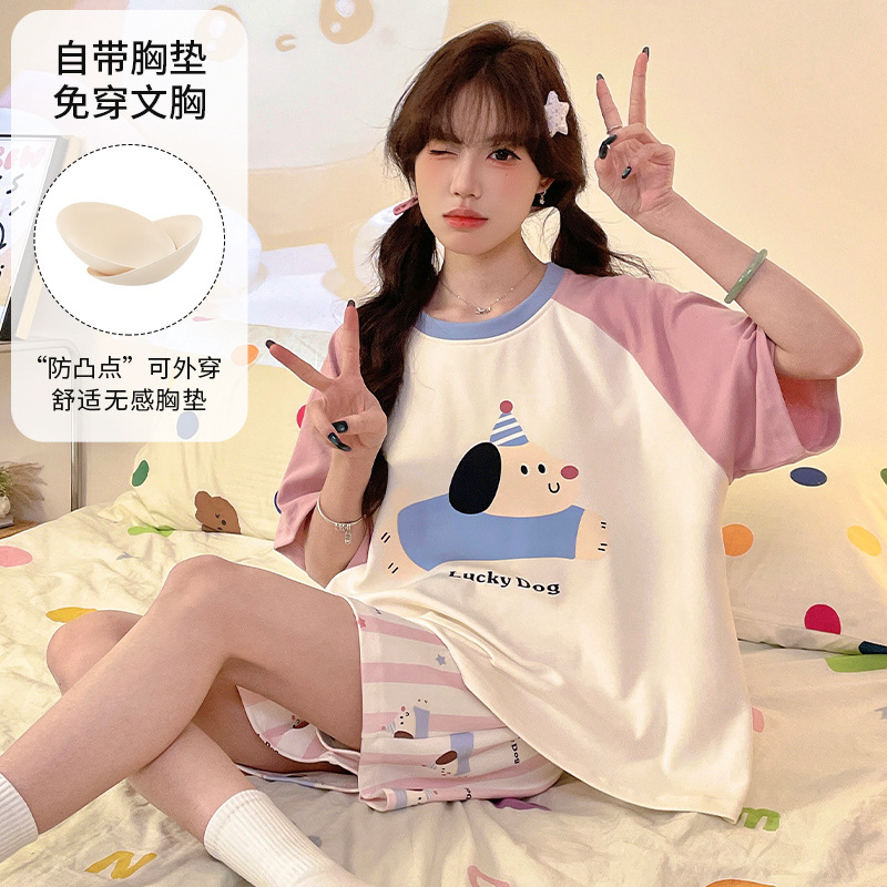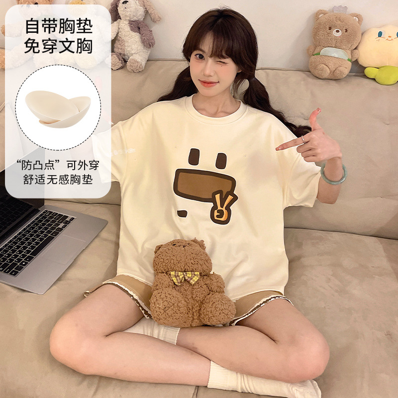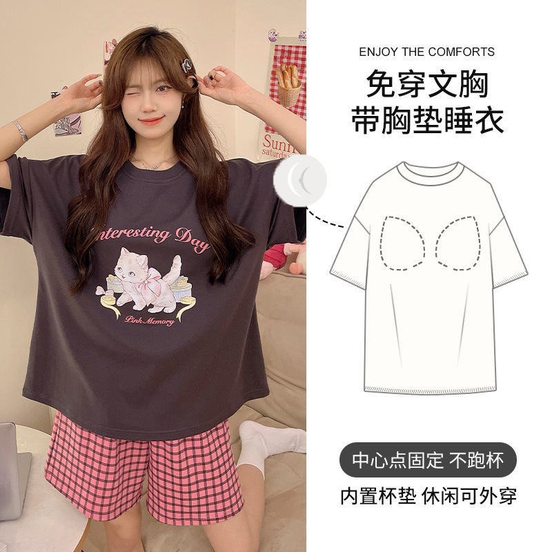 가슴 패드 잠옷 여성 여름 반팔 반바지 투피스 세트 의상 안티 범프 만화 여성 홈 의류스토어 가기
