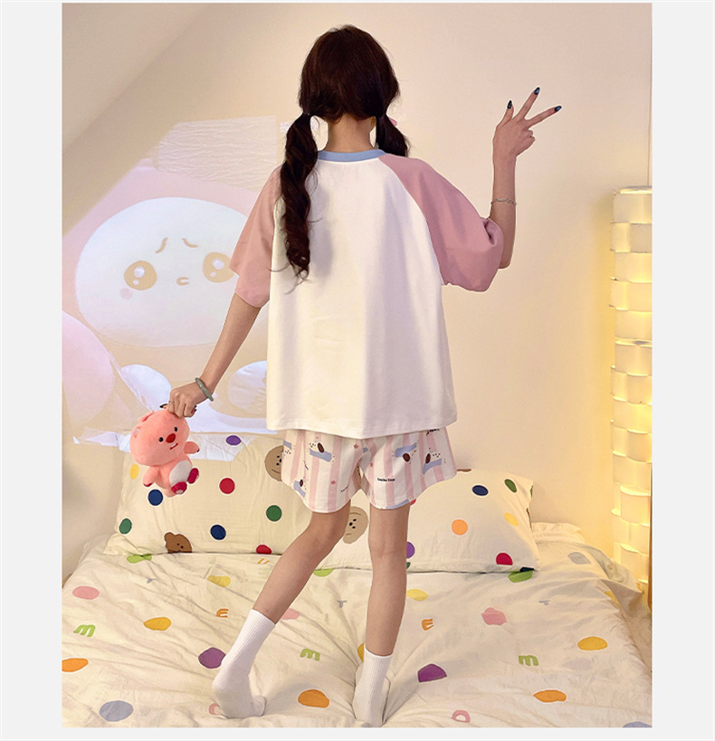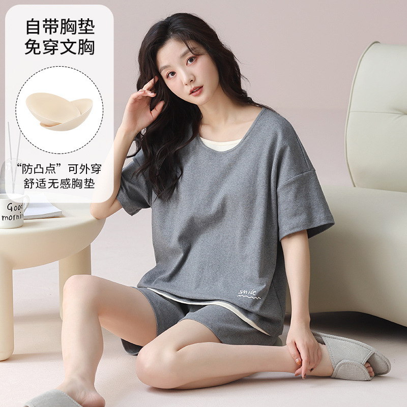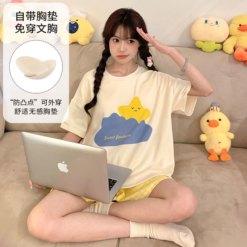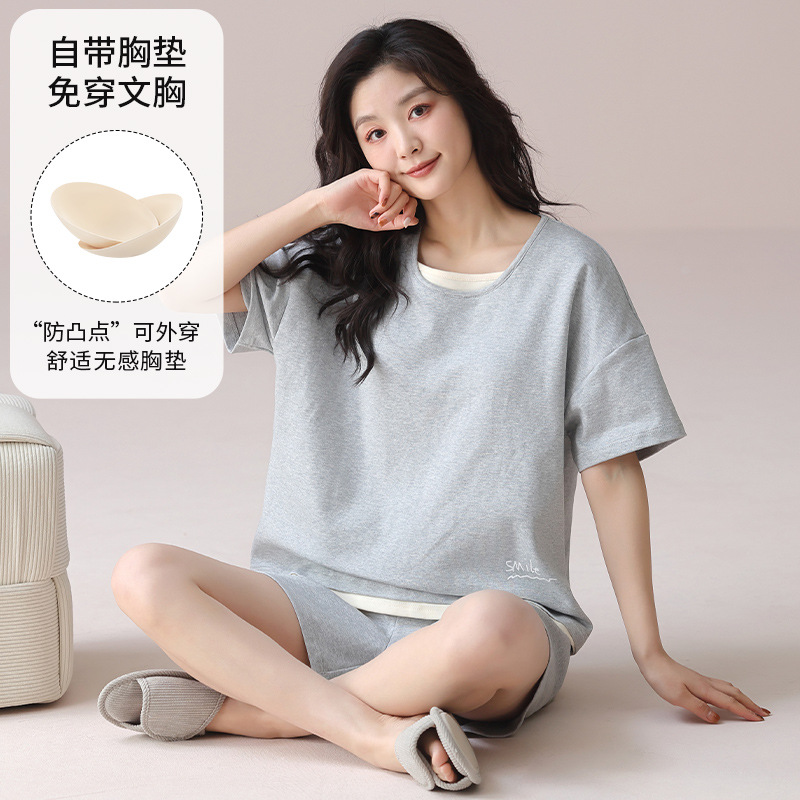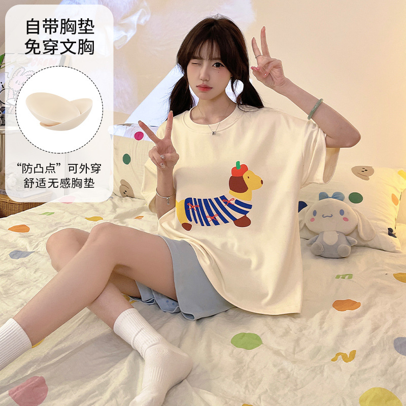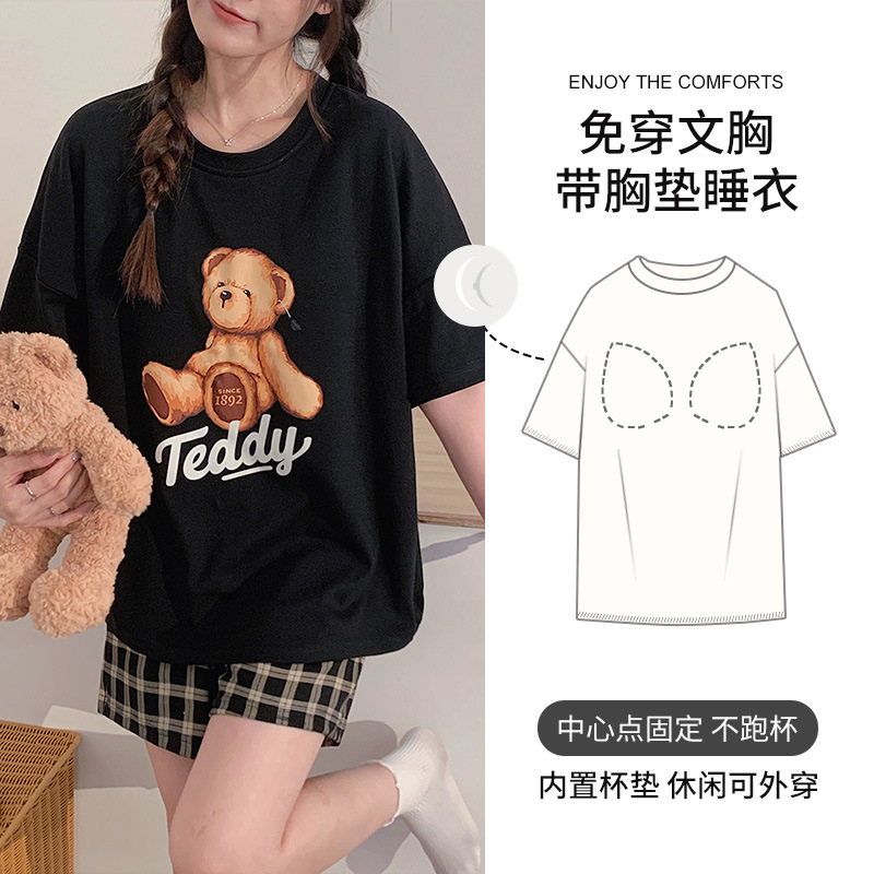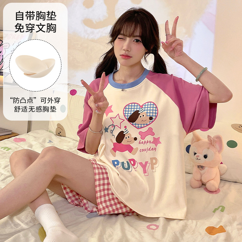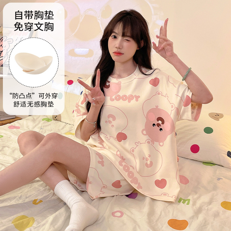 가슴 패드 잠옷 여성 여름 반팔 반바지 투피스 세트 의상 안티 범프 만화 여성 홈 의류스토어 가기