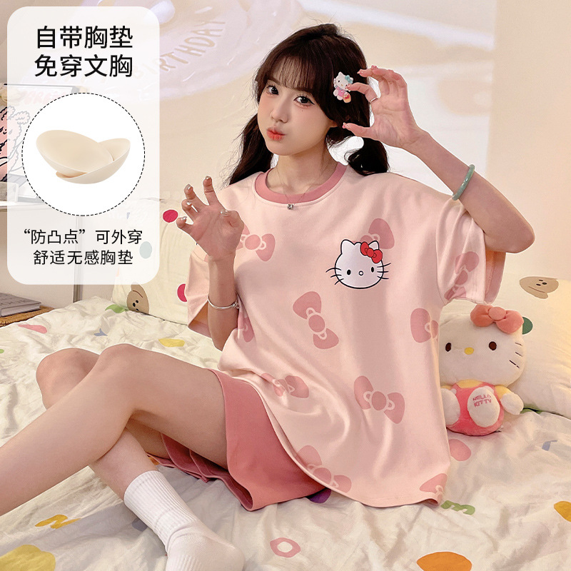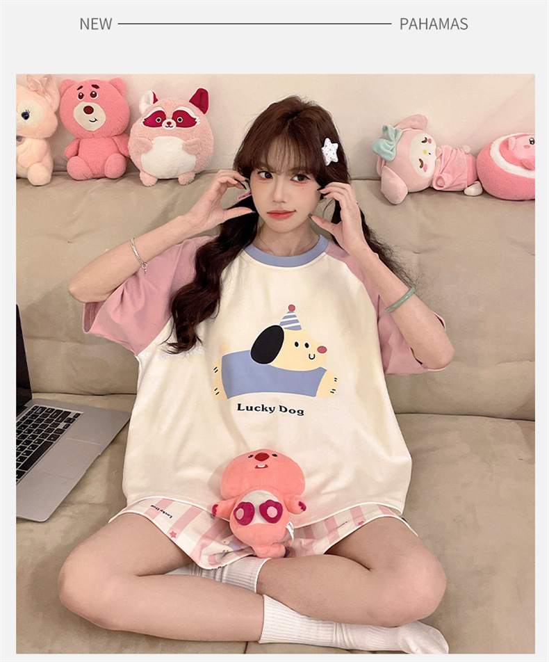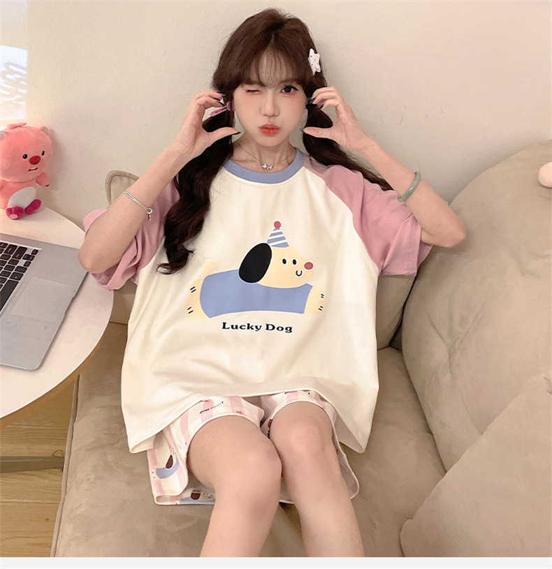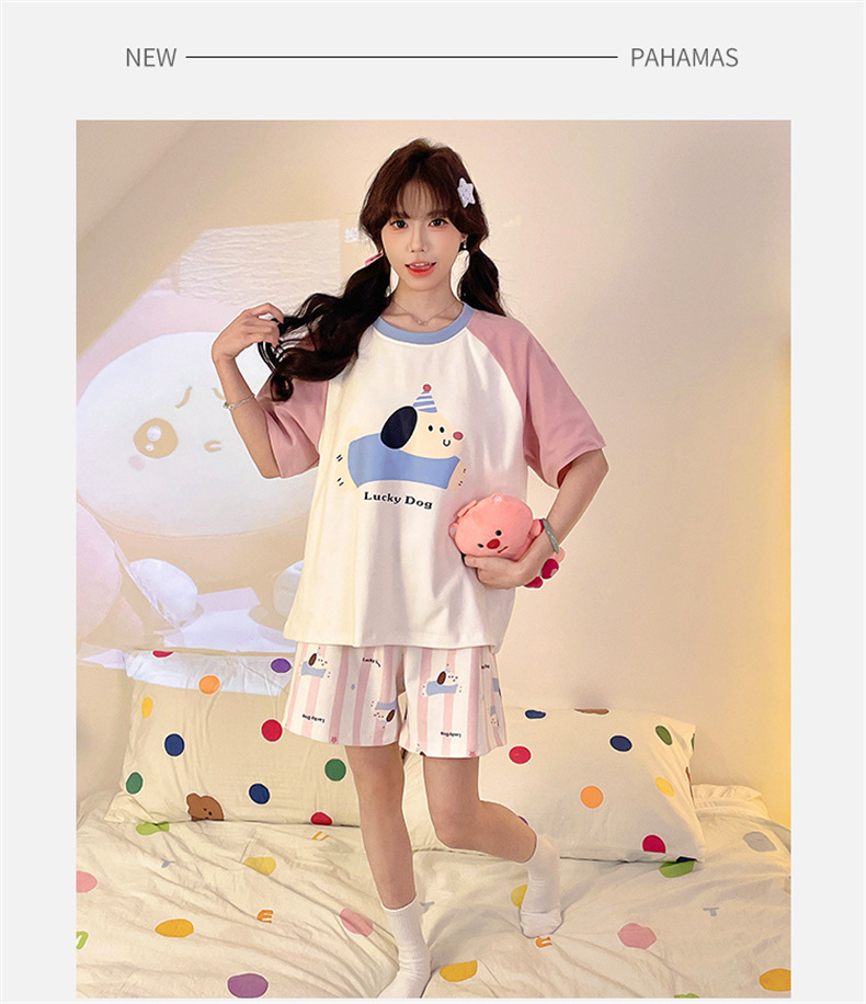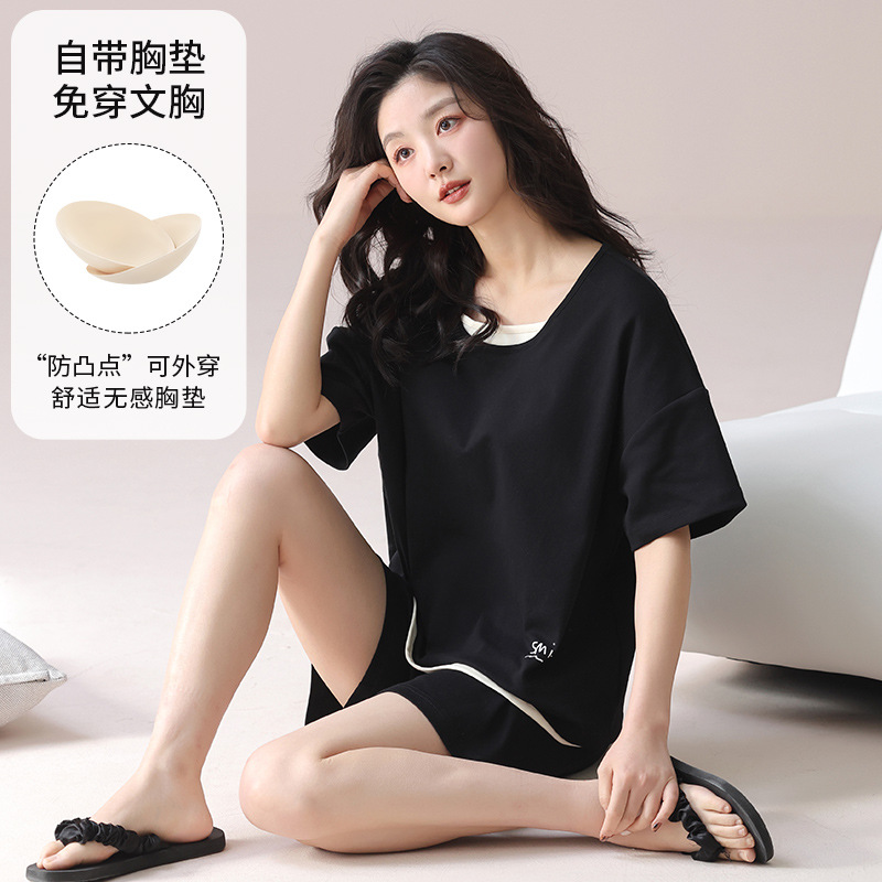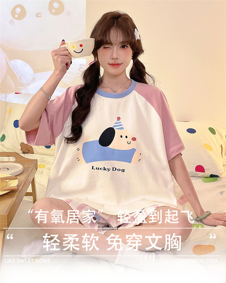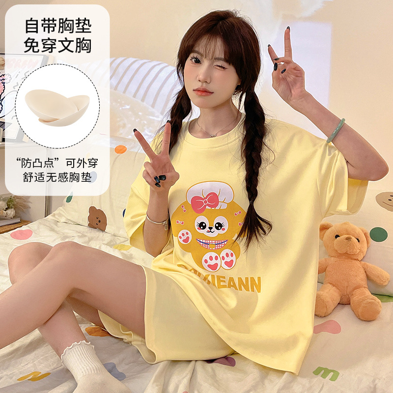 가슴 패드 잠옷 여성 여름 반팔 반바지 투피스 세트 의상 안티 범프 만화 여성 홈 의류스토어 가기