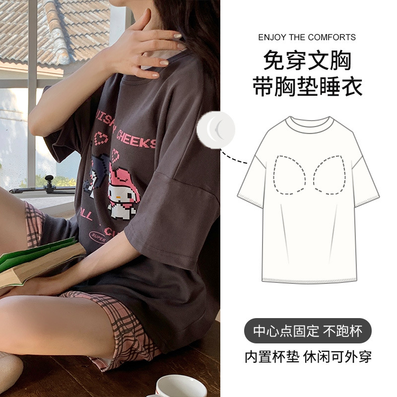 가슴 패드 잠옷 여성 여름 반팔 반바지 투피스 세트 의상 안티 범프 만화 여성 홈 의류