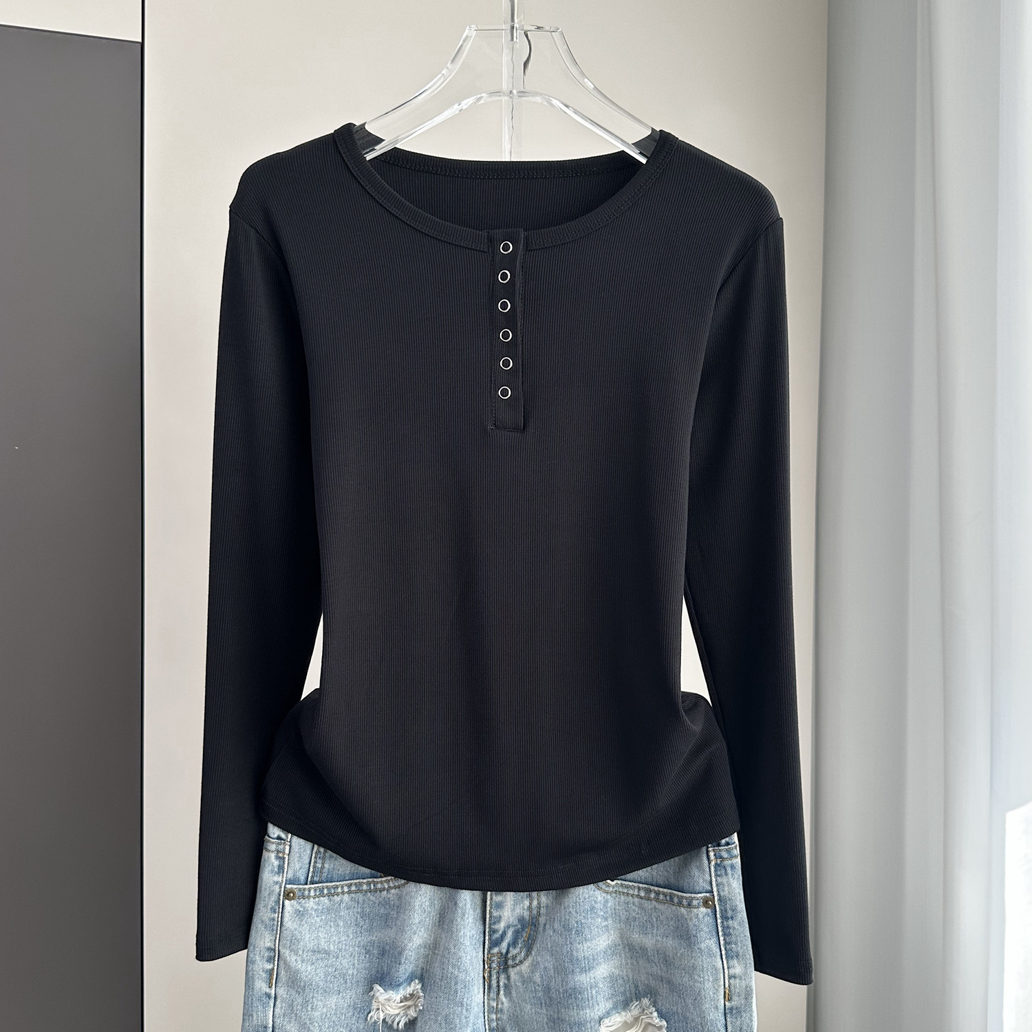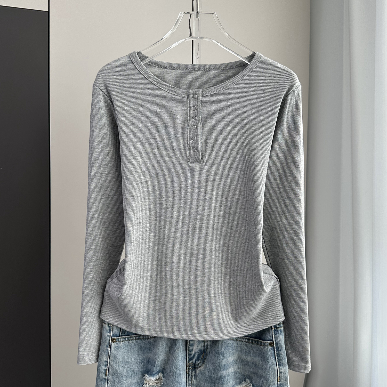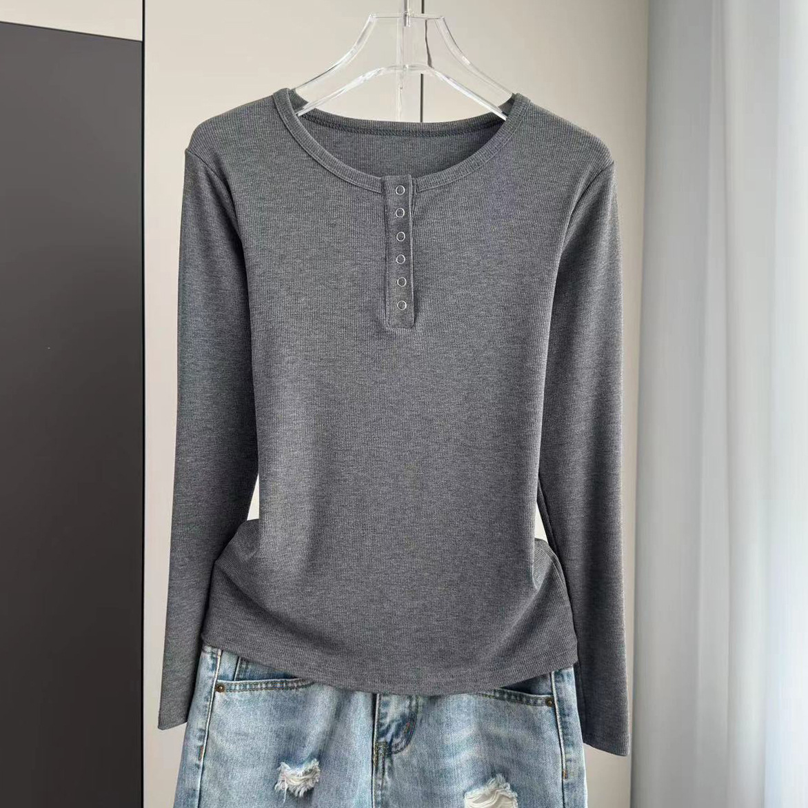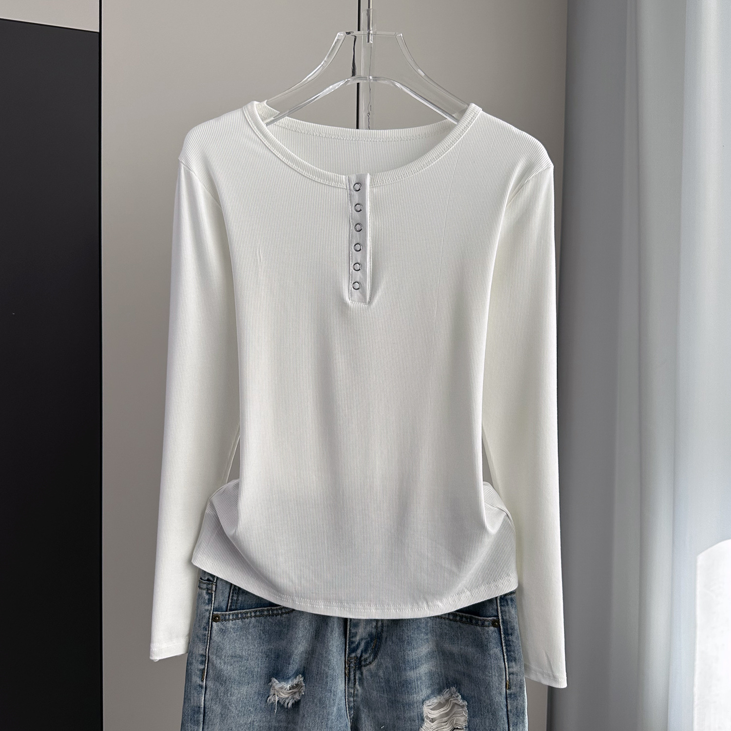 베이스 셔츠 여성의 봄과 가을 얇은 내부 탑 2025 새로운 스레드 어깨 슬림핏 슬리밍 긴팔 티셔츠스토어 가기