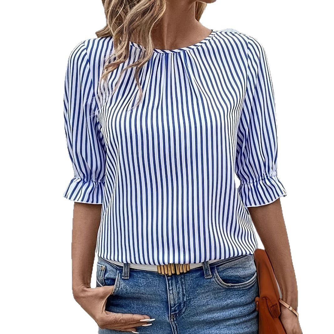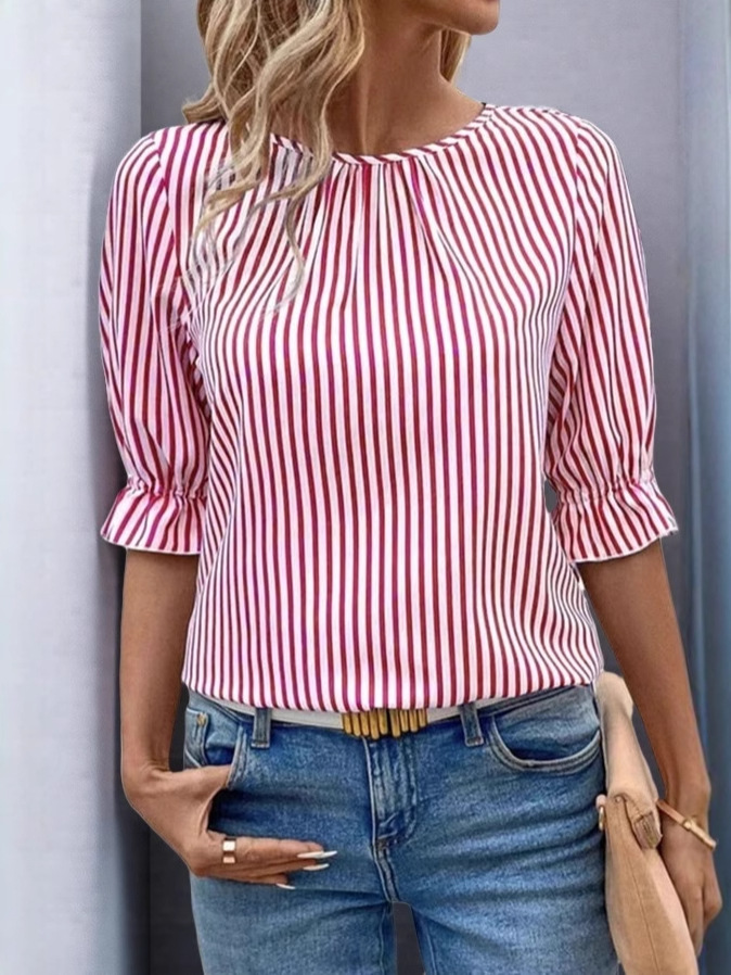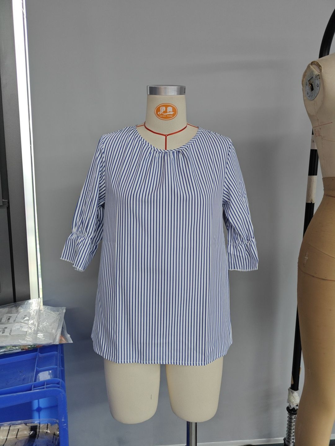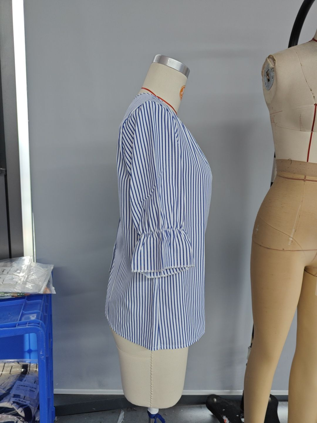 재고 국경 간 유럽과 미국 2025 봄과 여름 새로운 줄무늬 셔츠 대외 무역 여성 연꽃 잎 짧은 소매 상단 다시 버튼