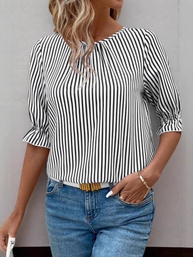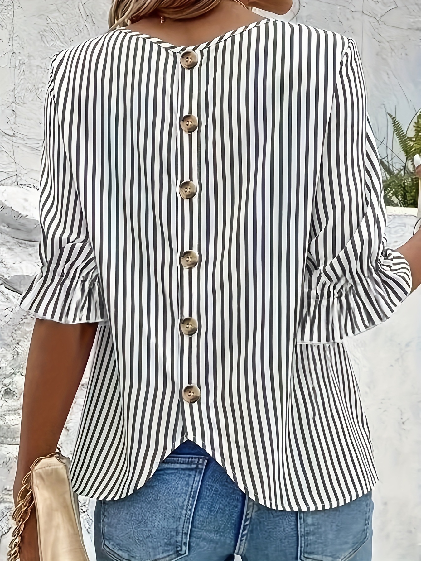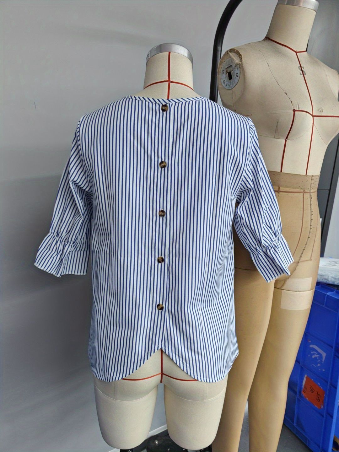 재고 국경 간 유럽과 미국 2025 봄과 여름 새로운 줄무늬 셔츠 대외 무역 여성 연꽃 잎 짧은 소매 상단 다시 버튼스토어 가기