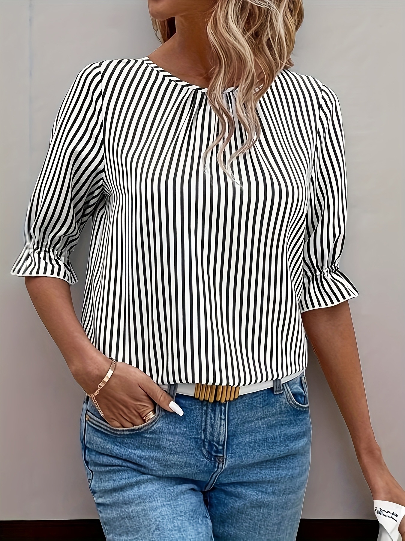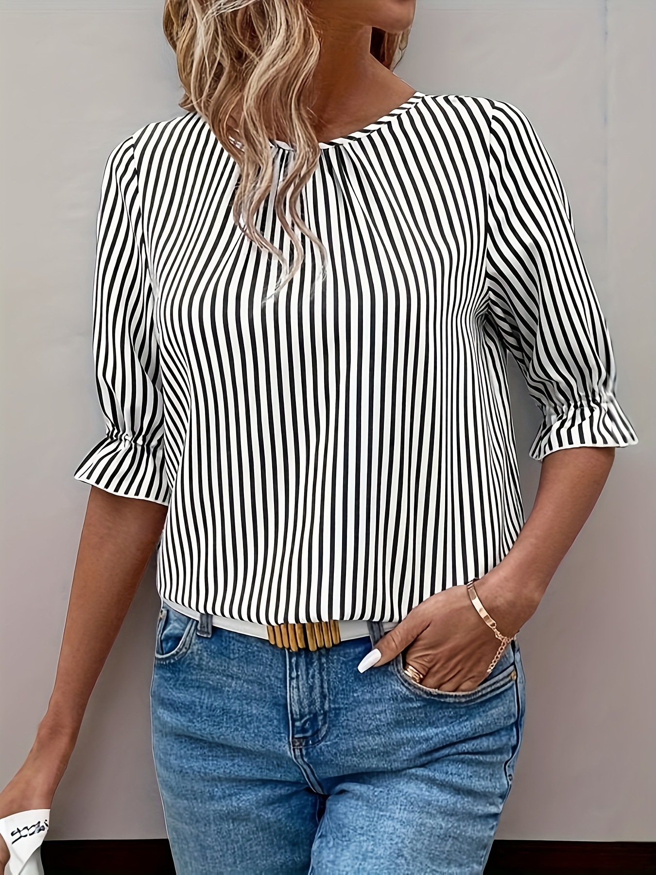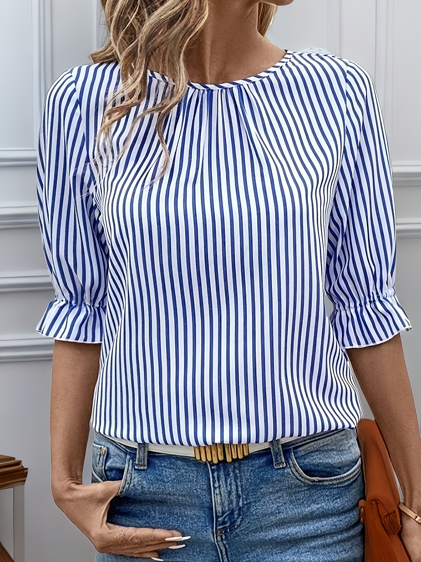 재고 국경 간 유럽과 미국 2025 봄과 여름 새로운 줄무늬 셔츠 대외 무역 여성 연꽃 잎 짧은 소매 상단 다시 버튼스토어 가기