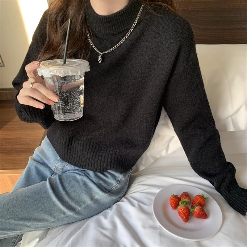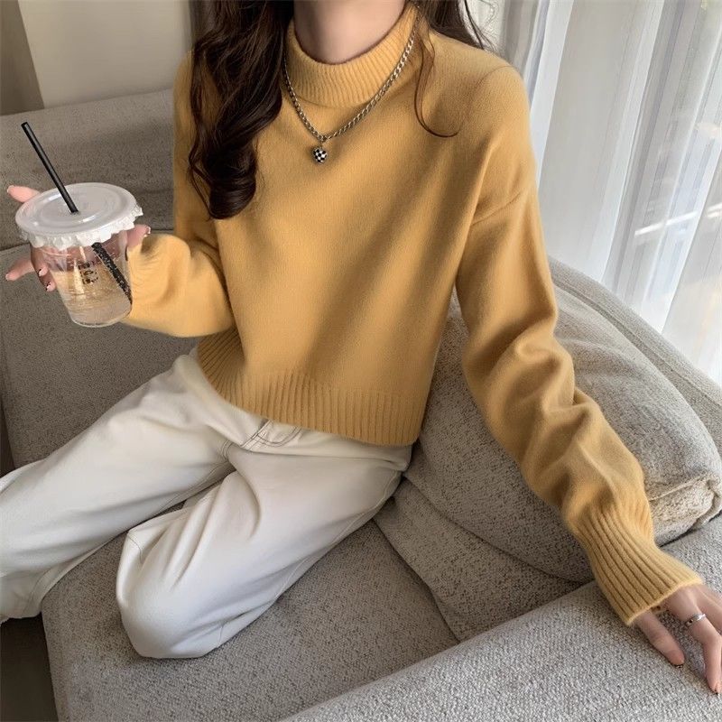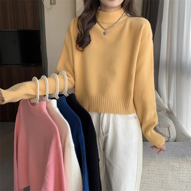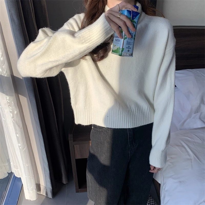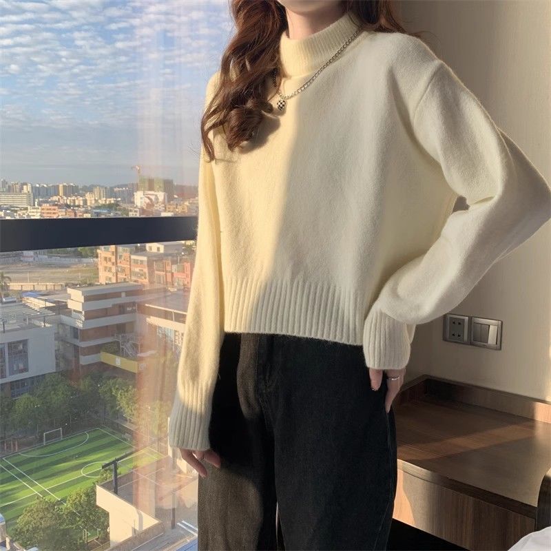 화이트 하프 하이 칼라 쇼트 탑 여성 스웨터 코트 내베이스 셔츠 가을 및 겨울 새로운 2025 작은 니트스토어 가기