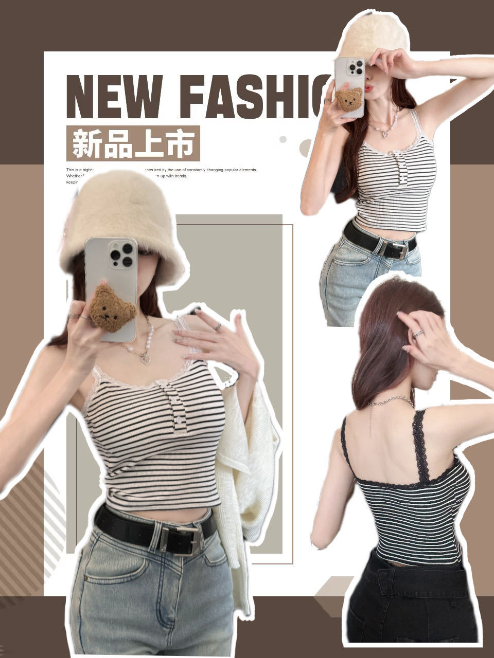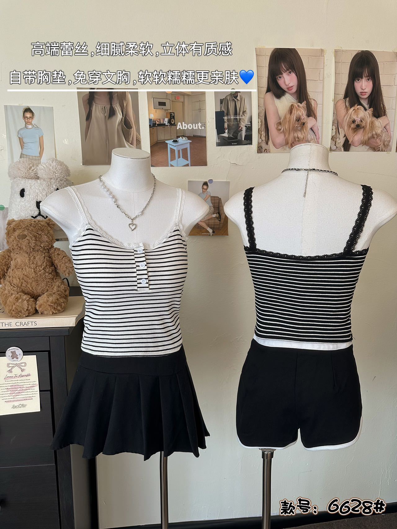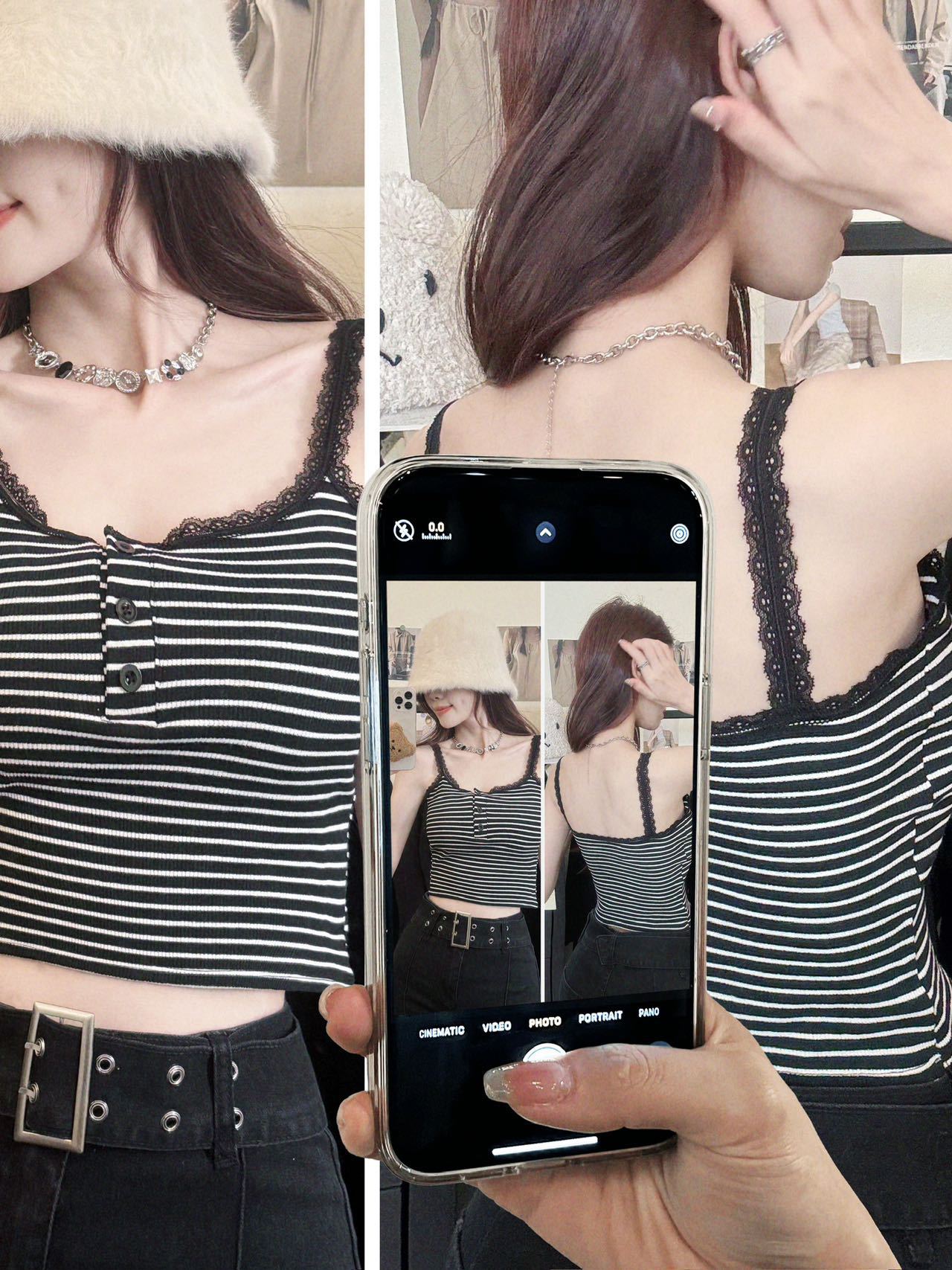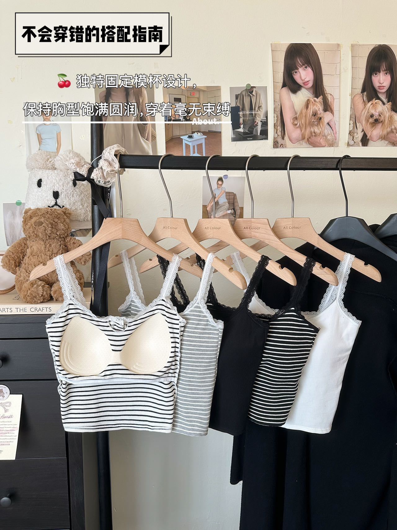 퓨어 올 매치 레이스 스트라이프 버튼 카미 솔 여성용 달콤하고 핫 슬림 핏 슬리밍 탑, 가슴 패드베이스 셔츠스토어 가기