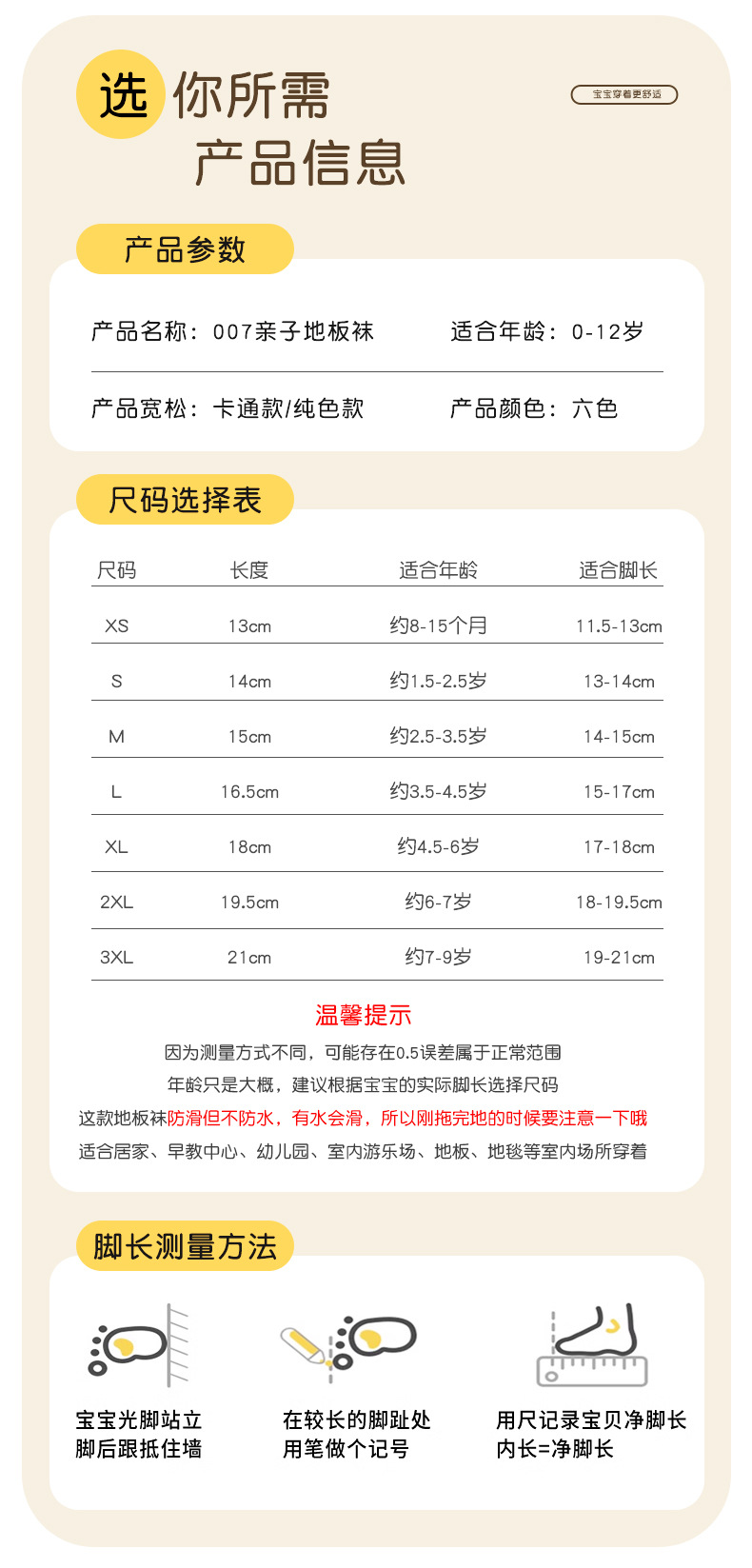 怎么选择合适的鞋码?:宝宝的脚需要留出一定的活动空间,建议按照宝宝净脚长加0.5cm-1cm选鞋码,如宝宝净脚长12.5cm,您可以选鞋底长13.5cm的鞋子,脚偏胖建议选大一码的(仅供参考)