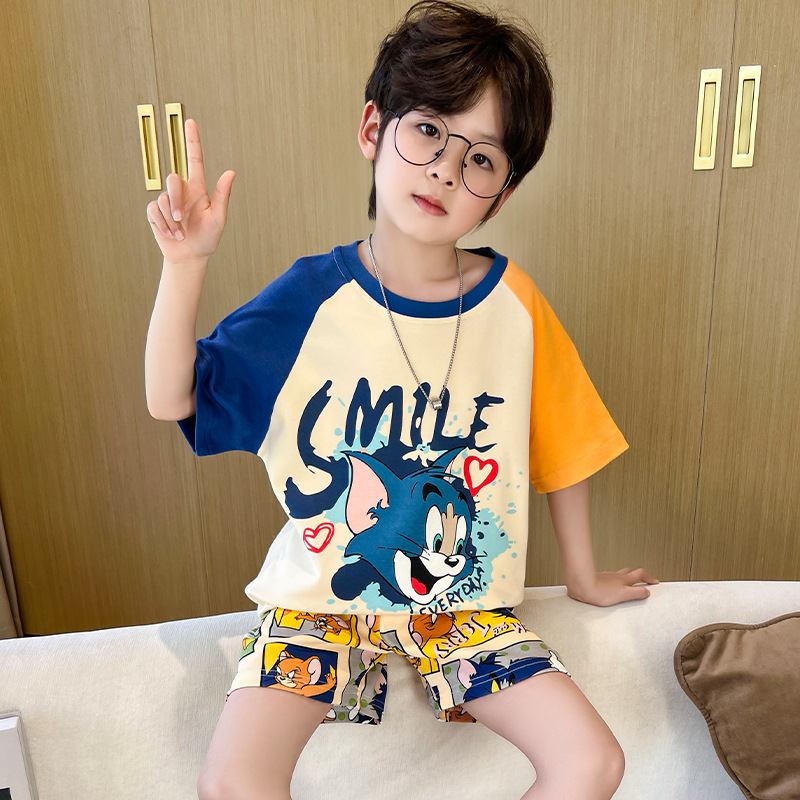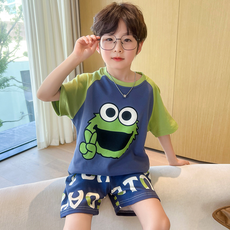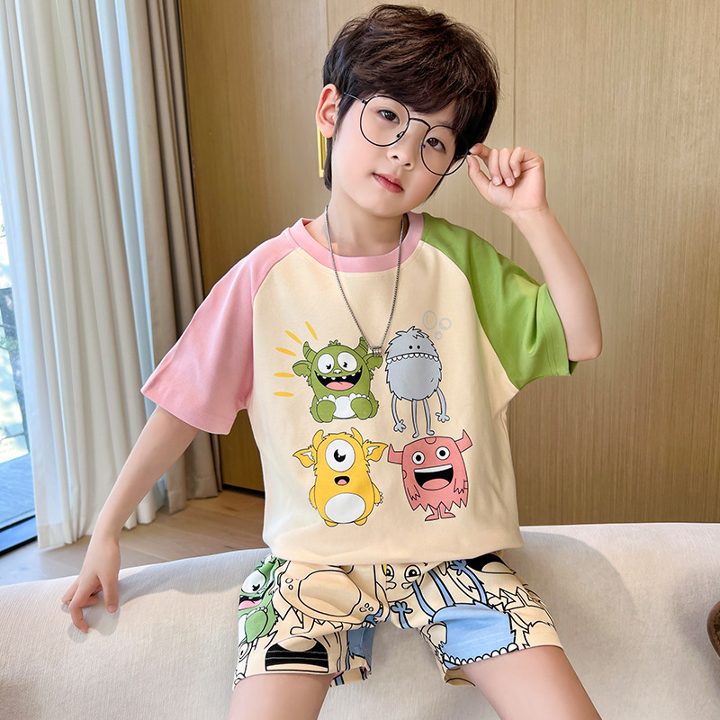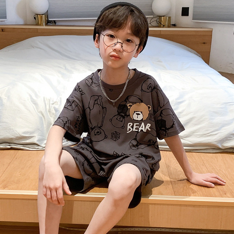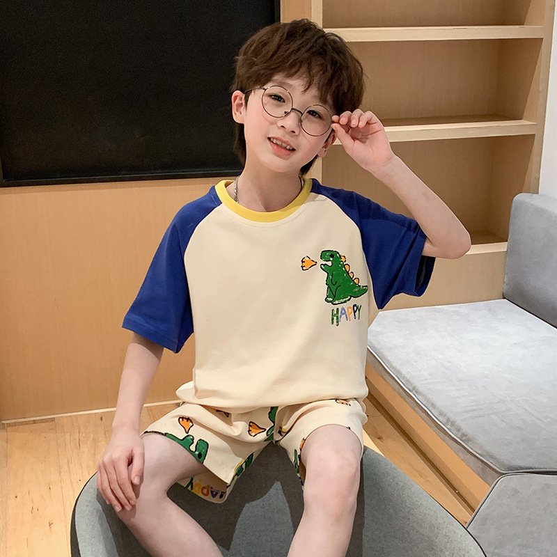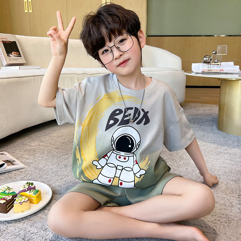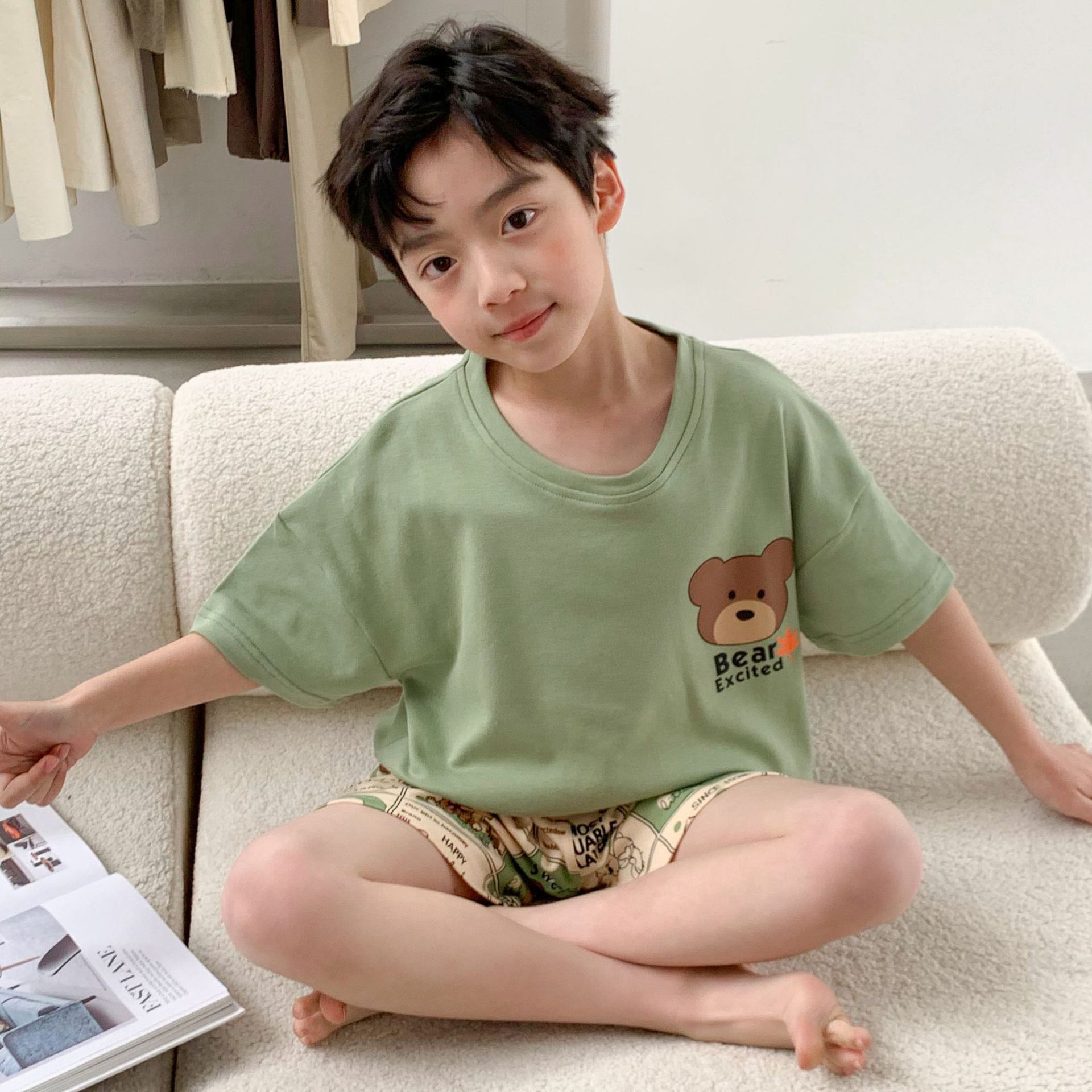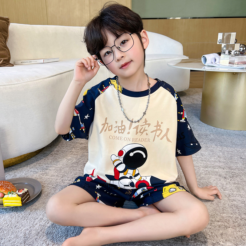 소년 잠옷 어린이 여름 100% 순면 반팔 얇은 소년 중 · 대형 소년 청소년 홈 의류 만화 세트