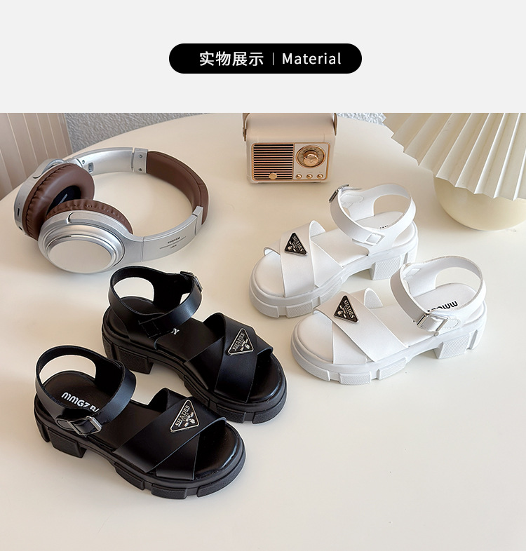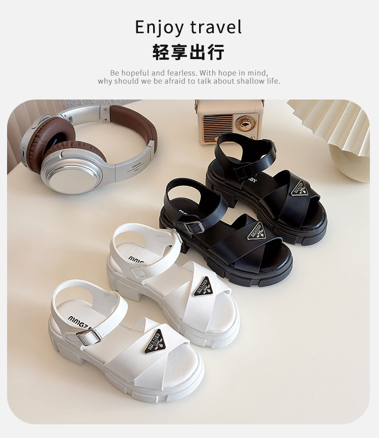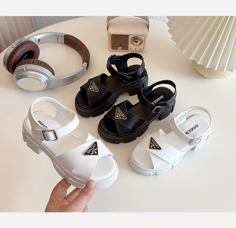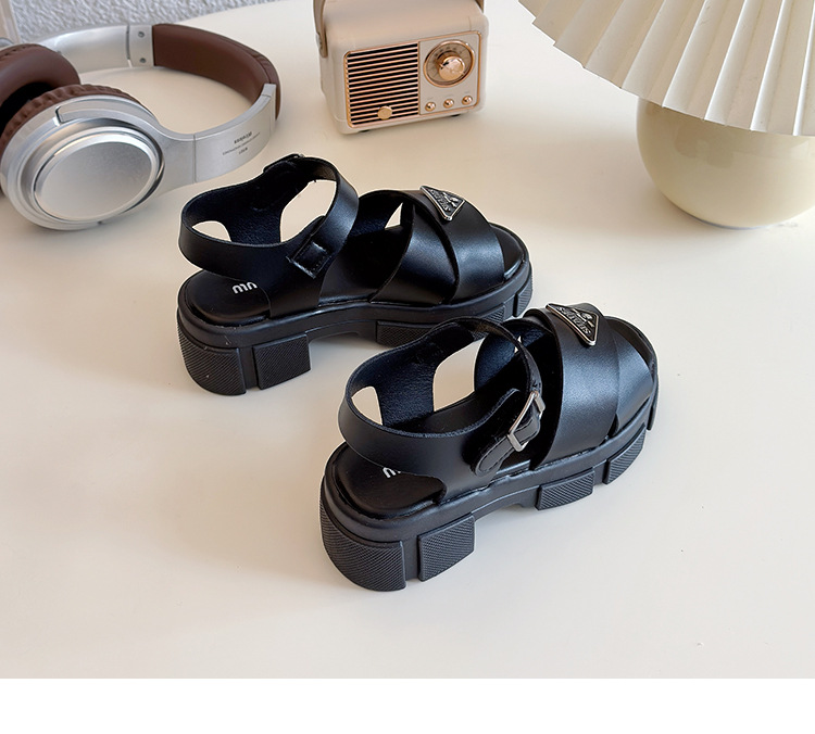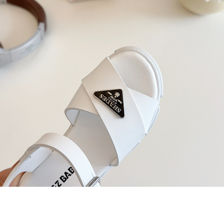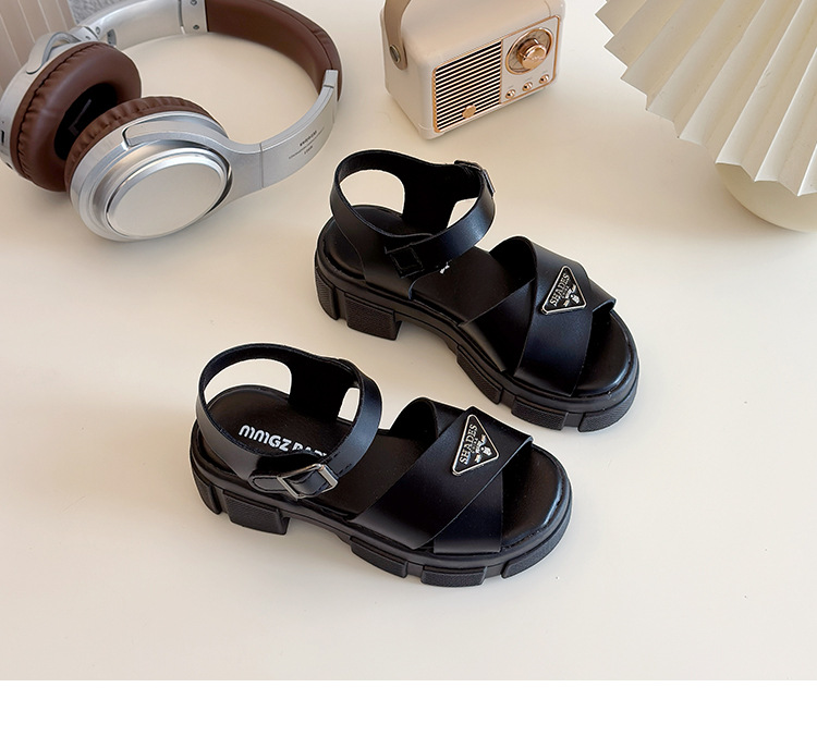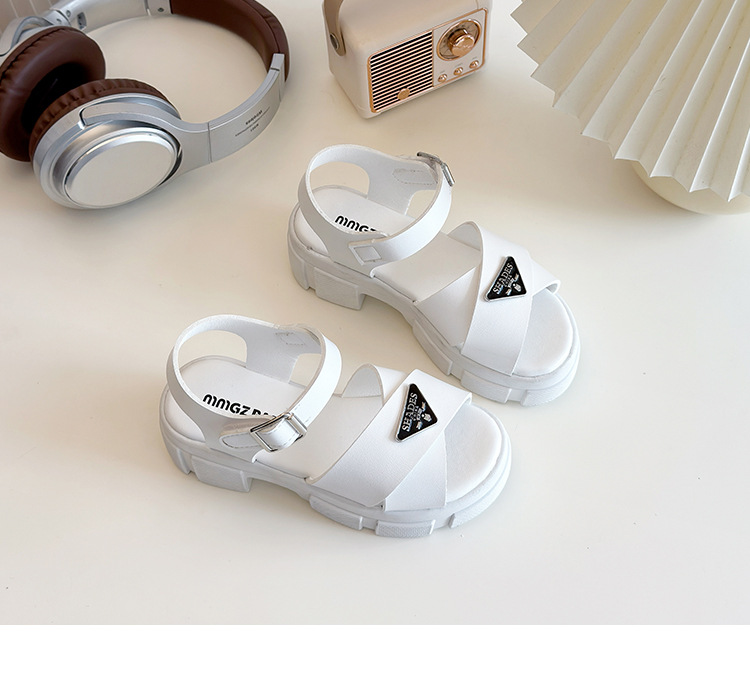 2025 여성 세련 된 금속 삼각형 버클 샌들 한국 스타일 소녀 벨크로 두꺼운 바닥 비치 슈즈