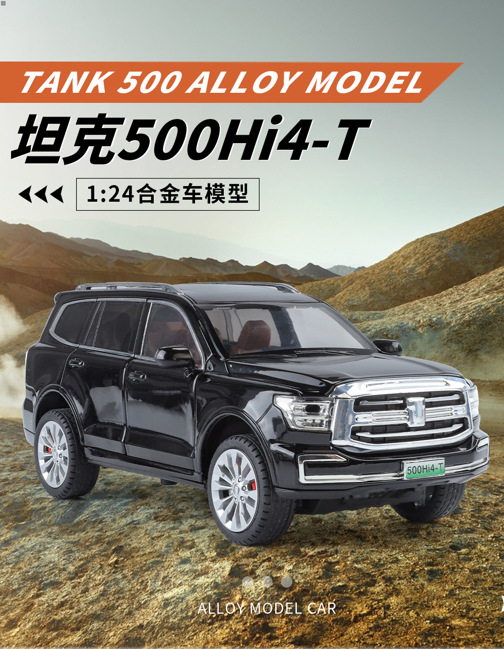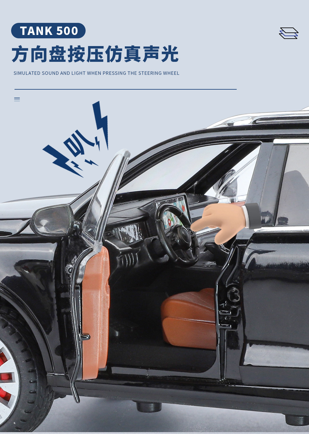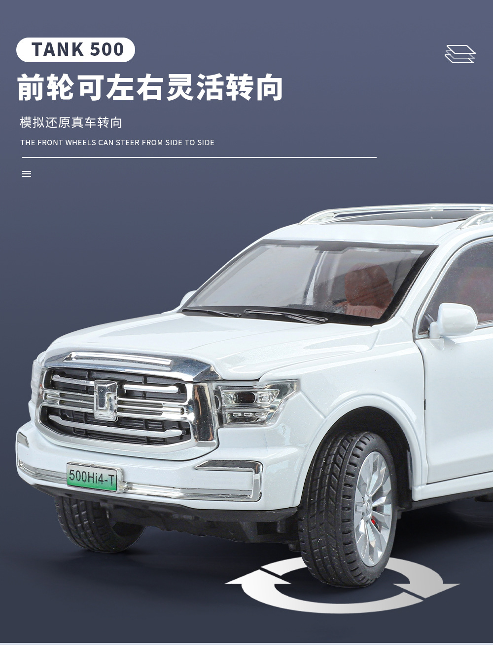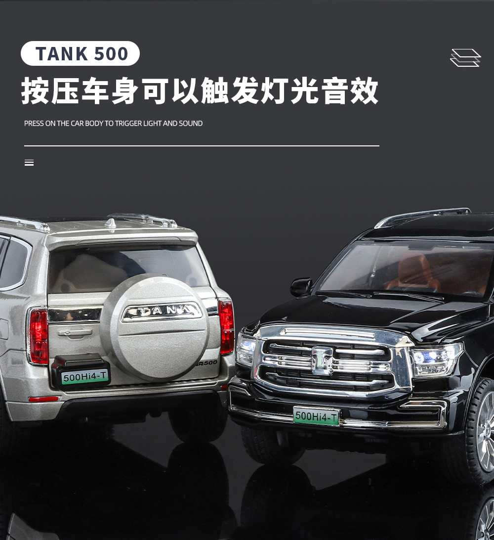 시뮬레이션 1:24 탱크 500 오프로드 합금 자동차 모델 홈 장식품 사운드 효과 백 포스 소년 장난감 도매
