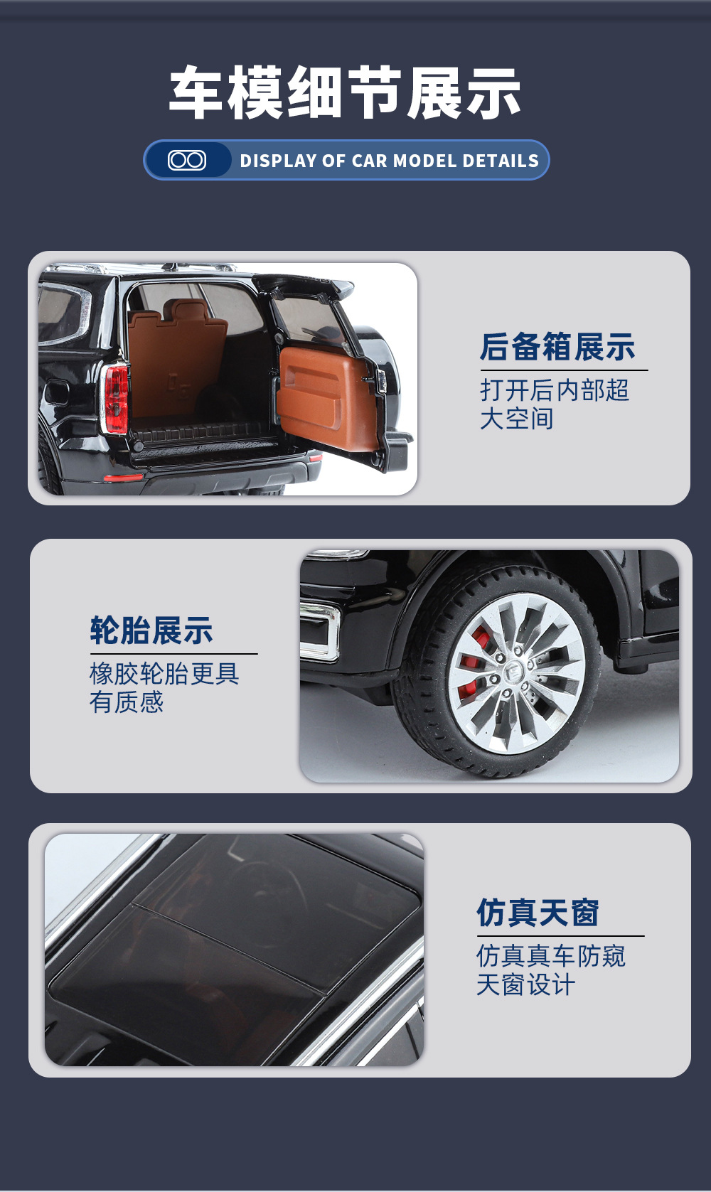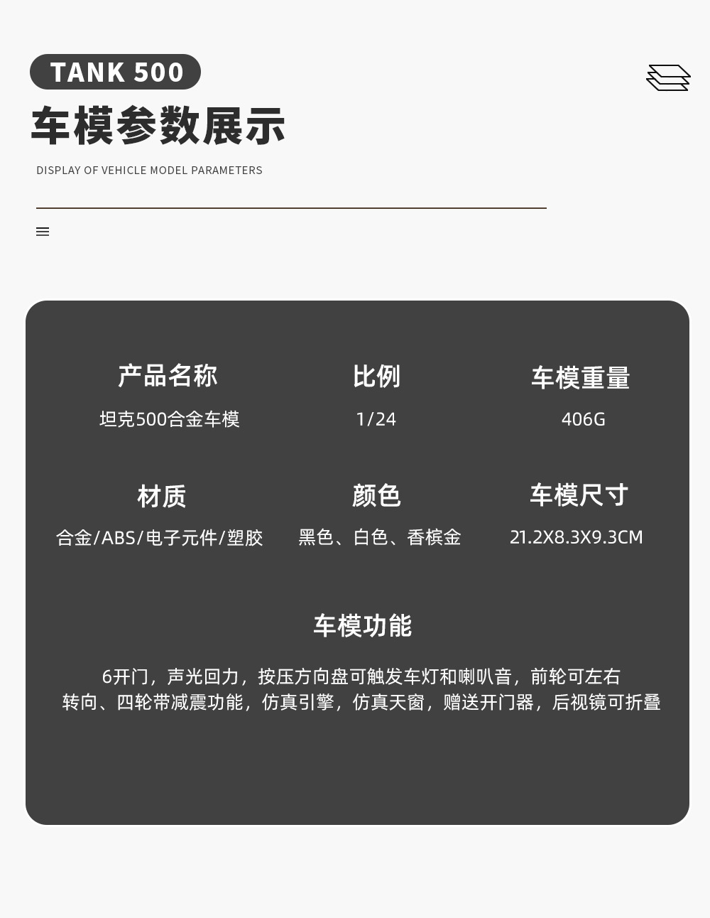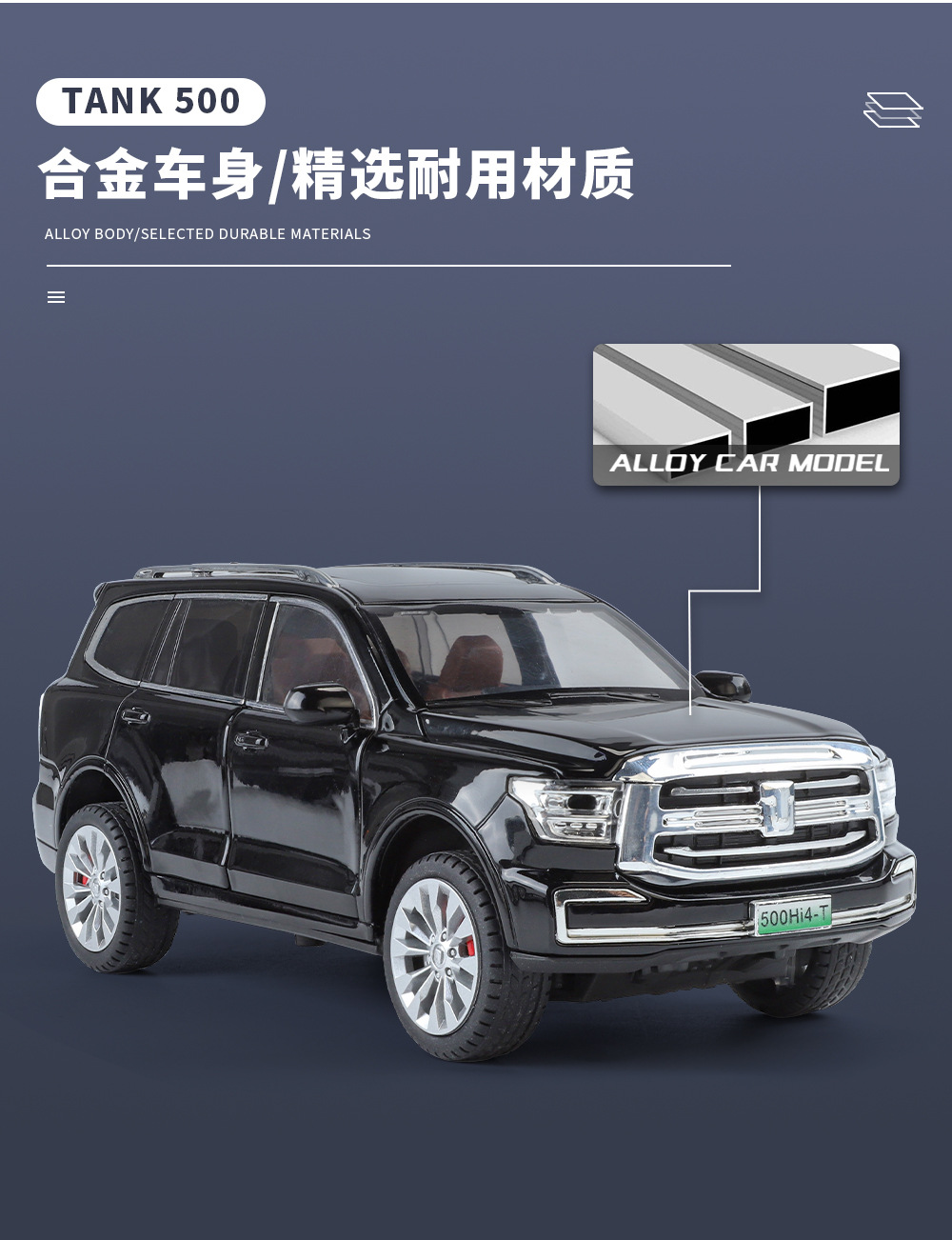 시뮬레이션 1:24 탱크 500 오프로드 합금 자동차 모델 홈 장식품 사운드 효과 백 포스 소년 장난감 도매