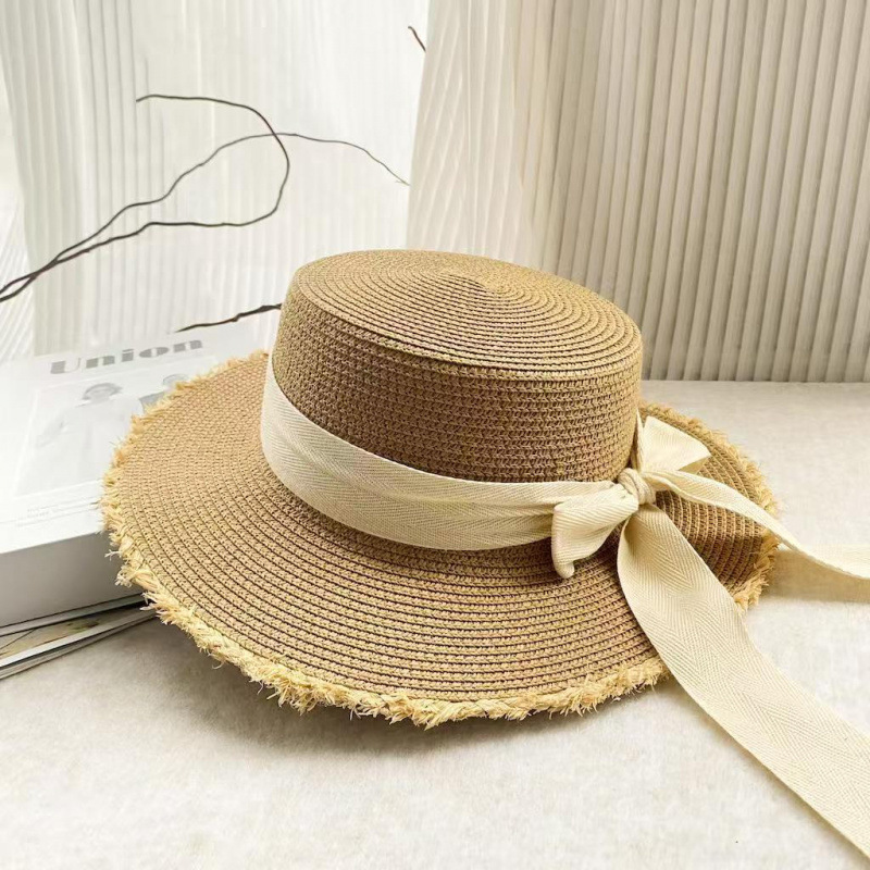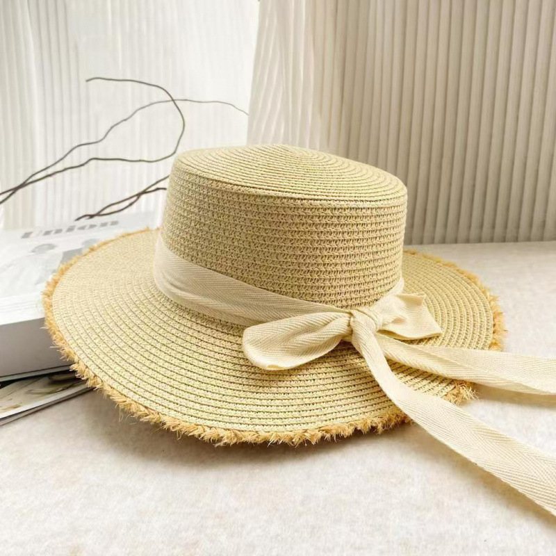 • 로우 엣지 보우 밀짚모자 베이지 라이스 벨트