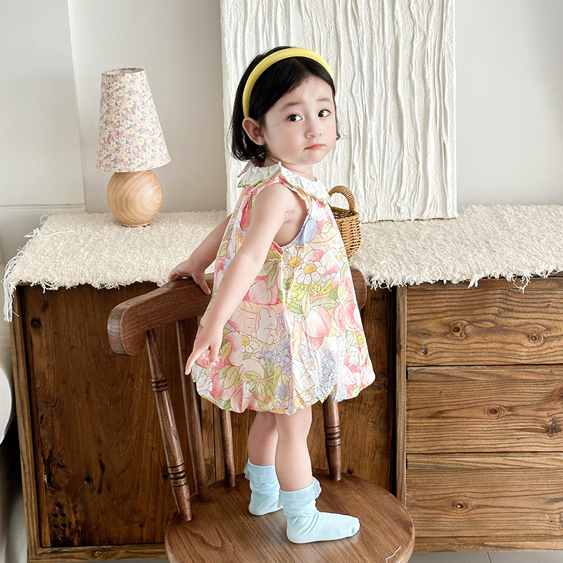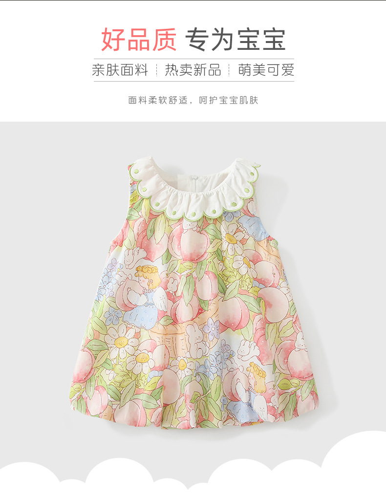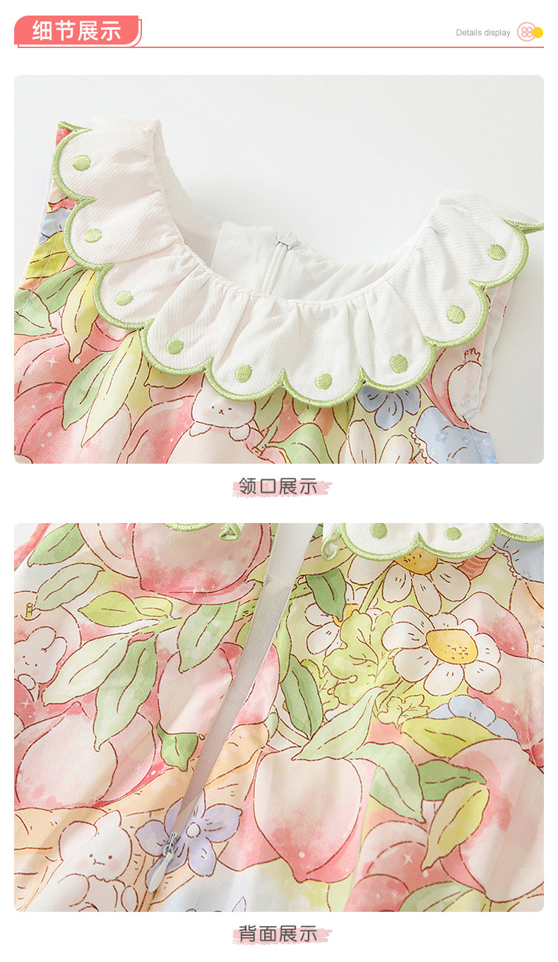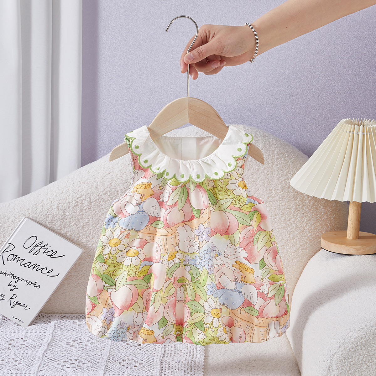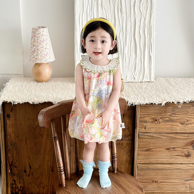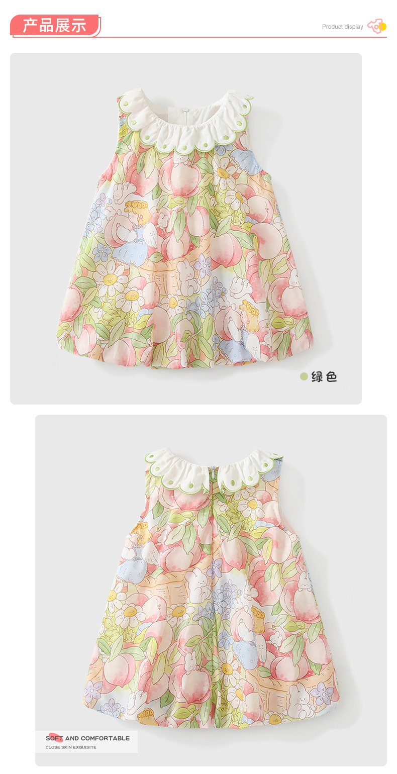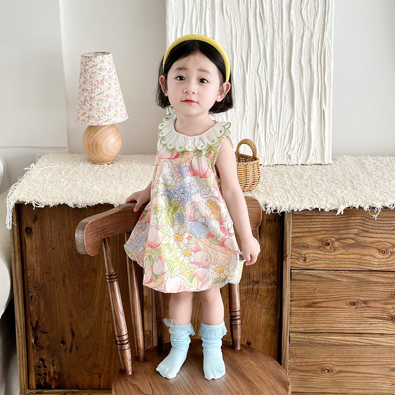 여름 어린이 착용 새로운 여성 보물 조끼 원피스 웨이브 칼라 전체 인쇄 소녀 스커트 어린이 여름 복장