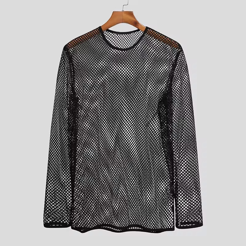 국경을 넘는 유럽과 미국 남성 메쉬 긴팔 어깨 원근법 티셔츠 섹시한 밤 옷 피트니스 통기성 Fishnet 할로우 티셔츠