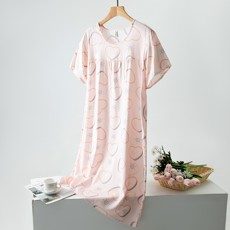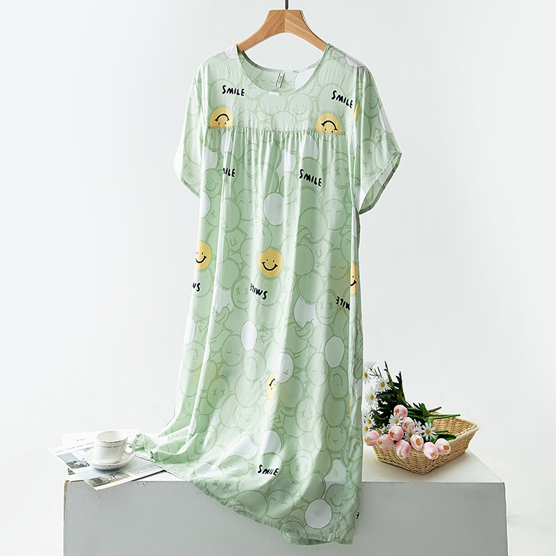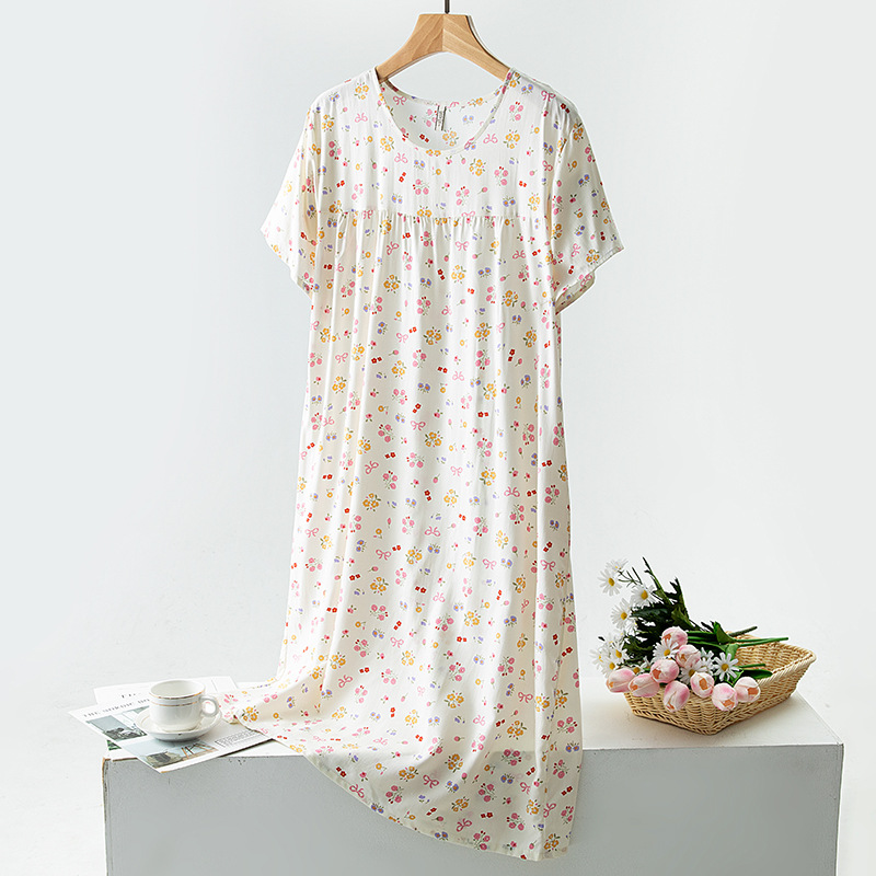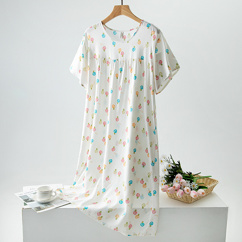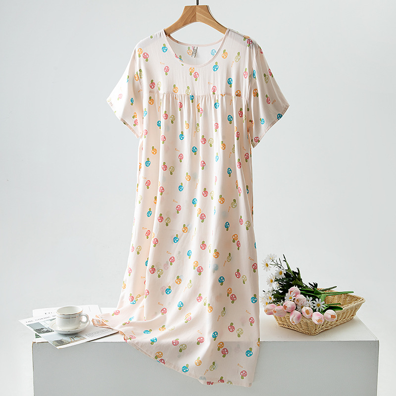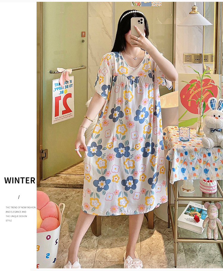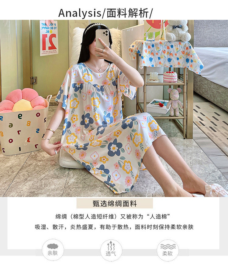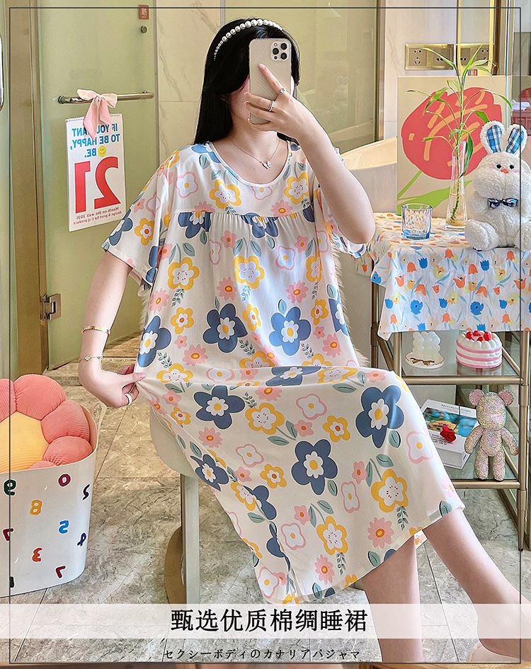 면 실크 잠옷 여성의 여름 얇은 반팔 원피스 달콤한 느슨한 인공 면 플러스 사이즈 잠옷 봄과 가을 홈 옷스토어 가기
