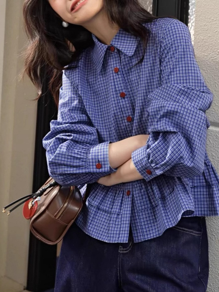 미우 블루 체크 셔츠 여성용 2026 봄 신상 러플 긴팔 셔츠 탑 숏 스타일 가을스토어 가기