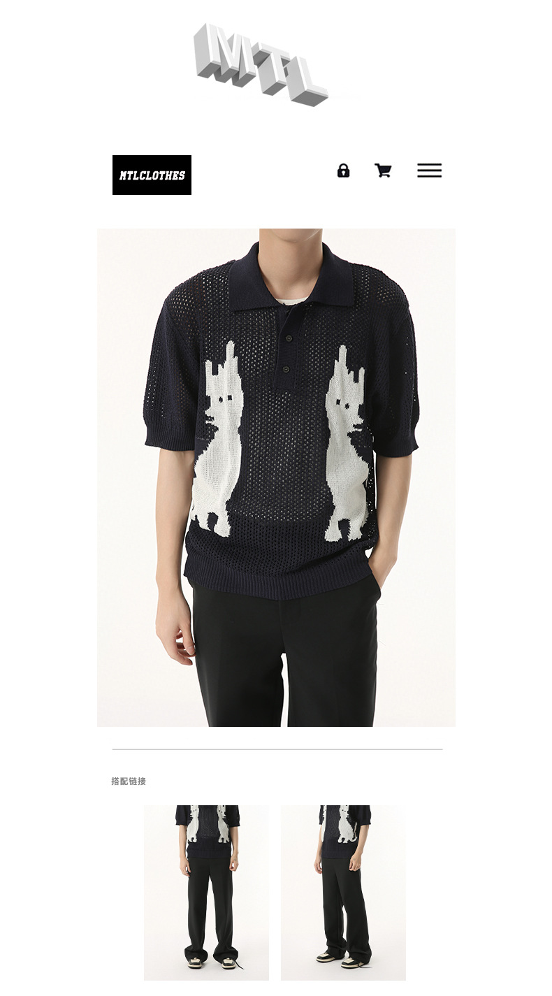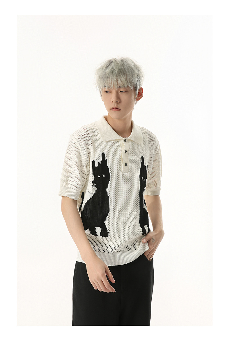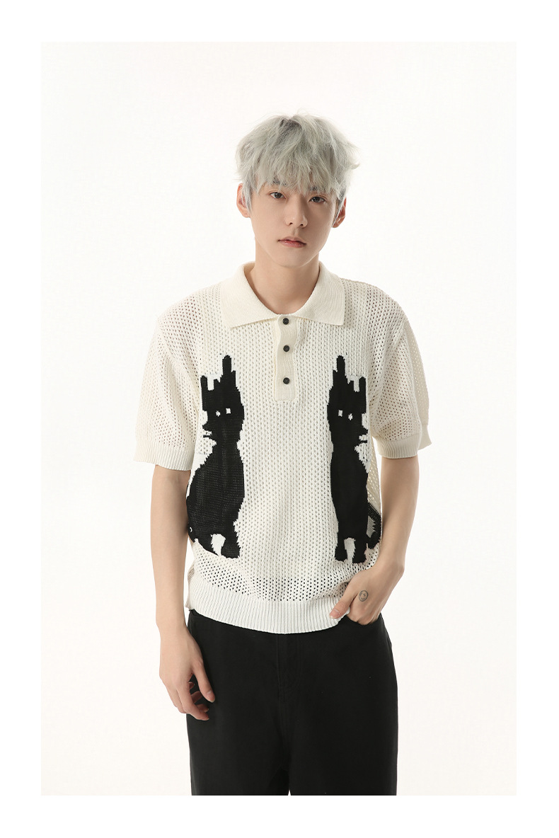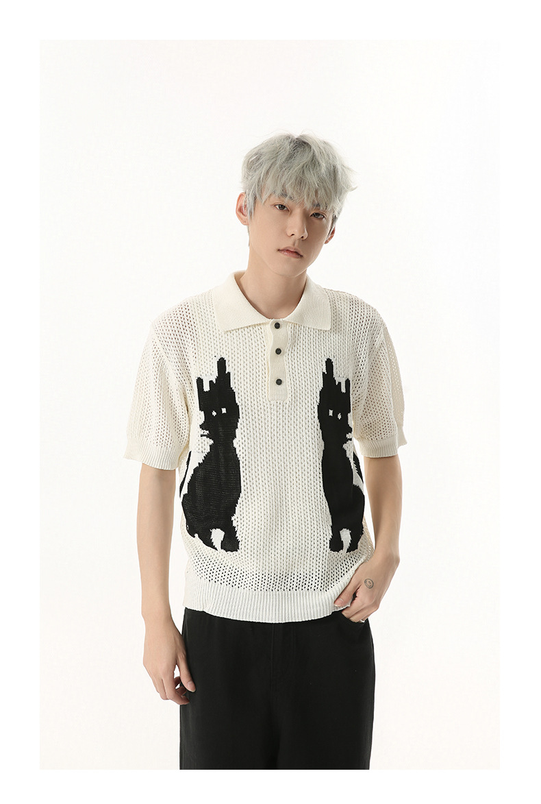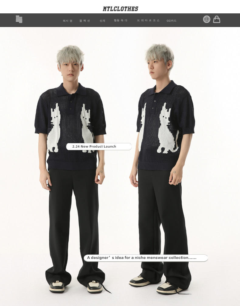 MTLCLOTHES 남성용 | 한국 복고풍 재미 만화 새끼 고양이 색 대비 디자인 옷깃 폴로 니트 짧은 소매스토어 가기