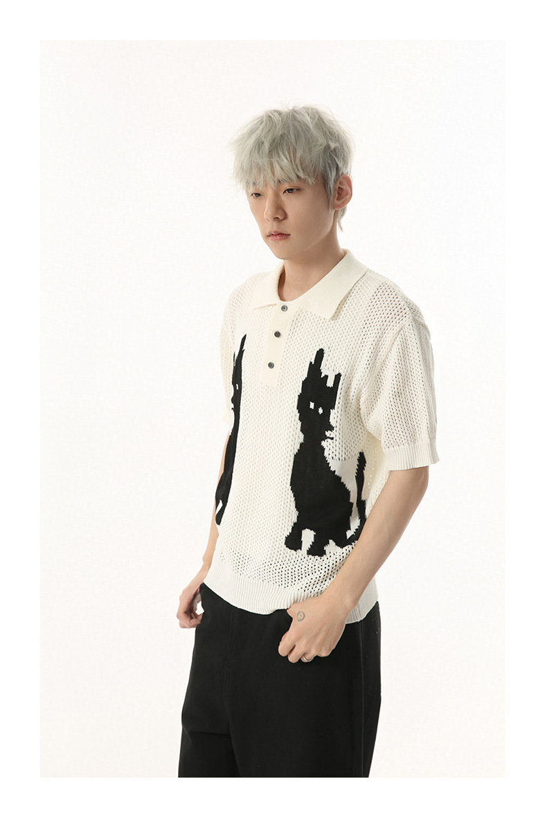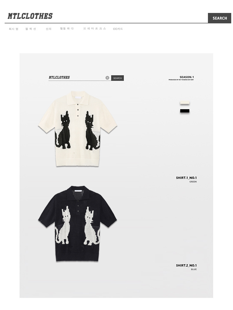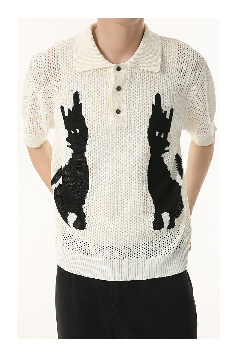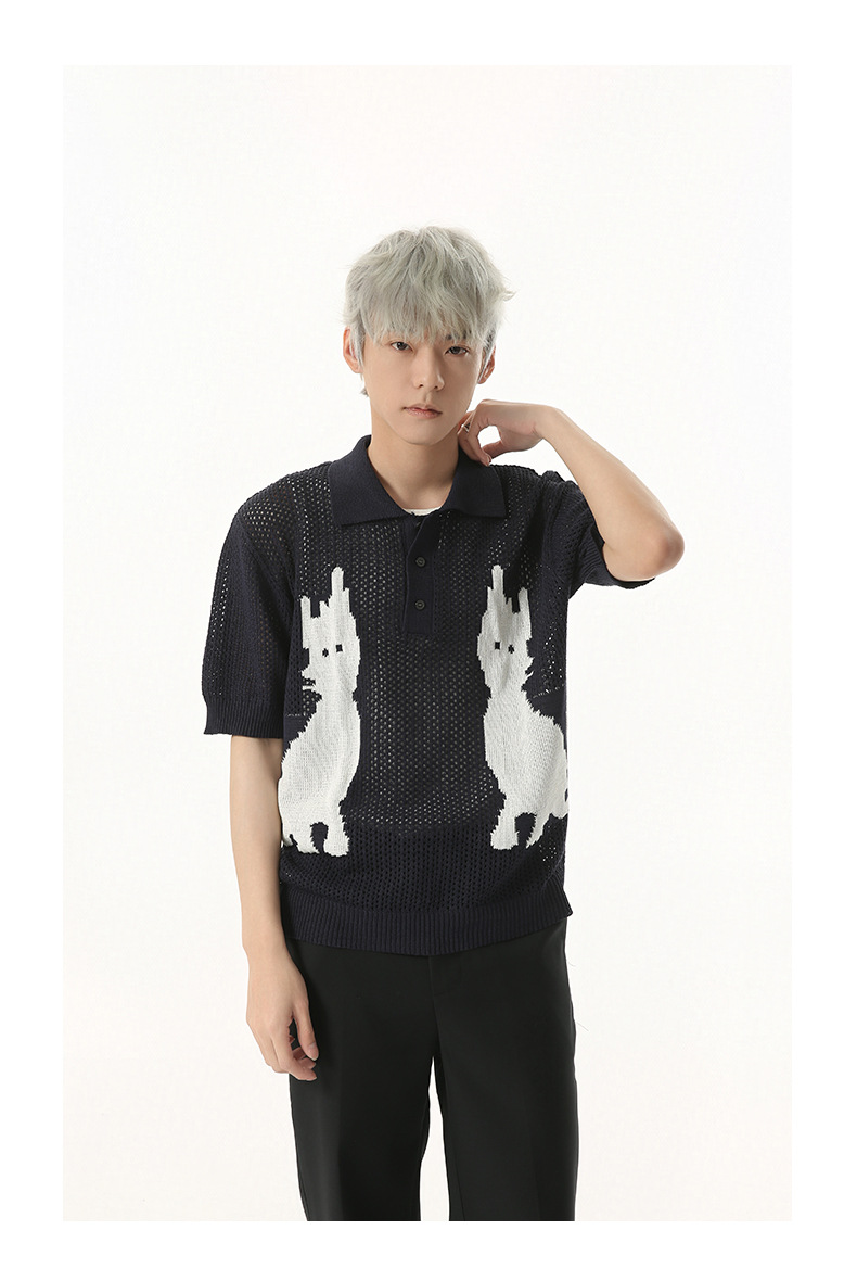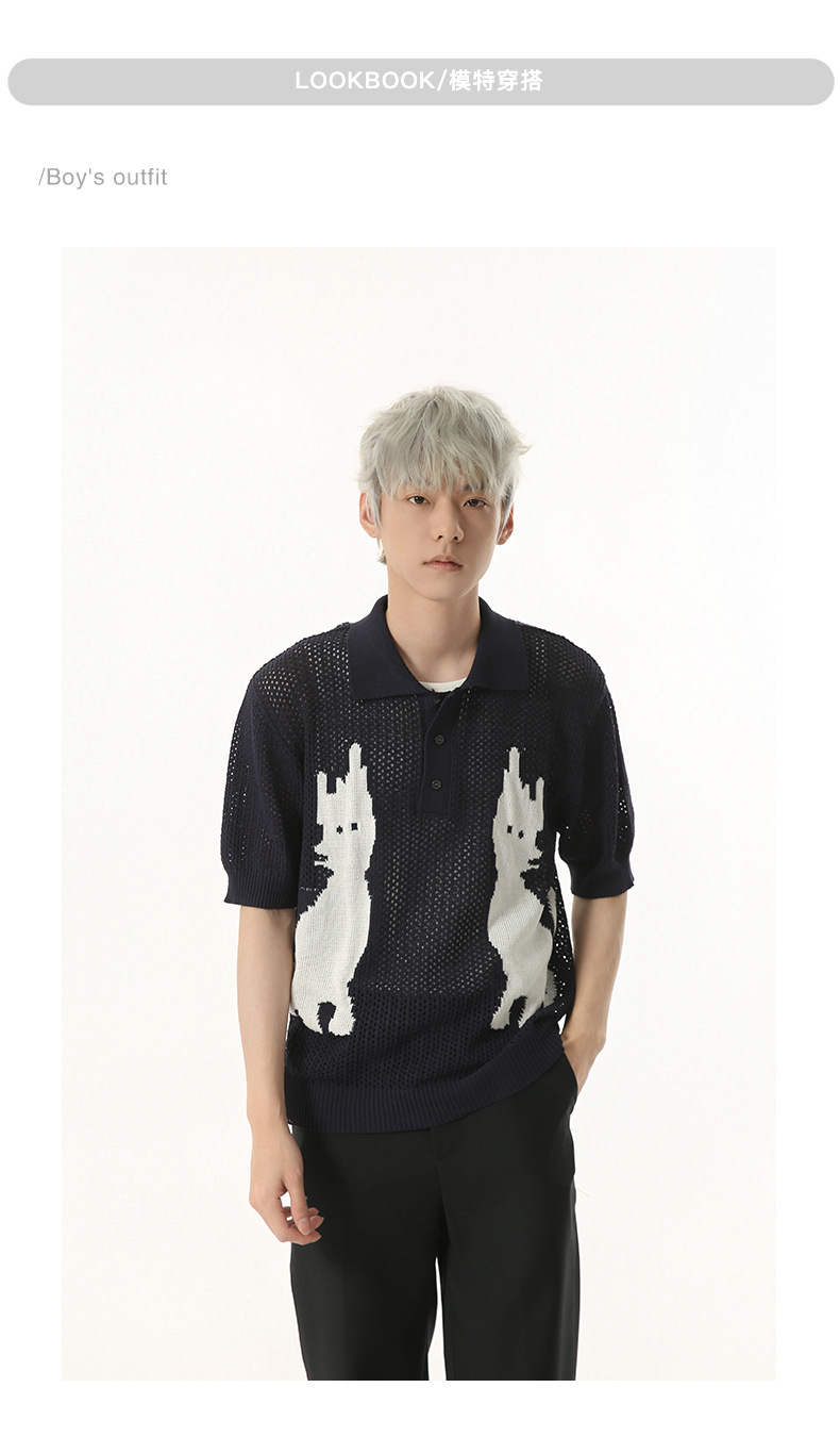 MTLCLOTHES 남성용 | 한국 복고풍 재미 만화 새끼 고양이 색 대비 디자인 옷깃 폴로 니트 짧은 소매스토어 가기