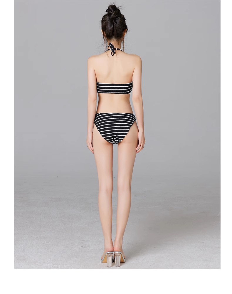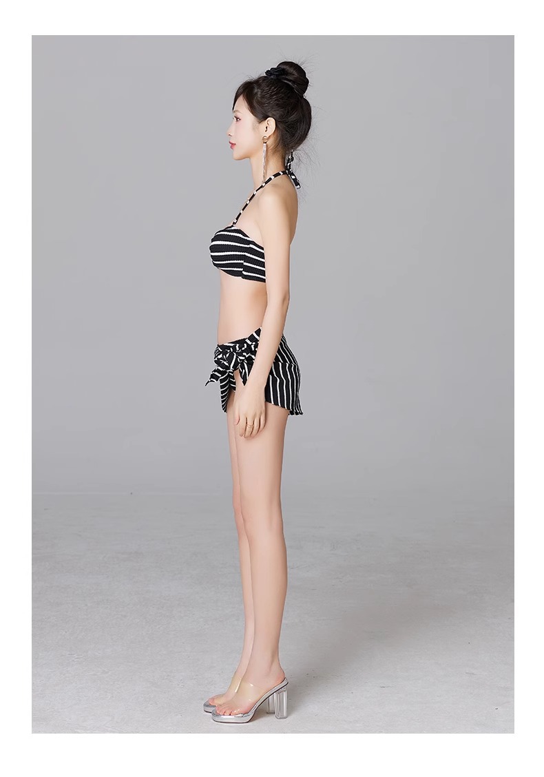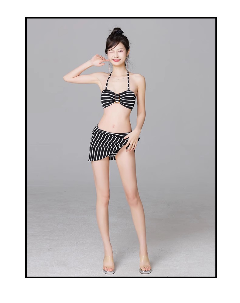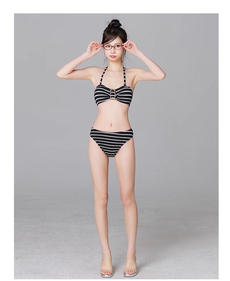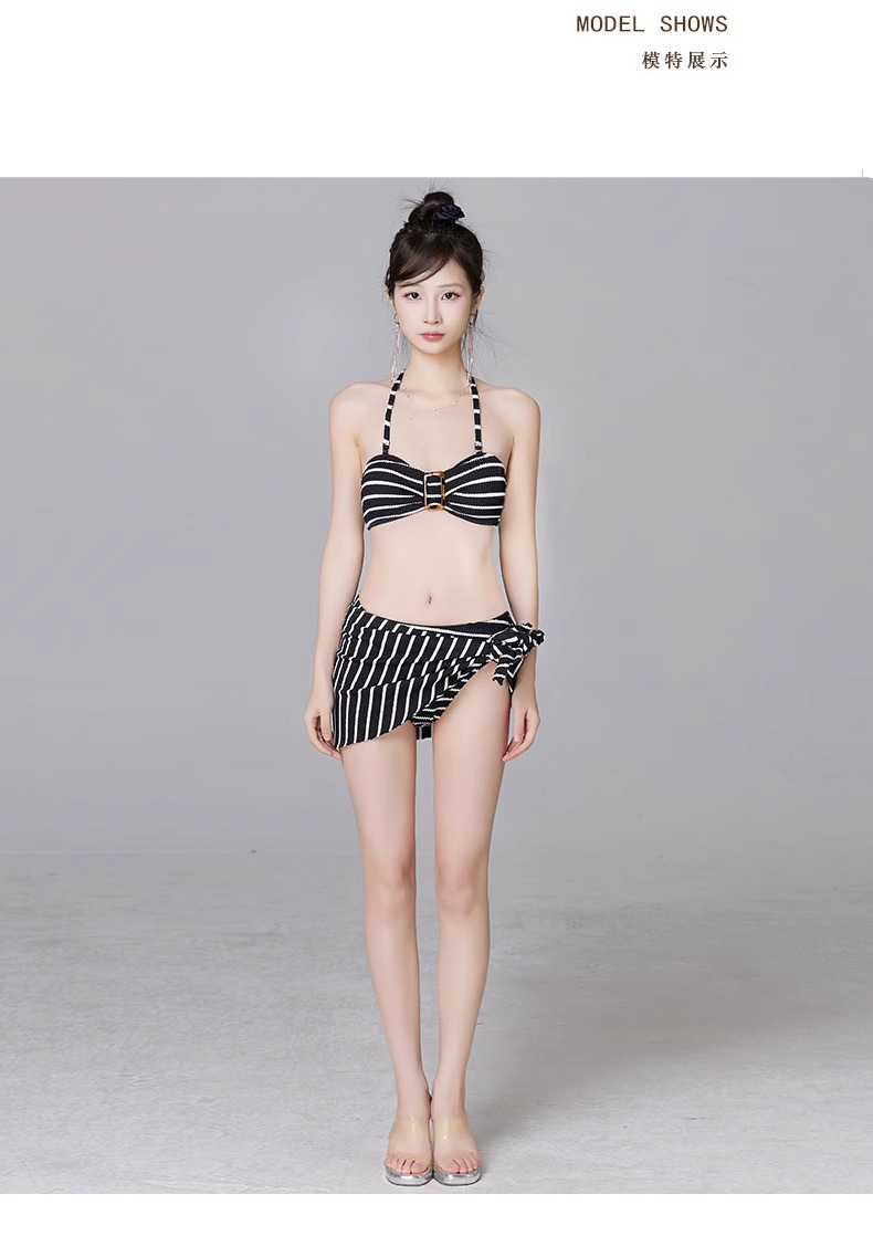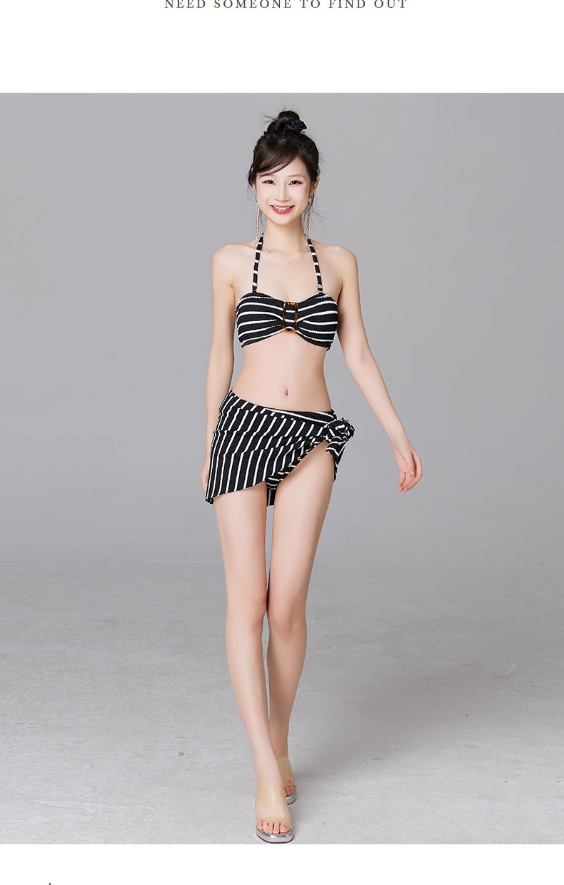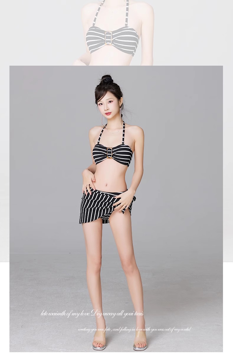 비키니 수영복 여자 2025 새로운 3 피스 세트 하이 엔드 유럽과 미국의 스트라이프 섹시한 작은 가슴 해변 홀리데이 스파스토어 가기