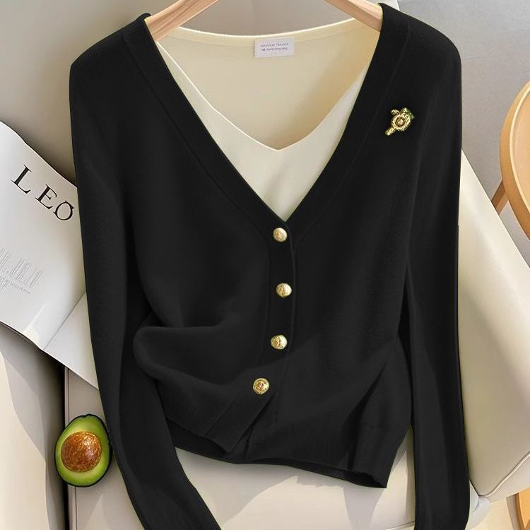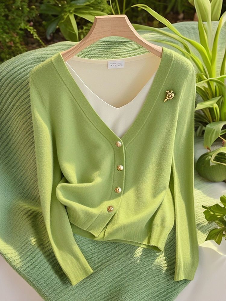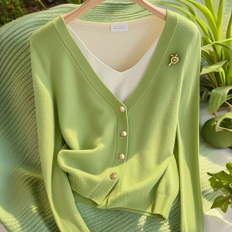 프랑스 스타일 샤넬 스타일 가짜 투피스 그린 니트 카디건 여성 독특한 슈퍼 니스 2025 새로운 내베이스 탑