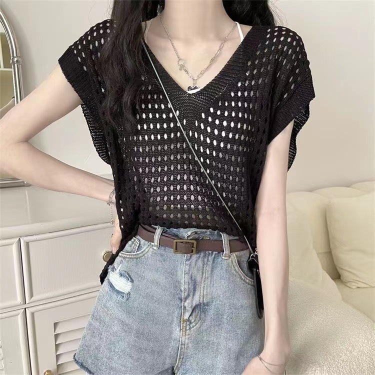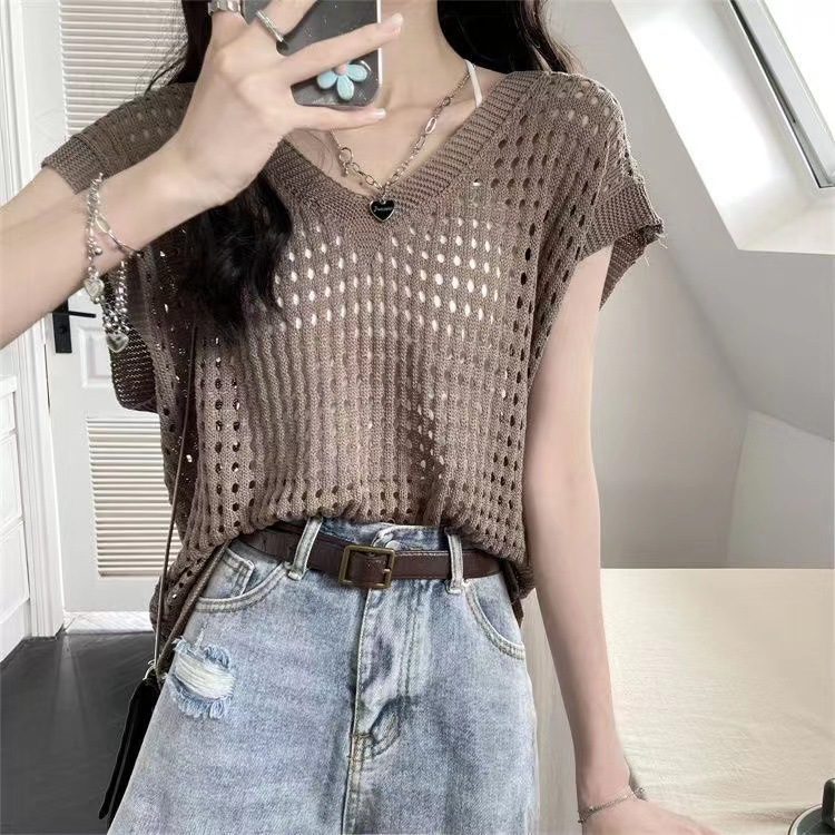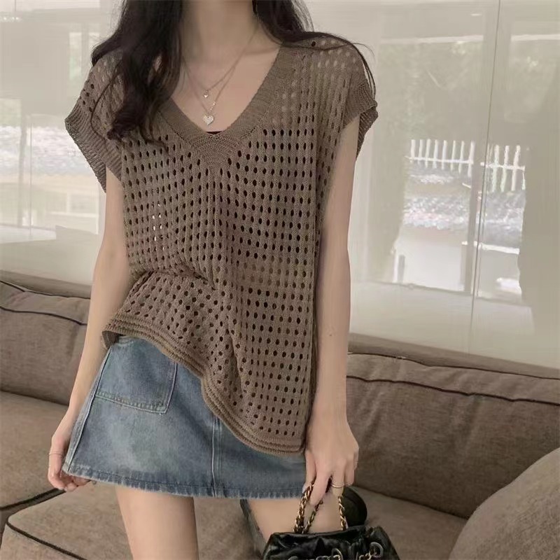 V-Neck 할로우 니트 조끼 여성용 외부 착용 유행 블라우스 얇은 여름 여성복 디자인 감각 느슨한 슬리밍 탑