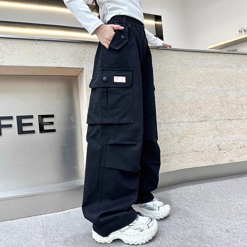 여아 작업복 스타일 캐주얼 바지 도매, 봄 가을 신상 중대형 아동용 트렌디 스포츠 바지, 아동용 루즈핏 롱 팬츠스토어 가기