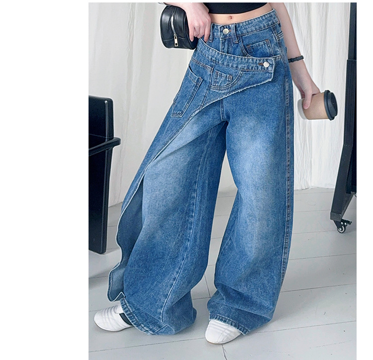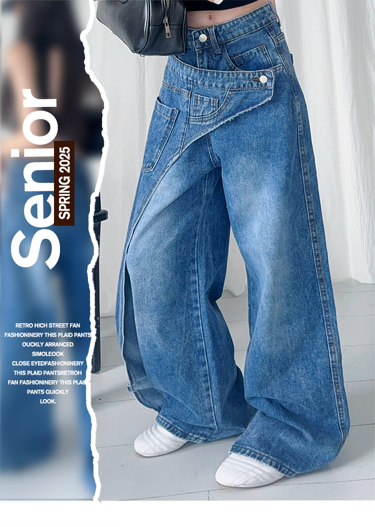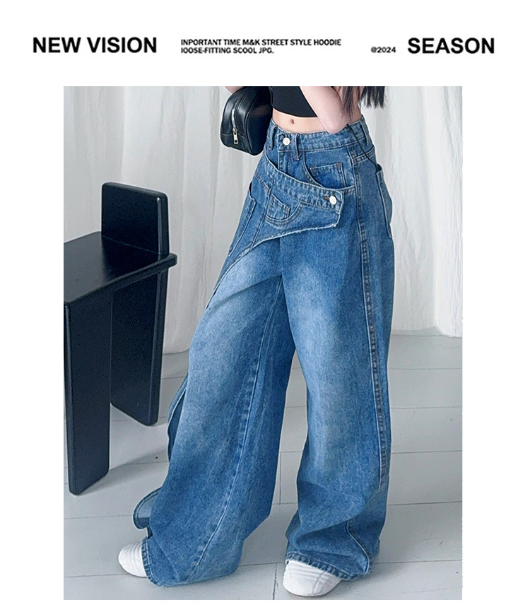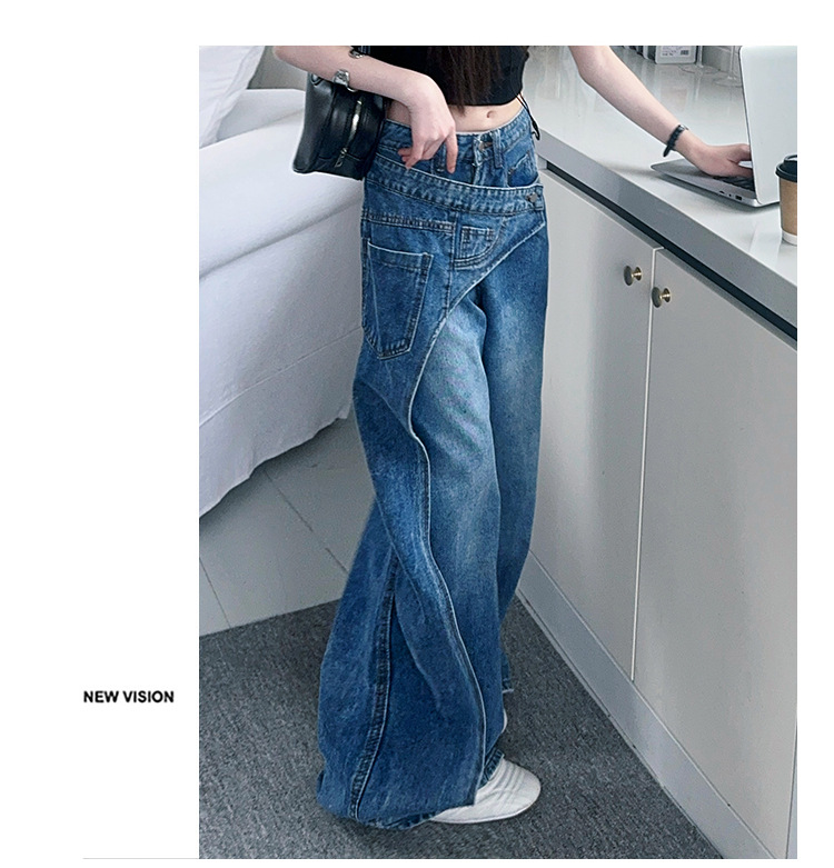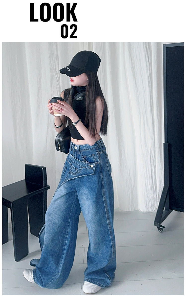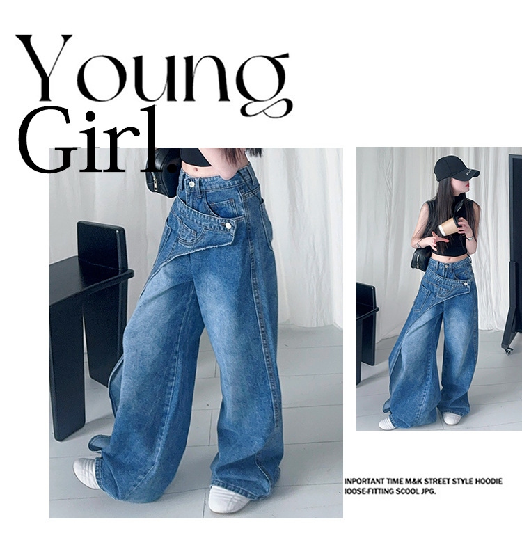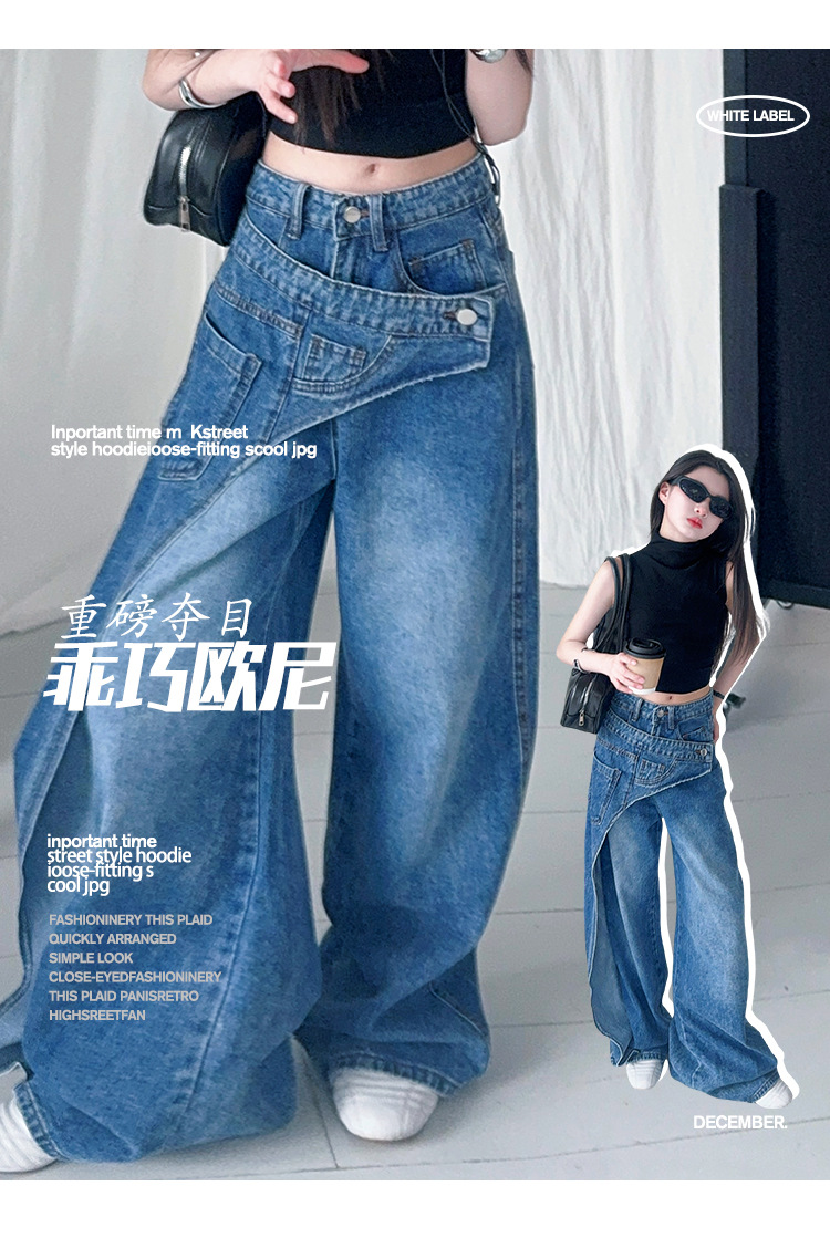 소녀 디자인 센스 허리 세척 스티칭 청바지 봄과 여름 새로운 높은 허리 슬리밍 올매치 스트레이트 와이드 레그 트렌디 바지