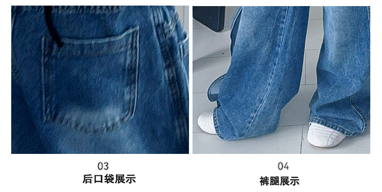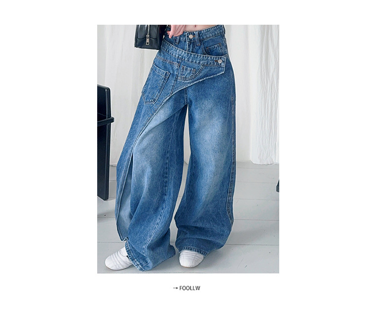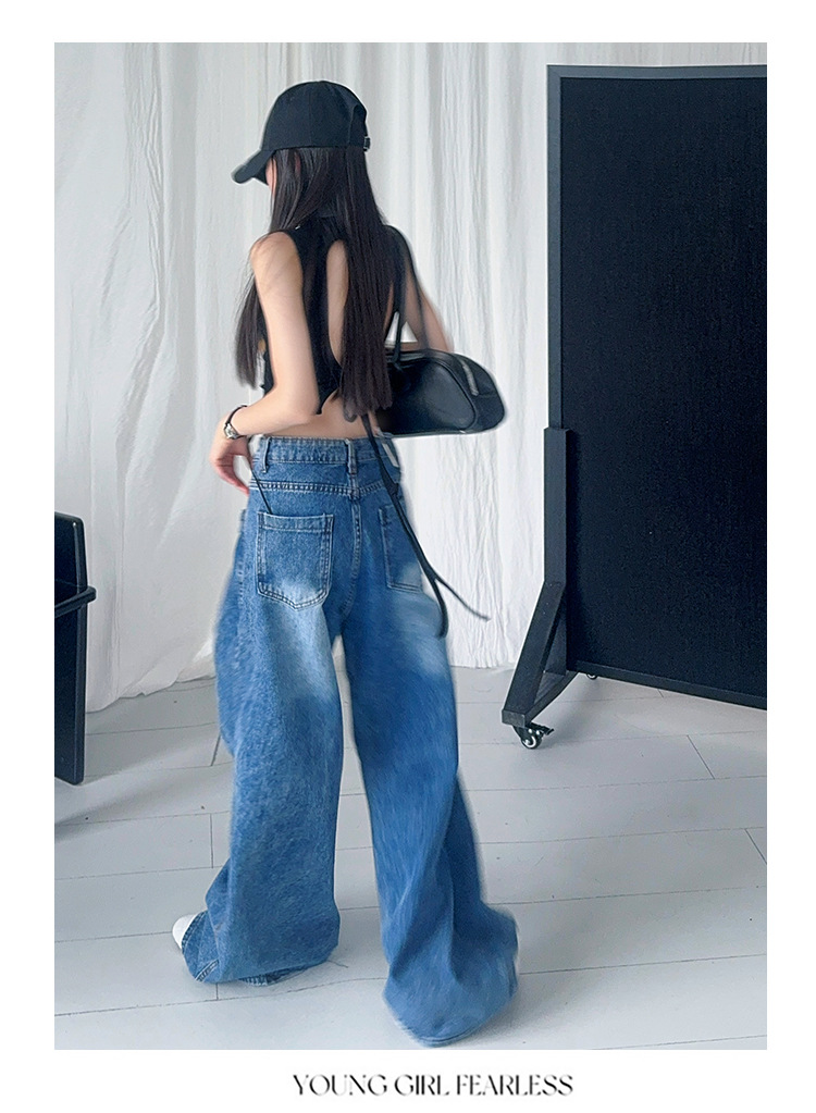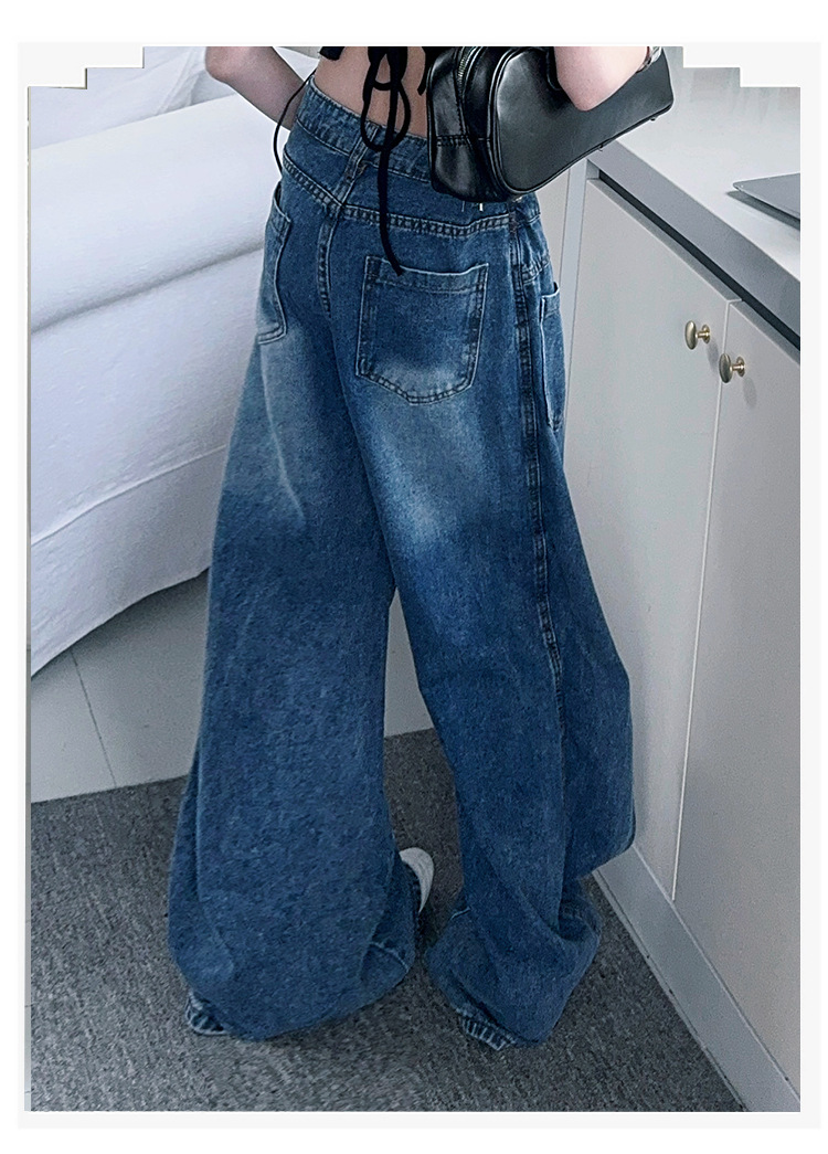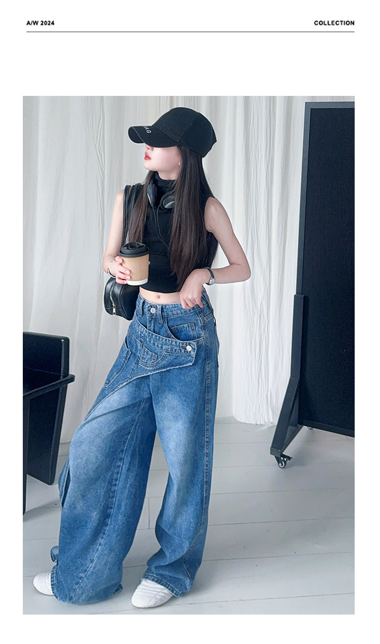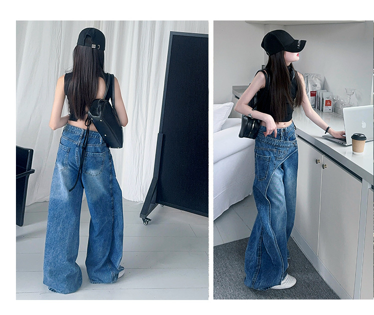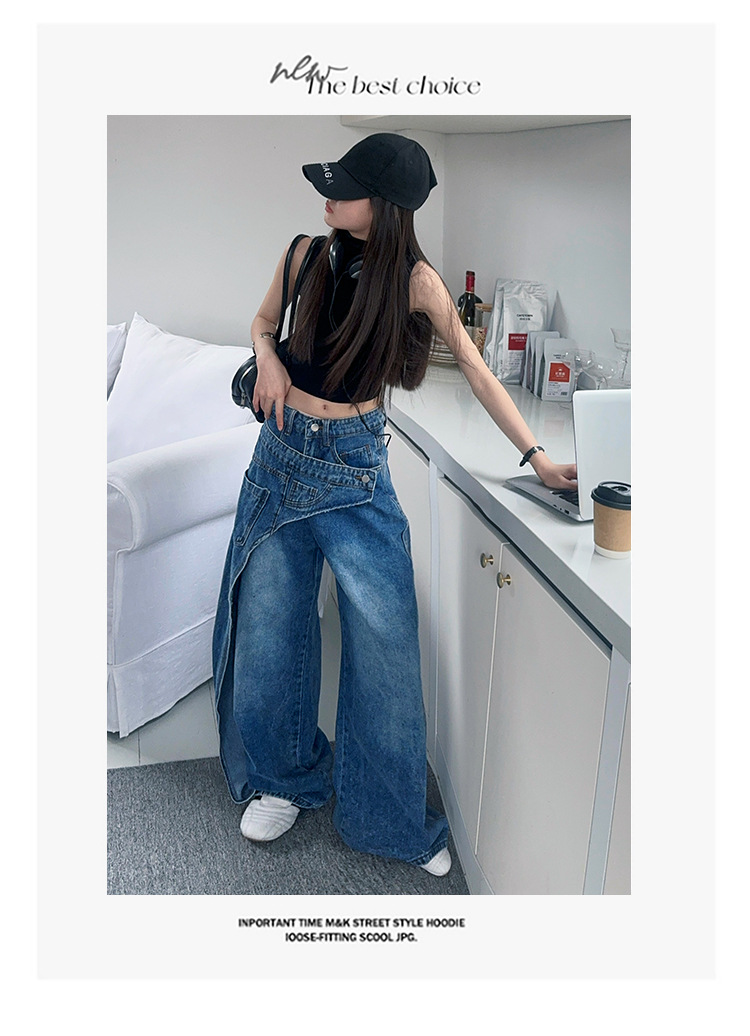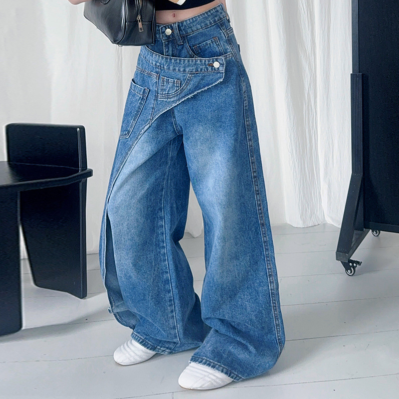 소녀 디자인 센스 허리 세척 스티칭 청바지 봄과 여름 새로운 높은 허리 슬리밍 올매치 스트레이트 와이드 레그 트렌디 바지스토어 가기