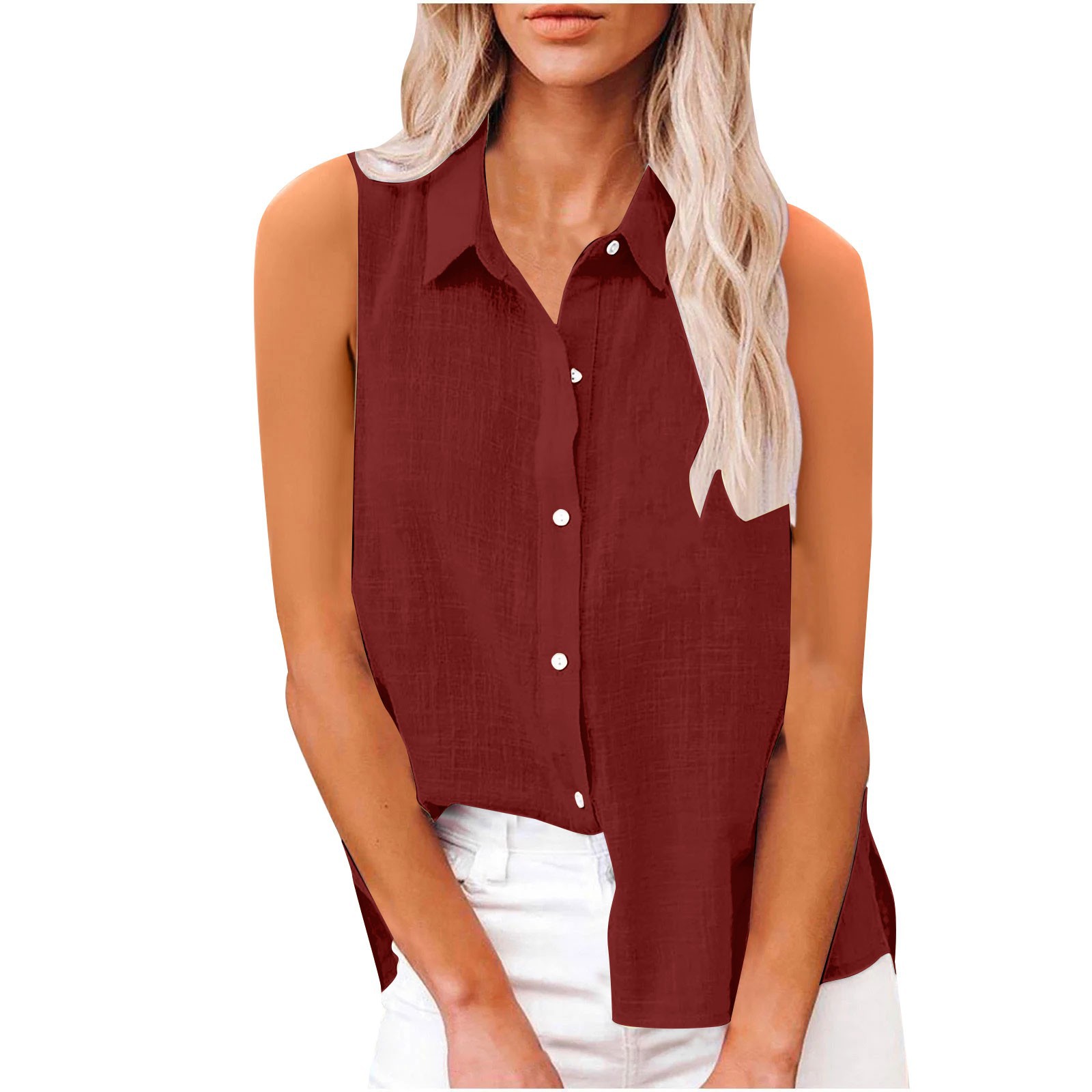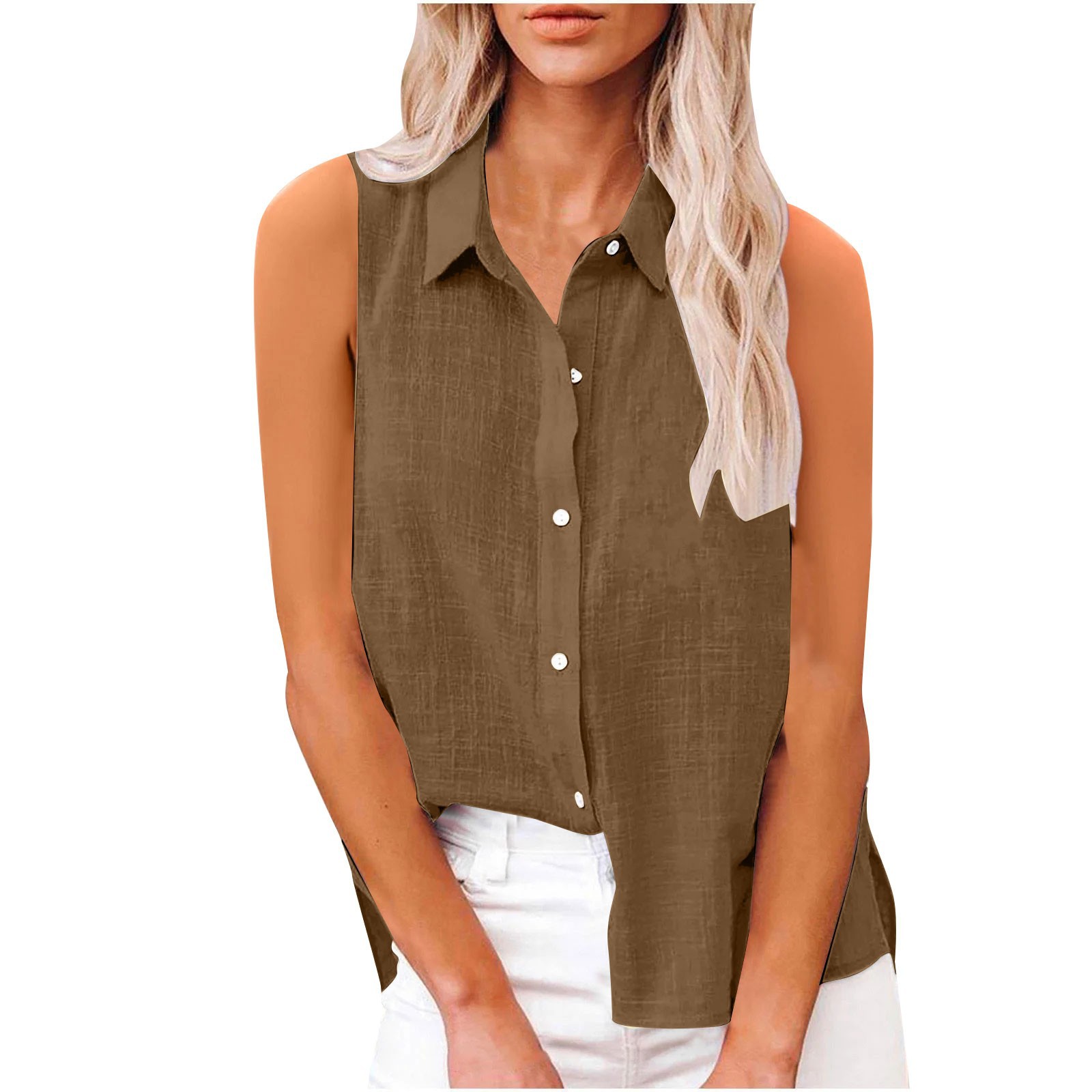 아마존 국경 유럽 및 미국 여름 새로운 단색 단일 브레스트 옷깃 셔츠 코튼 린넨 민소매 느슨한 여성용 탑스토어 가기