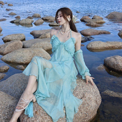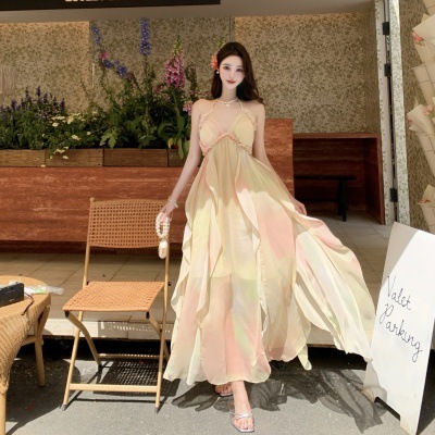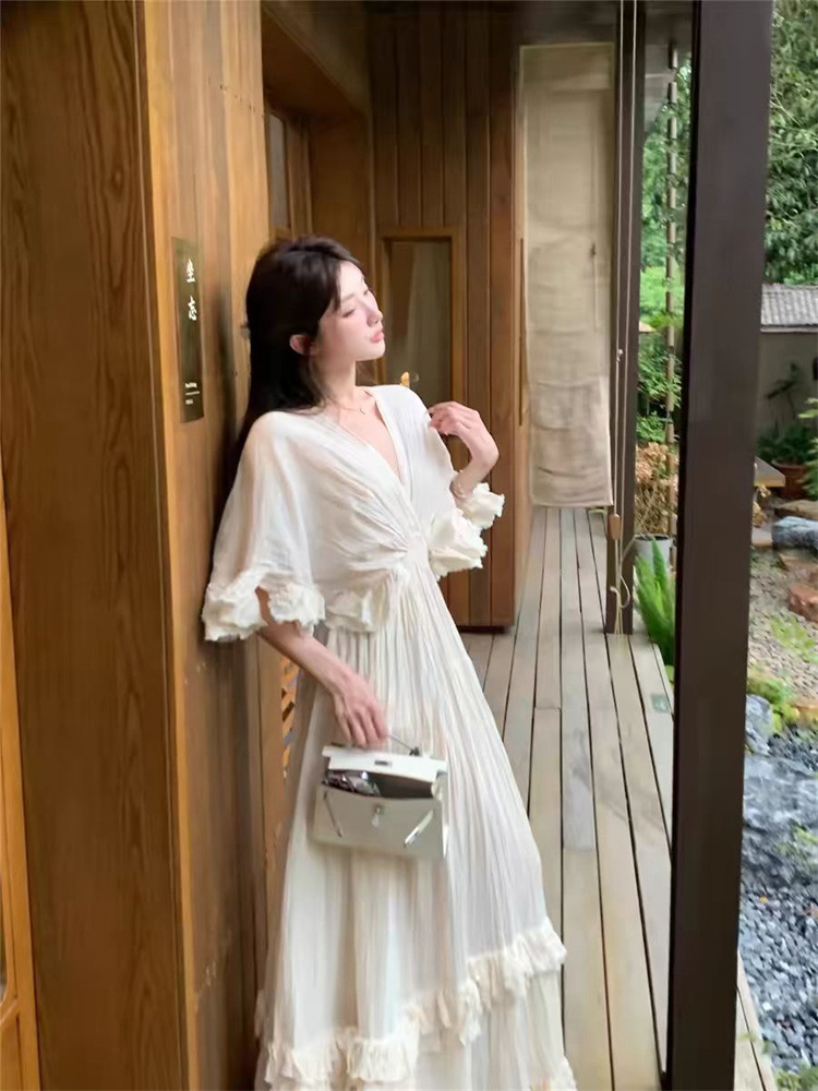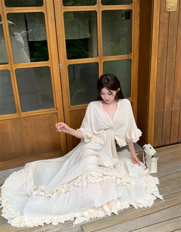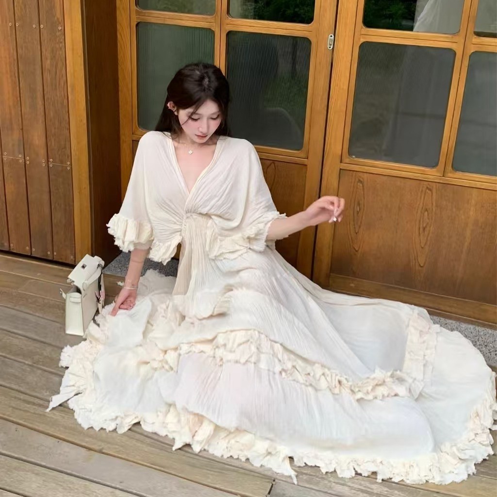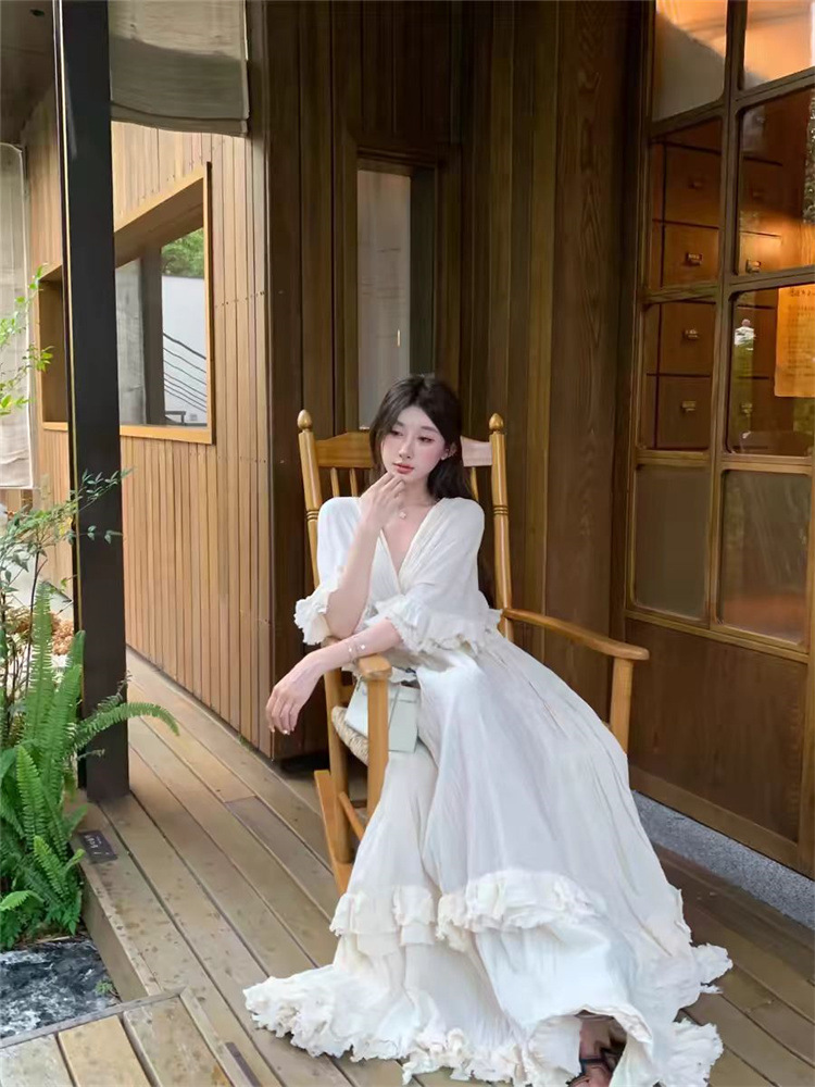 프랑스 스타일의 부드러운 V 넥 러플 원피스 여성 여름 슈퍼 페어리 우아한 하이 엔드 해변 휴가 롱 원피스